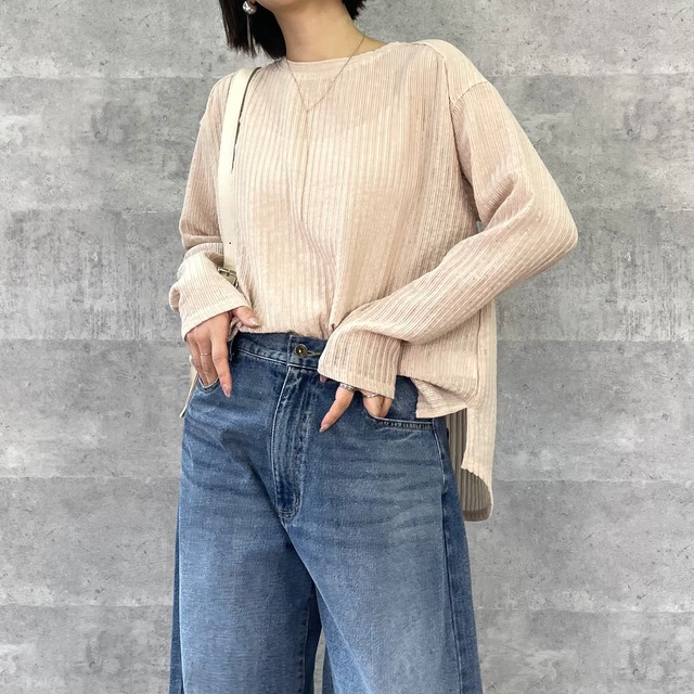 少し透け感のあるジャガードストライプカットソー 1枚で着用していてもジャケットやトップスのインナーとしても着用して頂けます Size(Free) 身丈 F62cm B67cm 身幅 52cm 裾幅 60cm 肩幅 50cm 裄丈 76cm 袖幅 21cm AH 21cm モデル162cm Quality (本体) 綿 50% ポリエステル 45% ポリウレタン 5% 洗濯:手洗い可 伸縮性:なし 光沢:なし 厚み:うすい 透け感:若干あり(ホワイト) 裏地:なし ポケット:なし