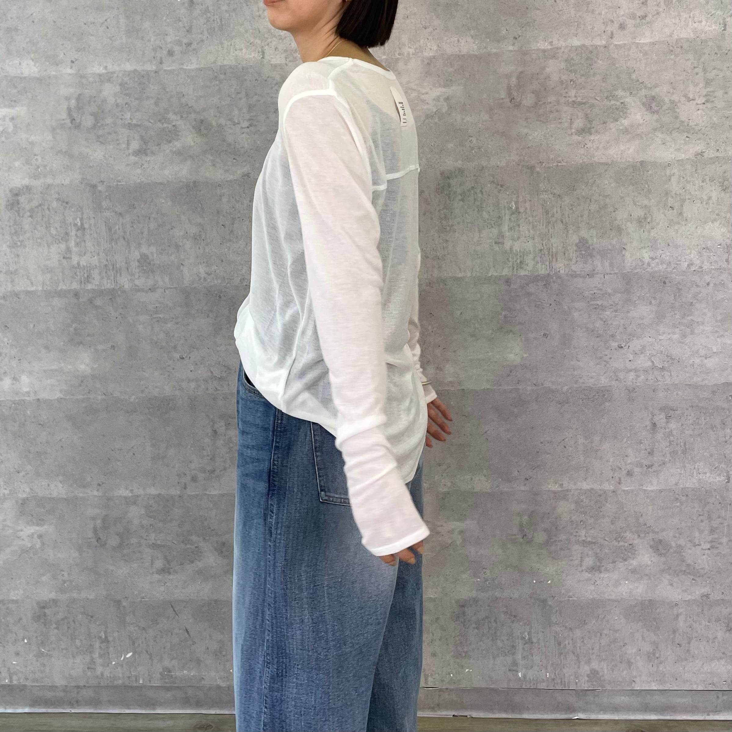 シアーな素材感、ラウンドヘム、長めの袖丈などシンプルながらも抜け感のあるデザインで