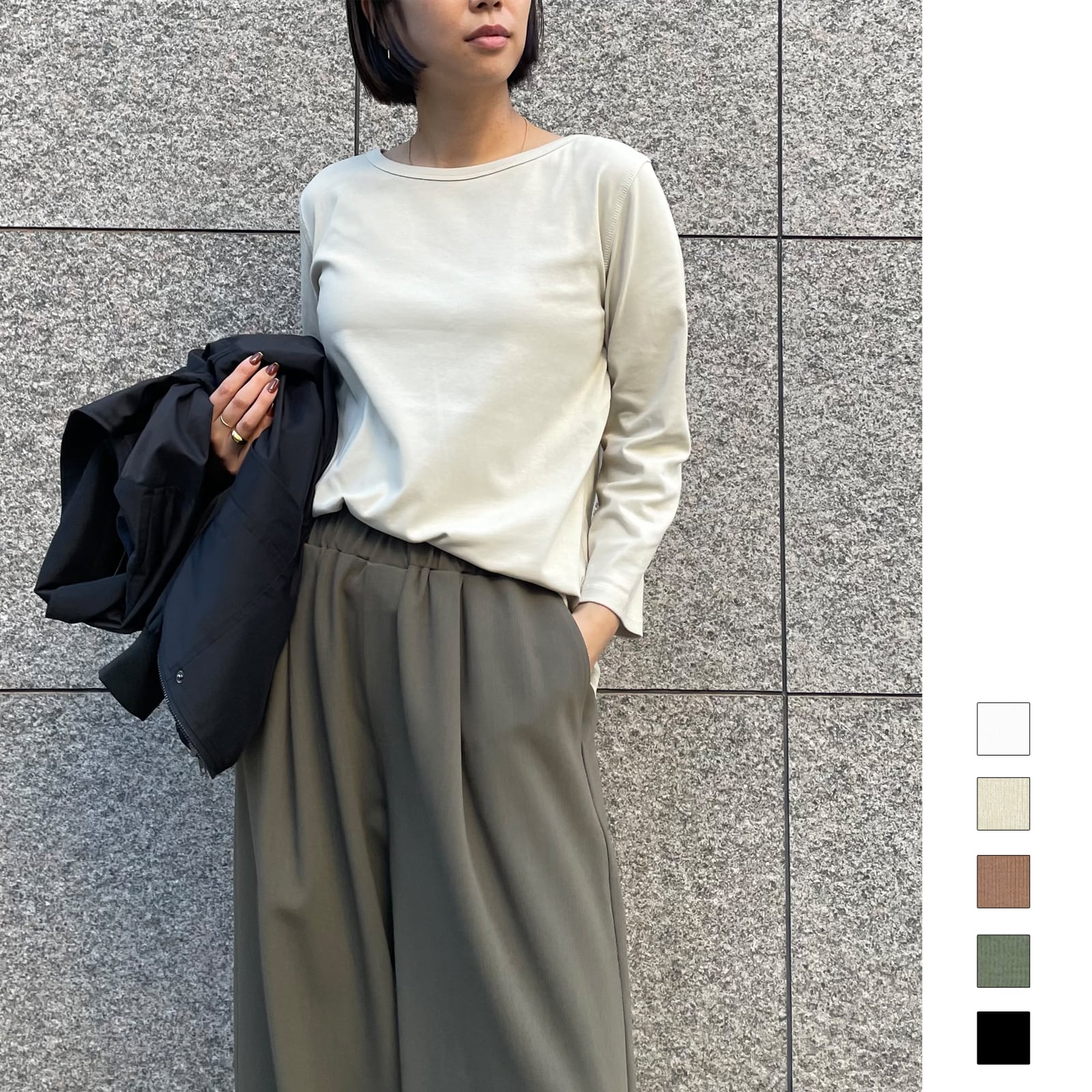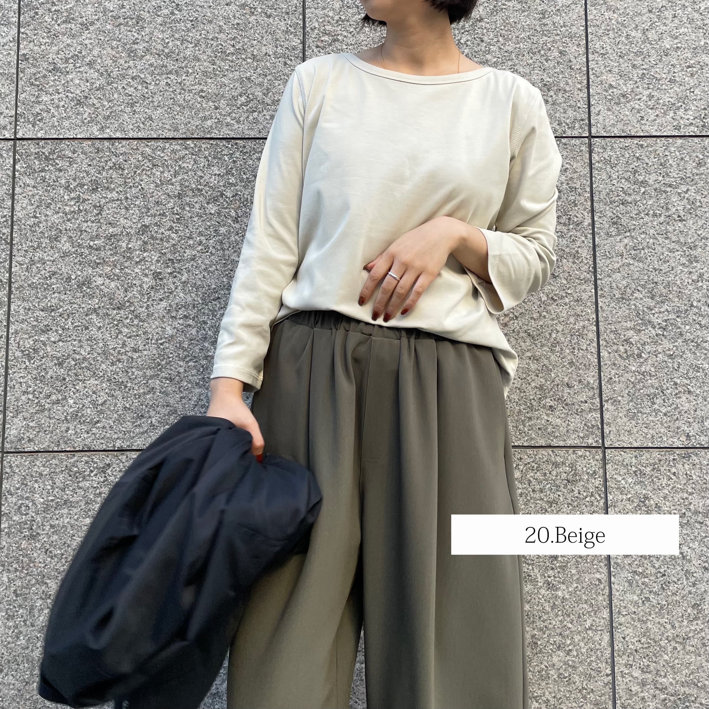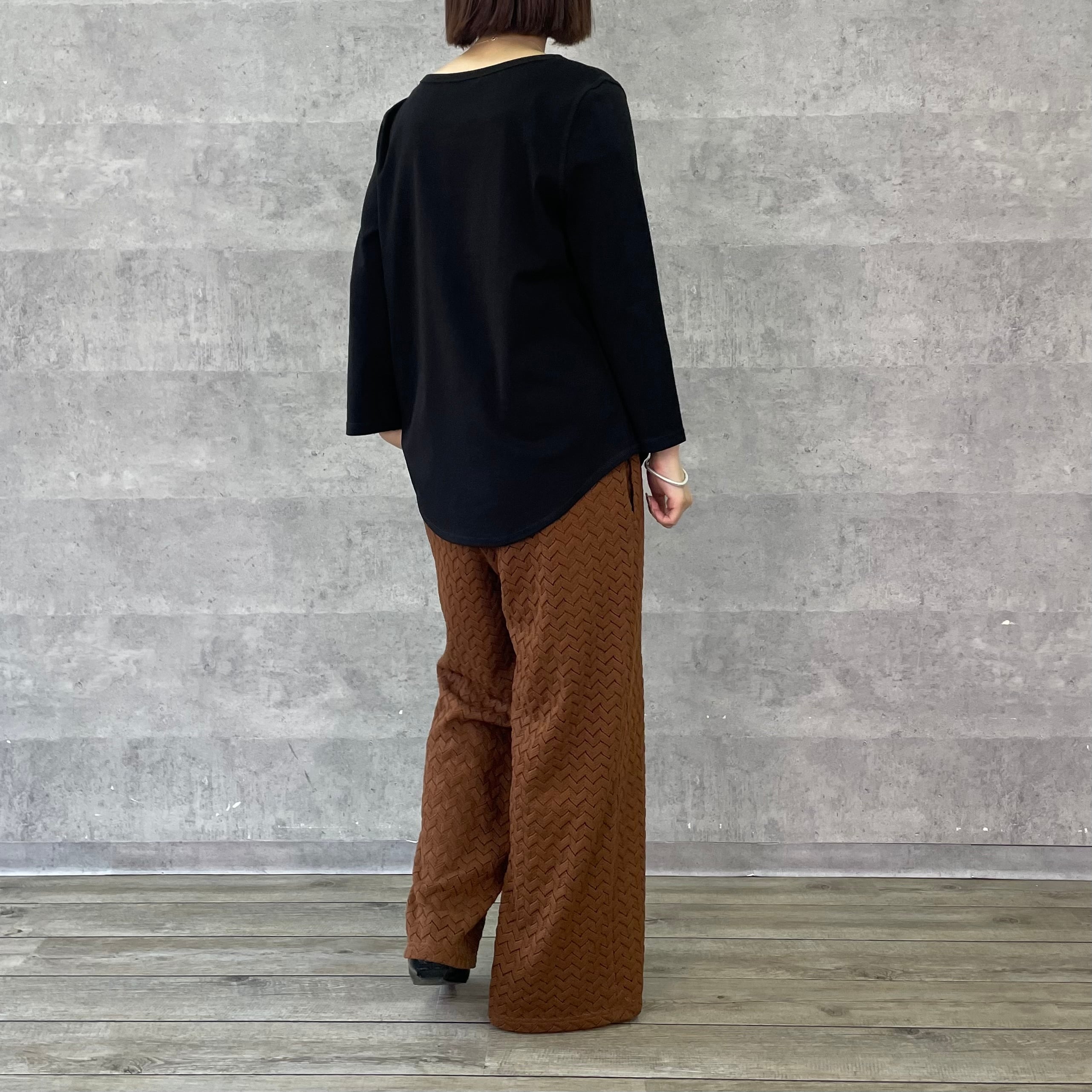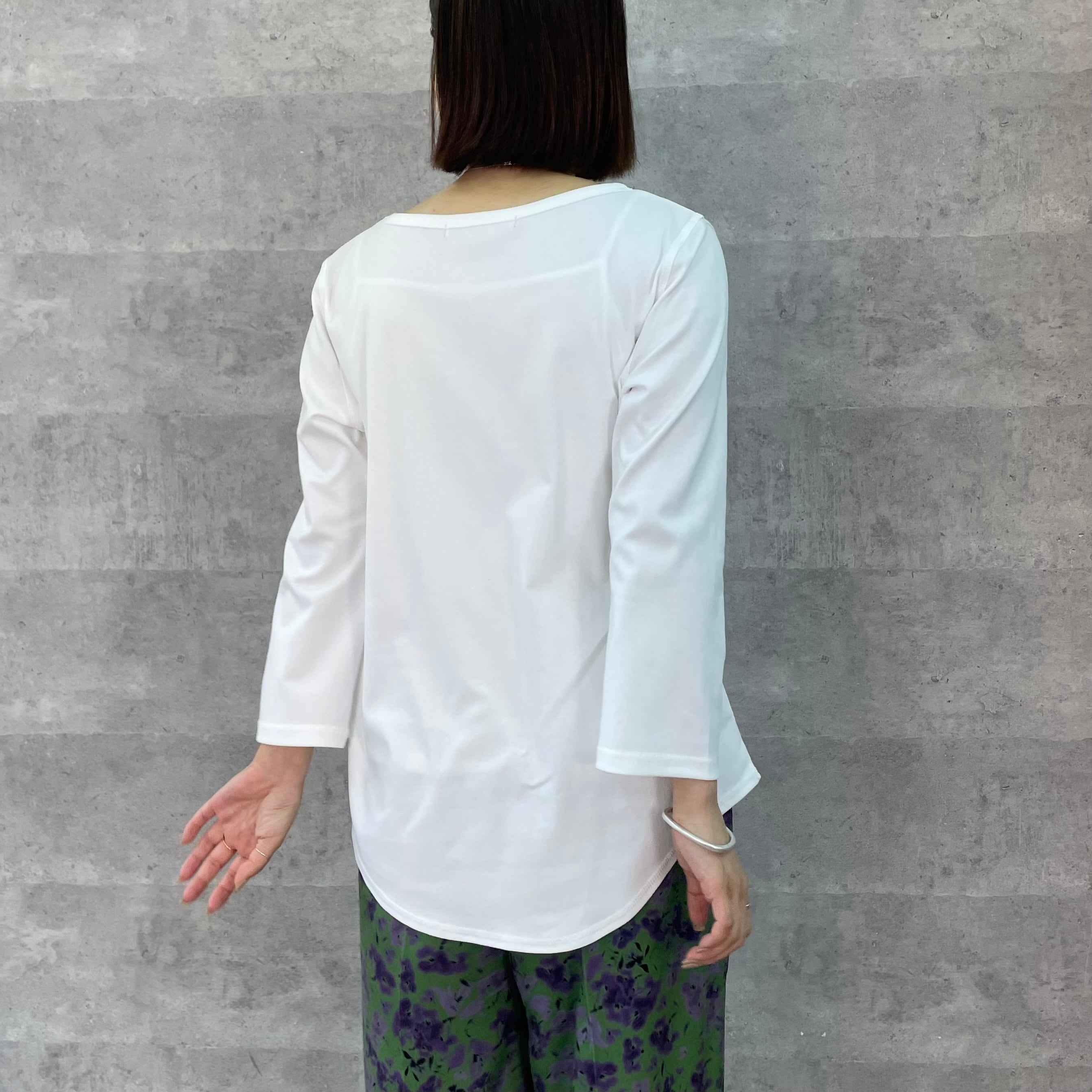 伸縮性に優れたフライスカットソーのシンプルな8分袖Tシャツ。ネック回りは女性らしく広めに、袖はややゆとりを持たせて、裾はカーブデザインにし、シンプルながら華奢見えのディティールが詰まったこだわりの1枚です。