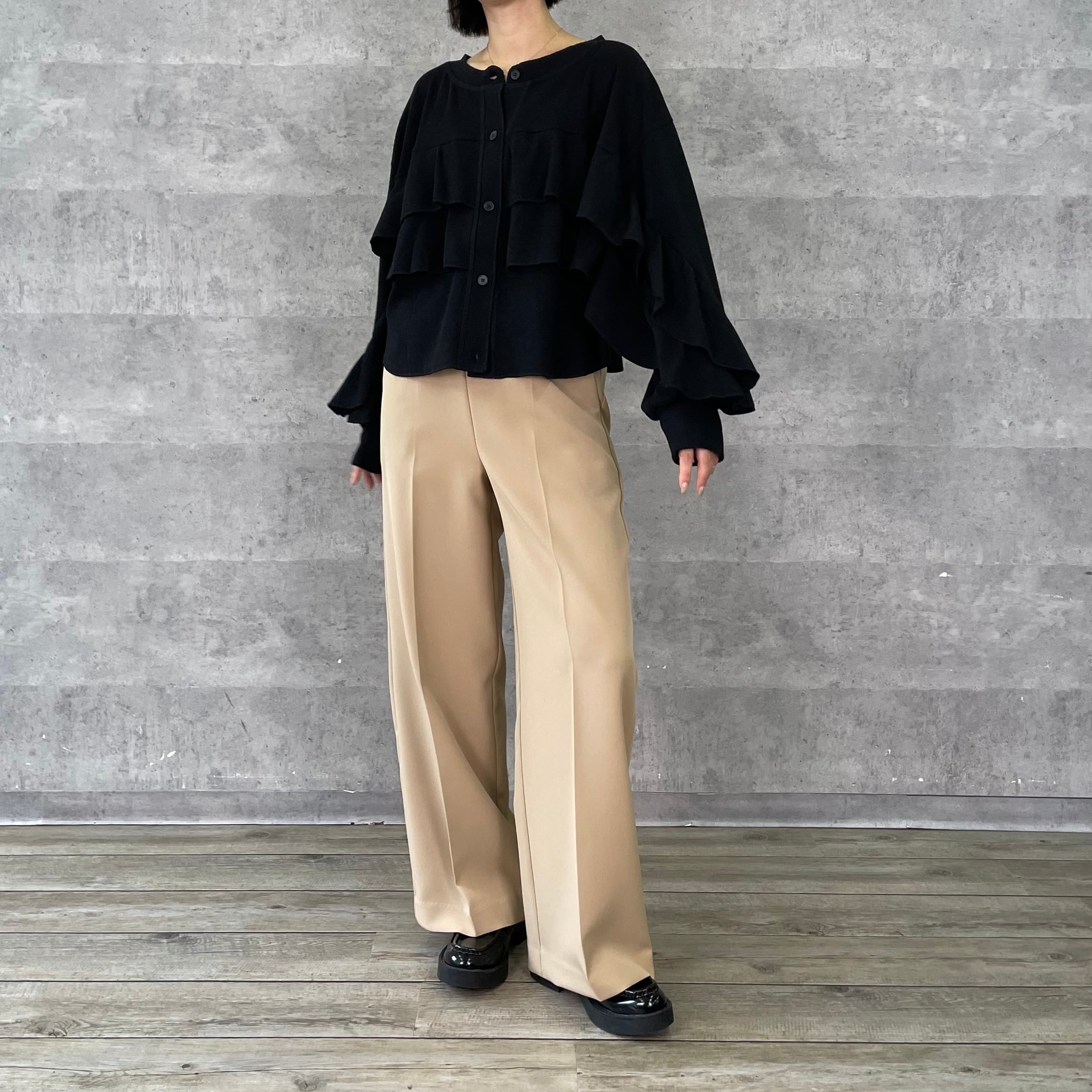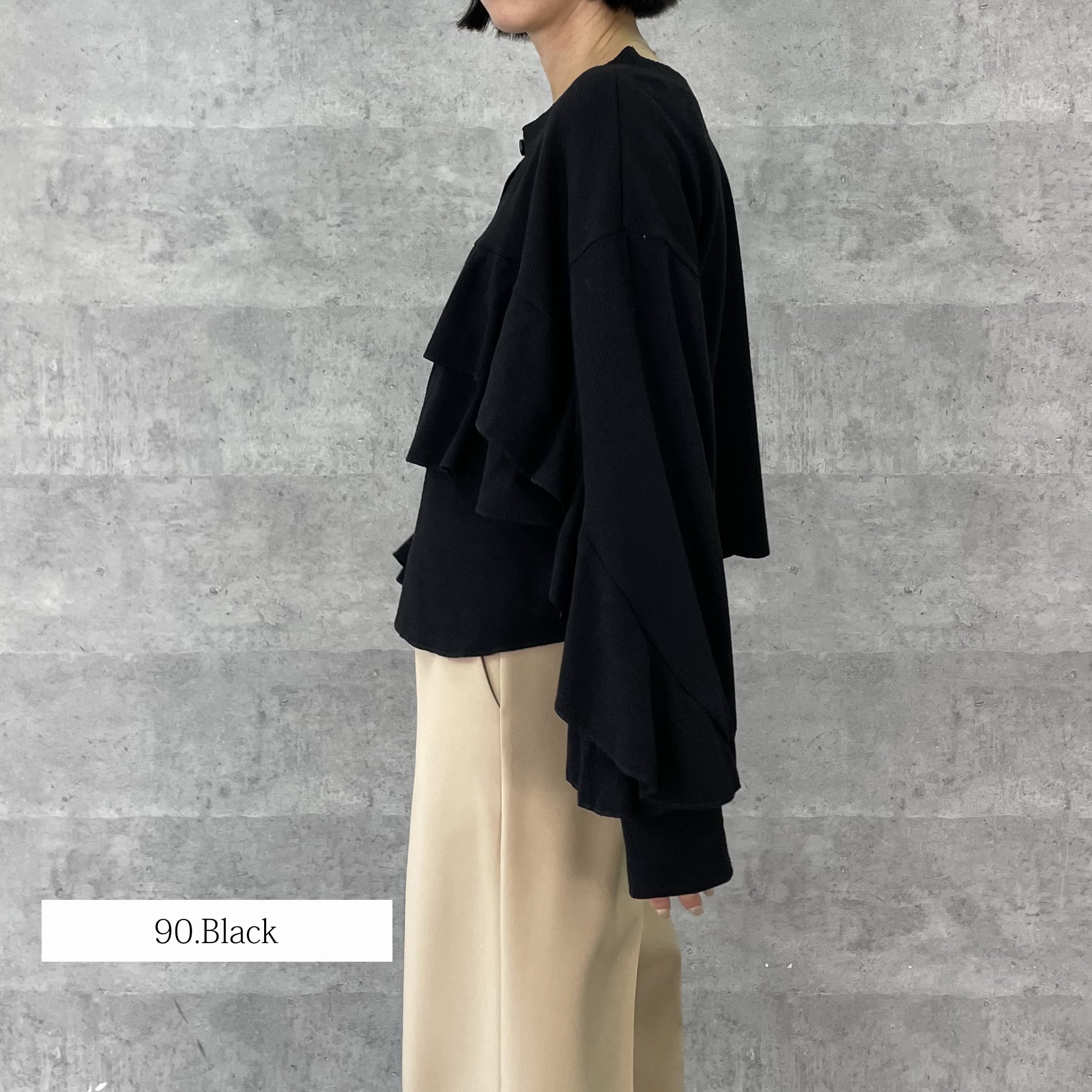 たっぷりとしたフリルが1枚で着映えするワッフルカットソー素材のカーディガン。
