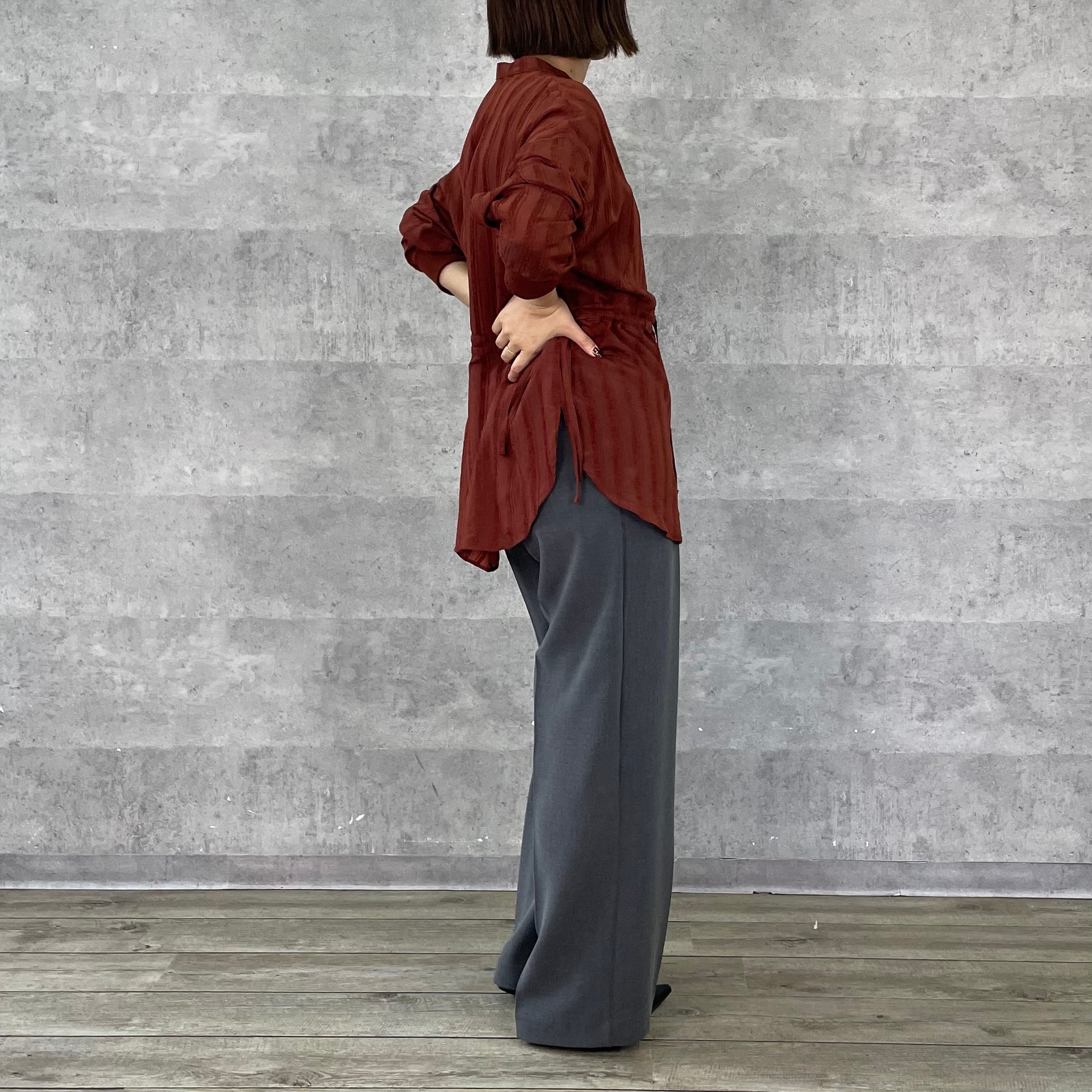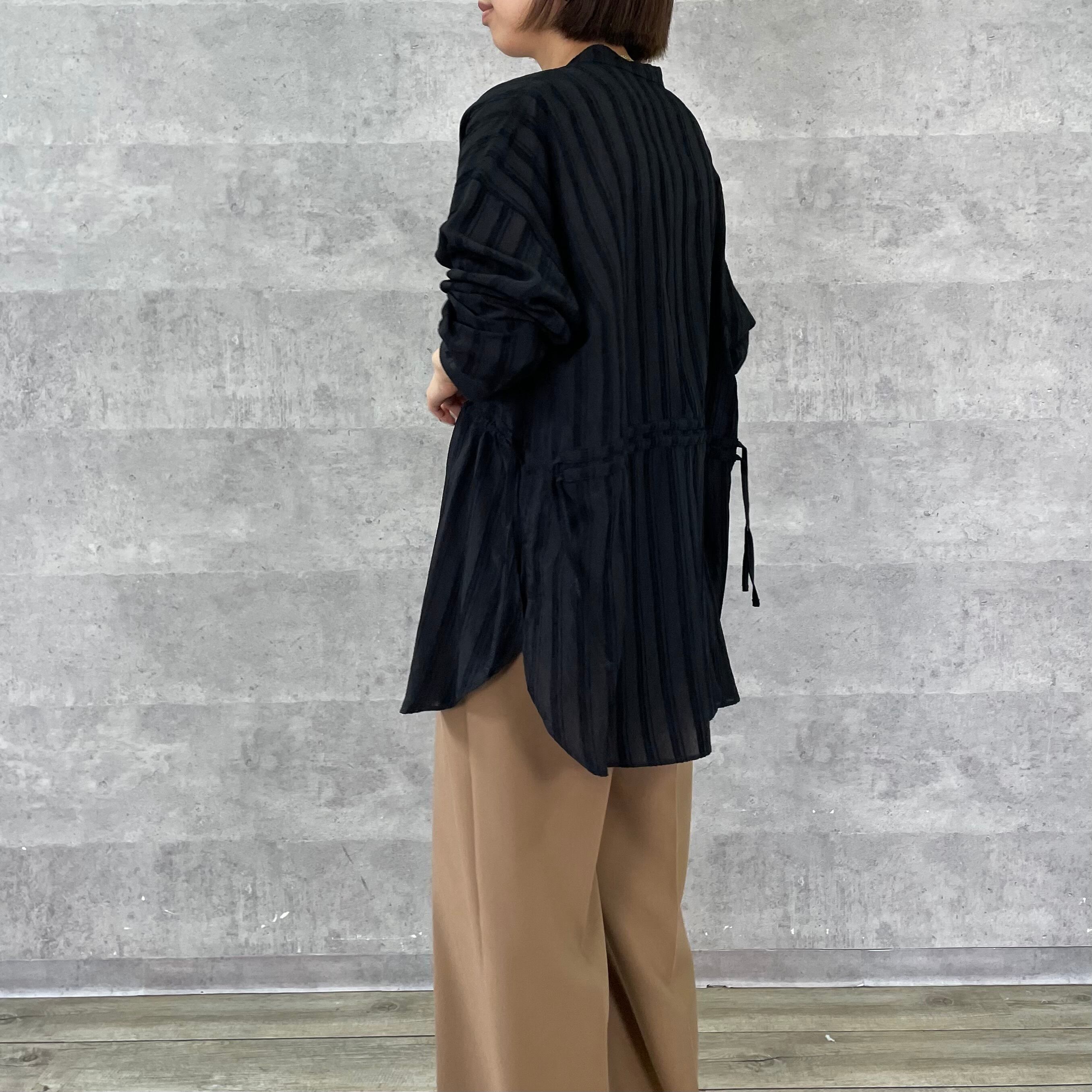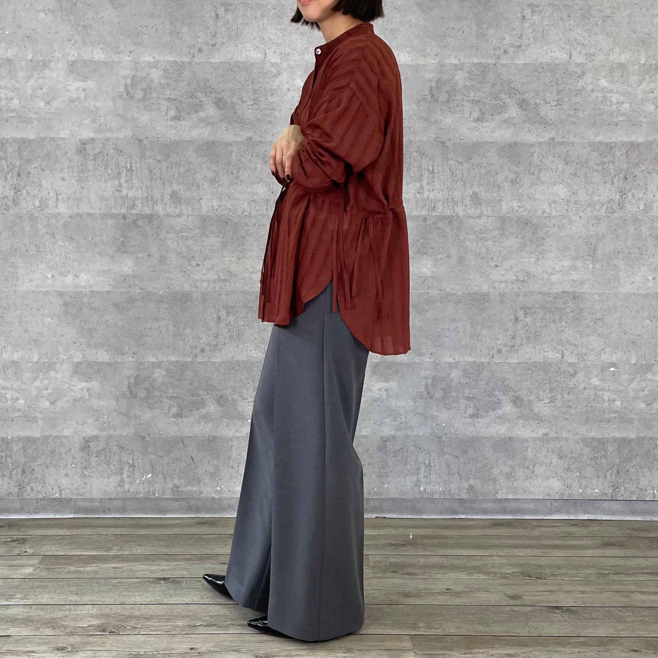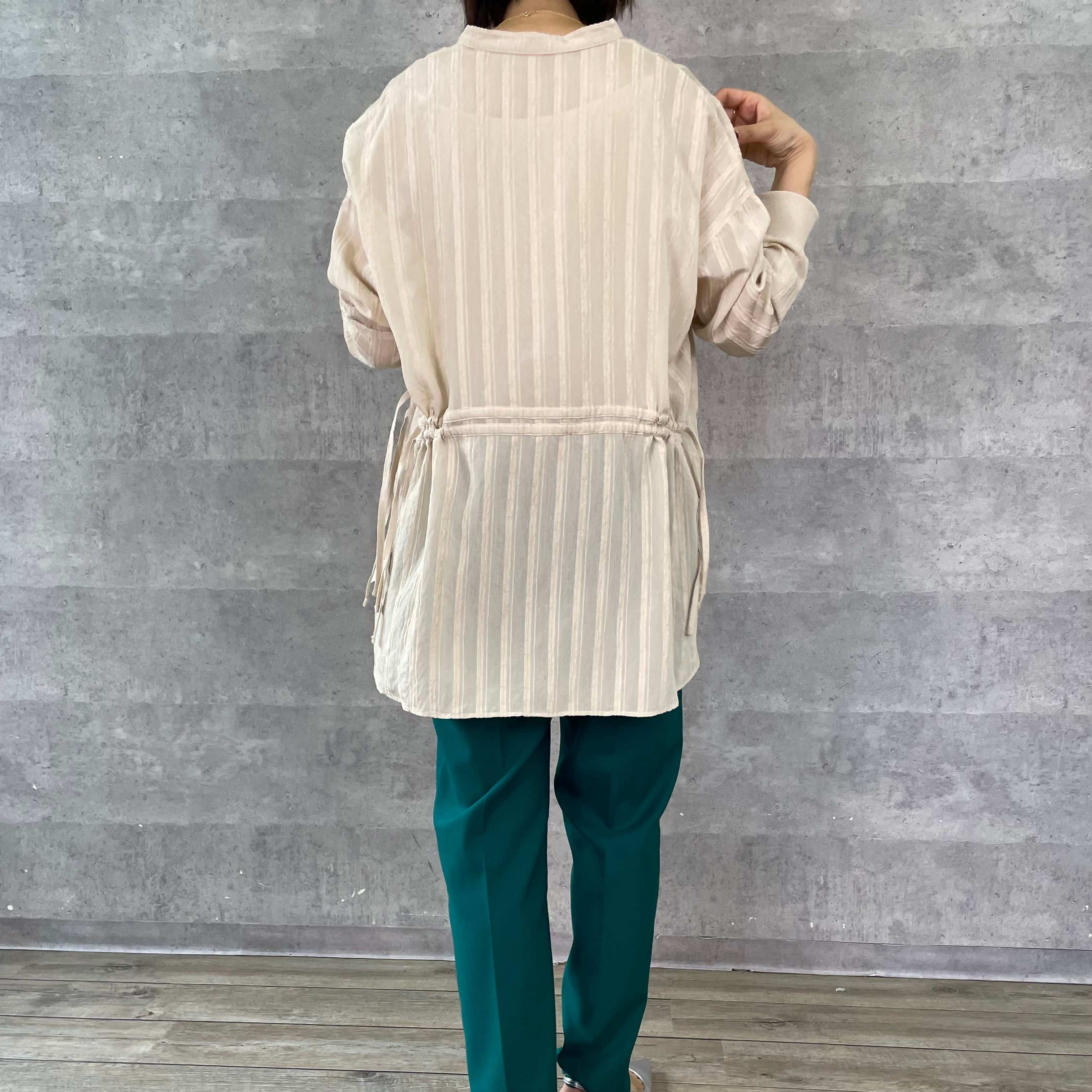ウエストの共紐でギャザーを寄せて着用するブラウス