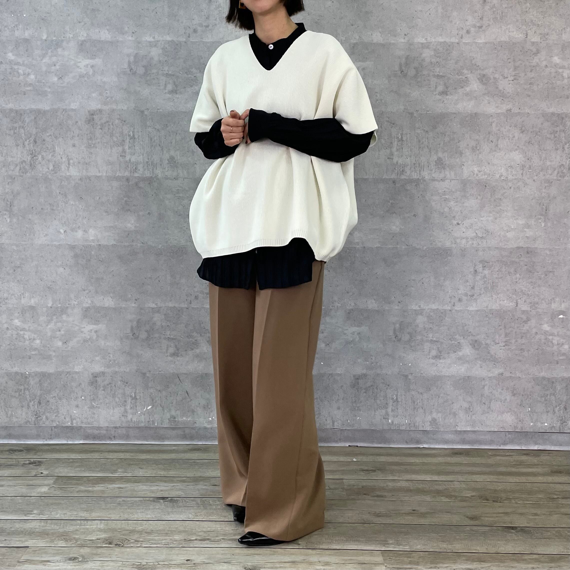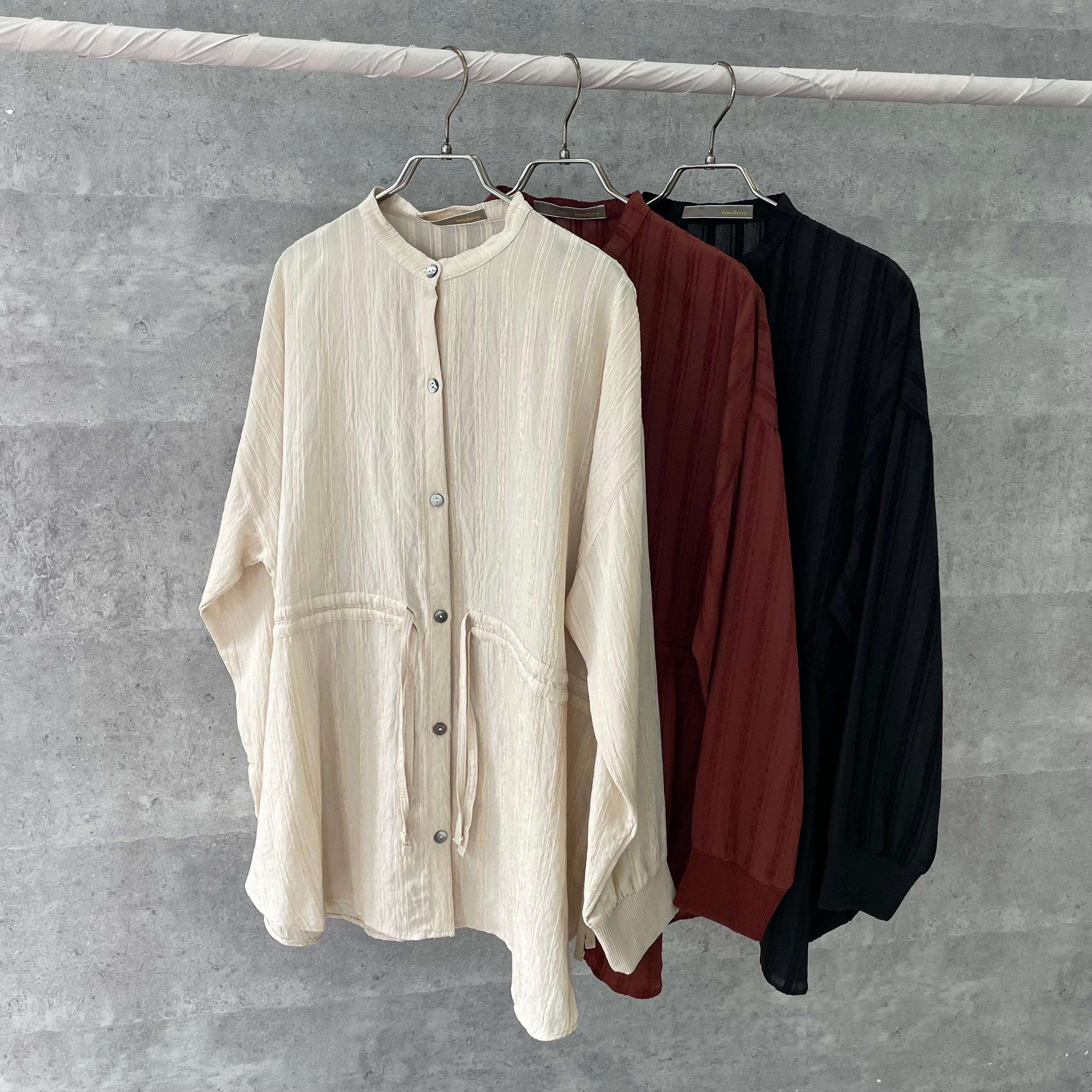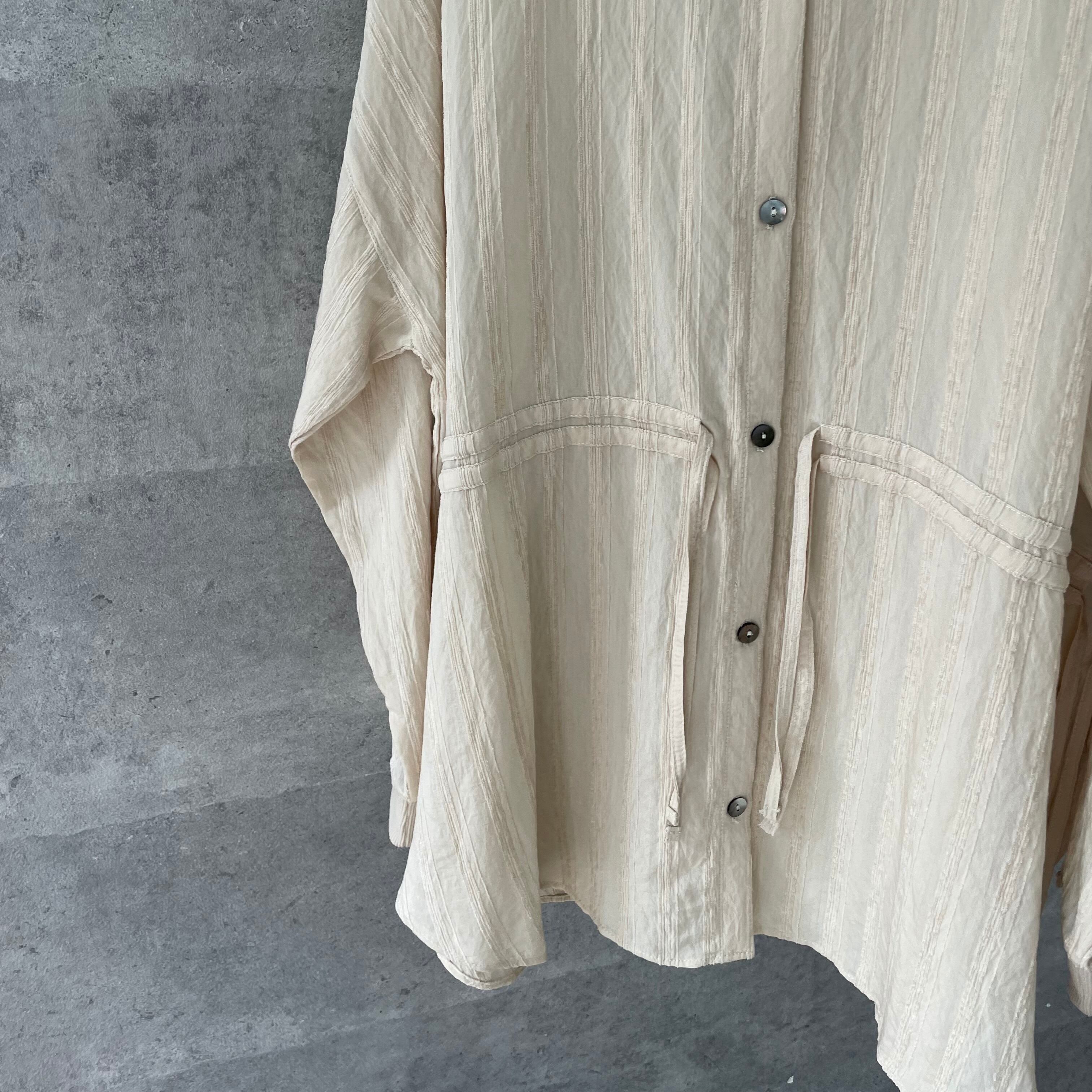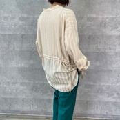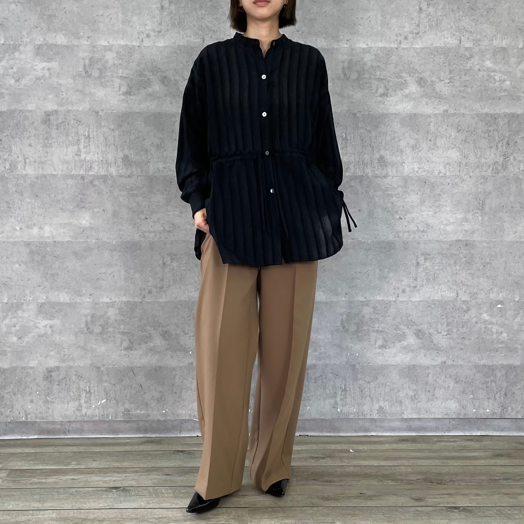 ウエストの共紐でギャザーを寄せて着用するブラウス