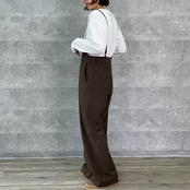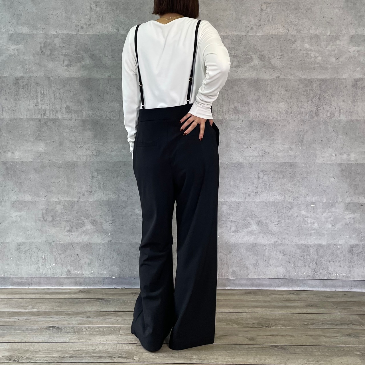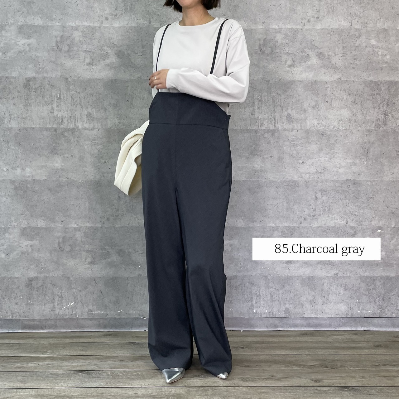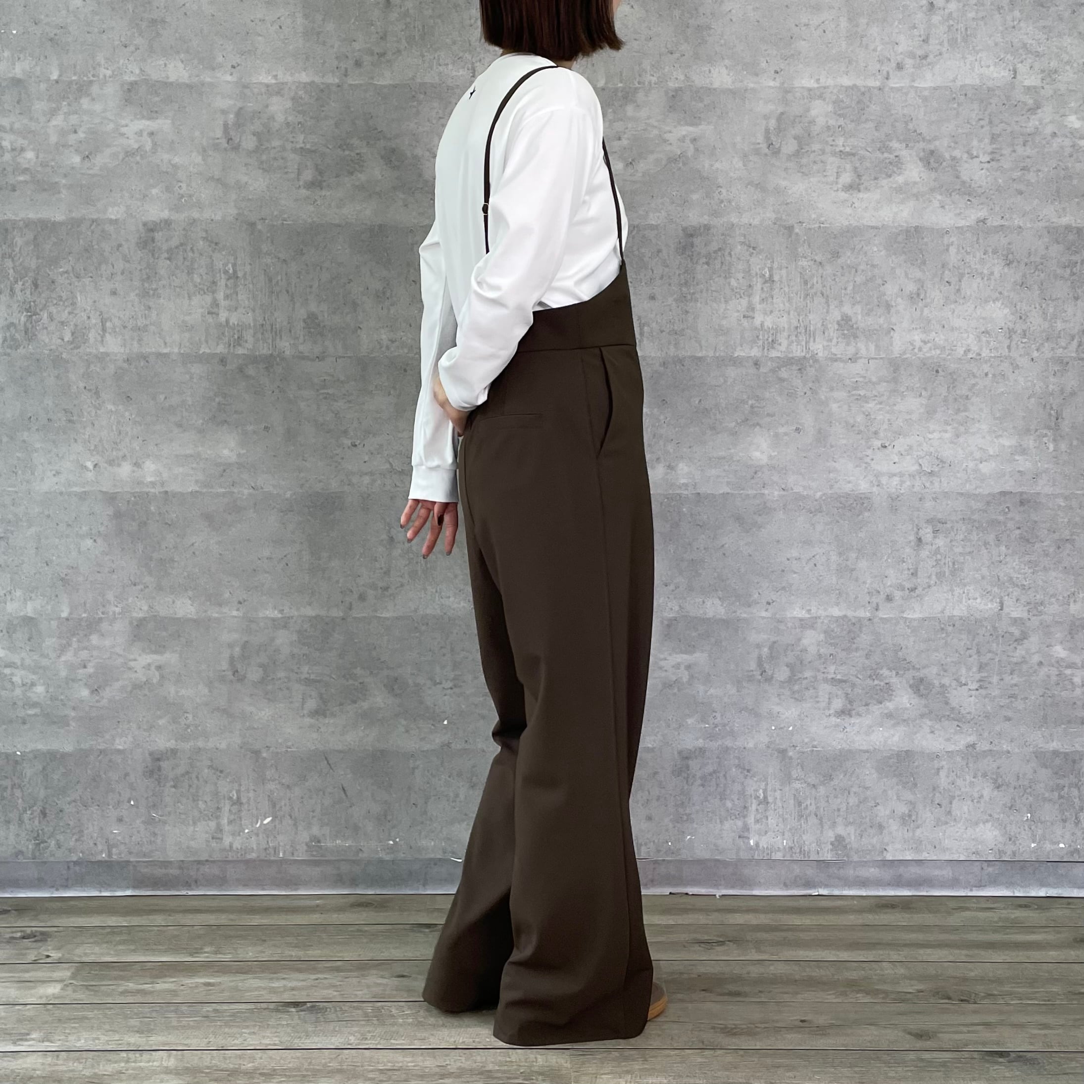 バイヤス使いのフレアシルエットが美脚見えのサロペット。
