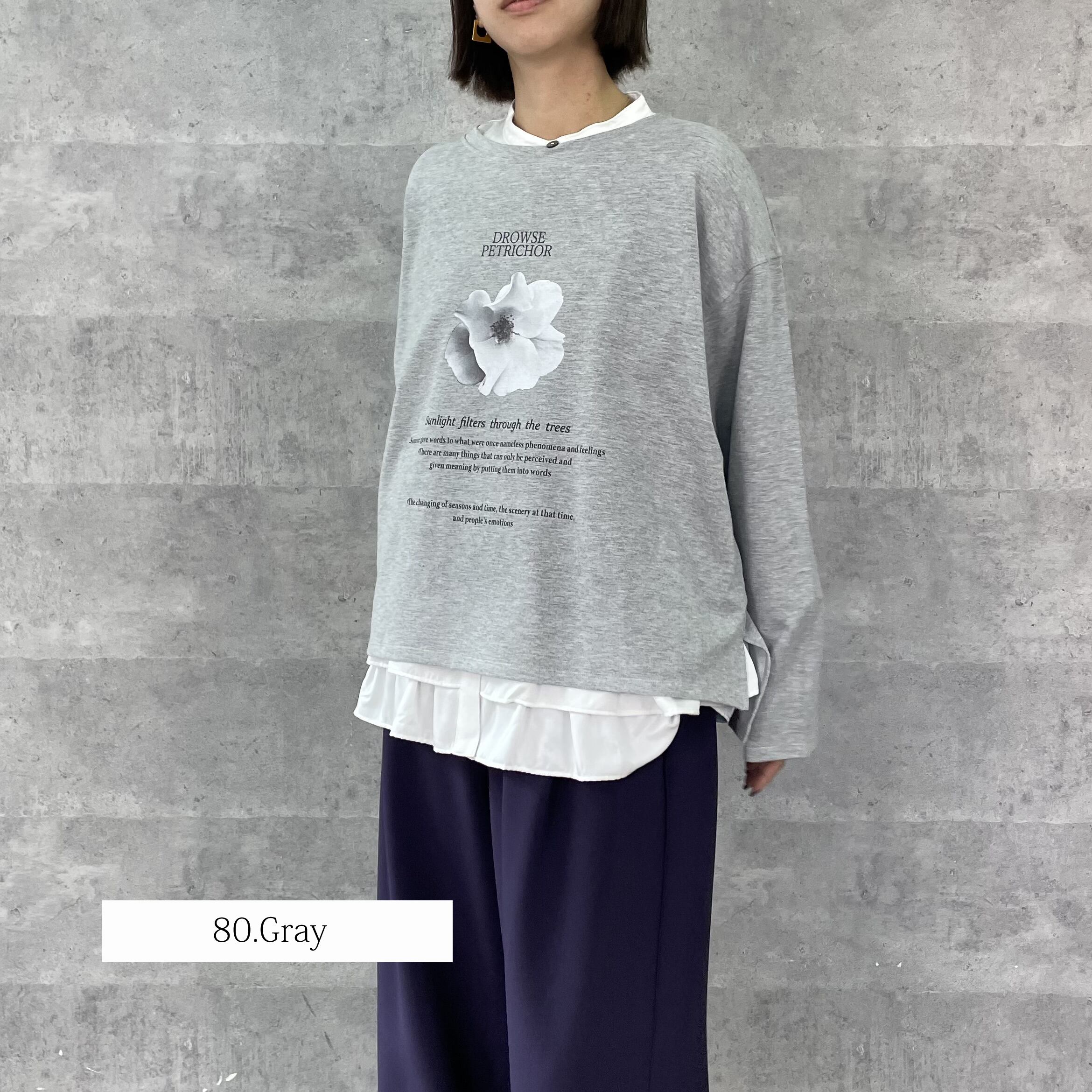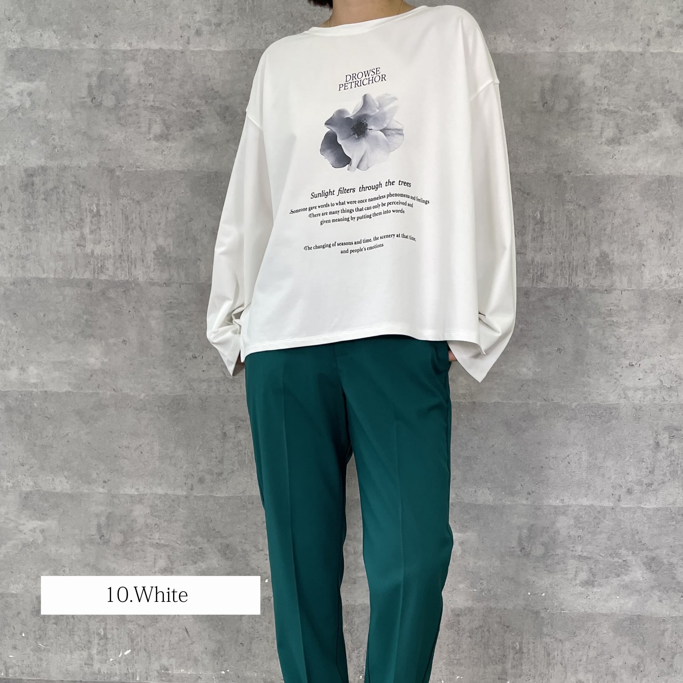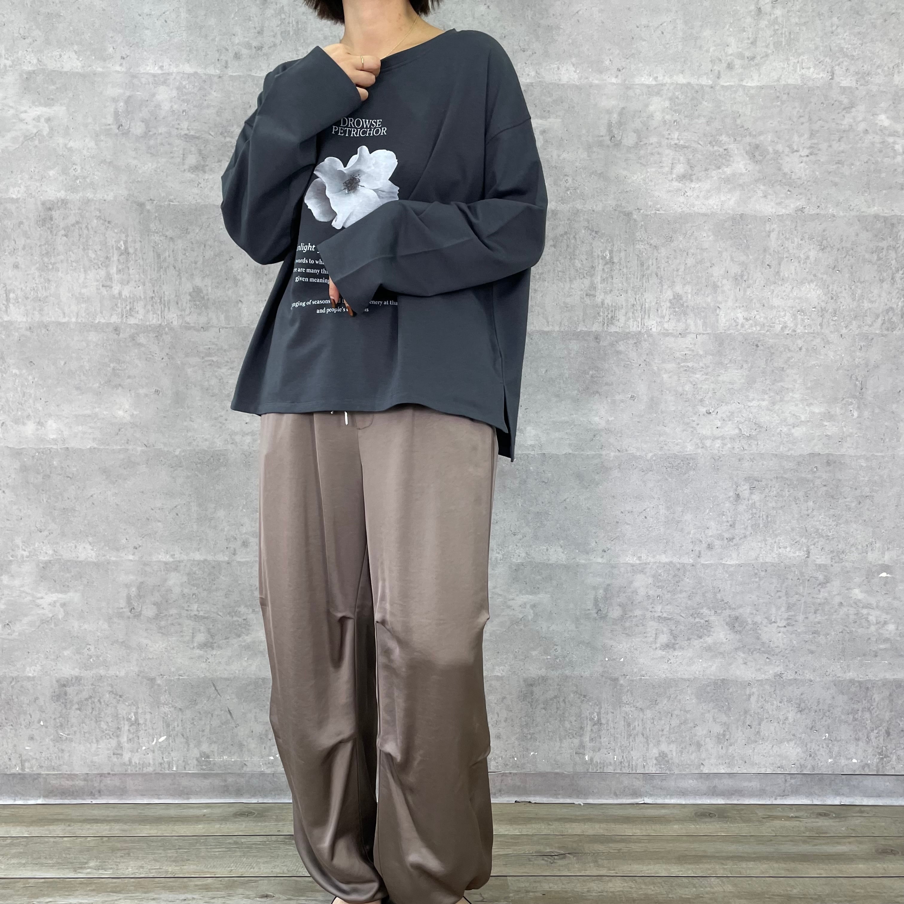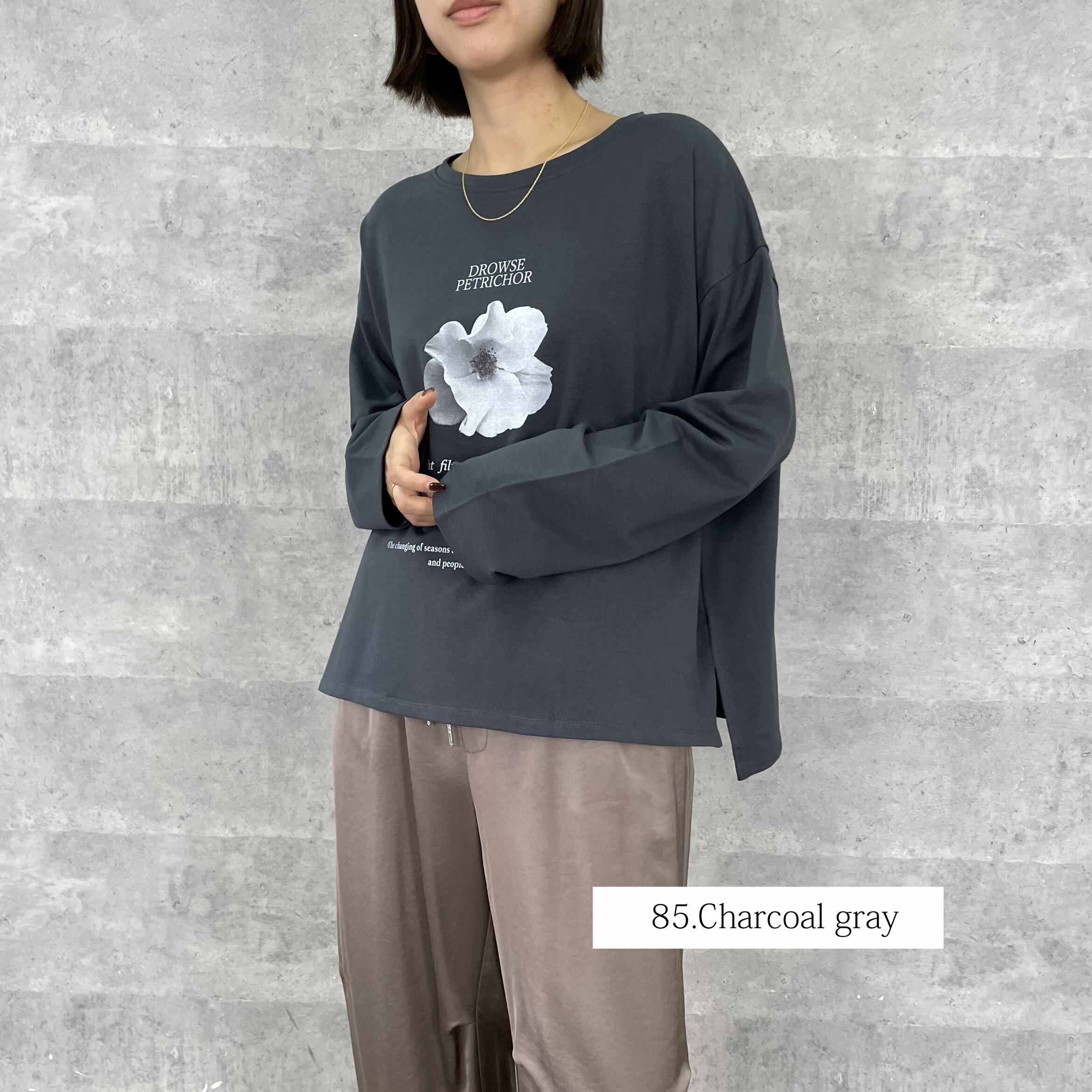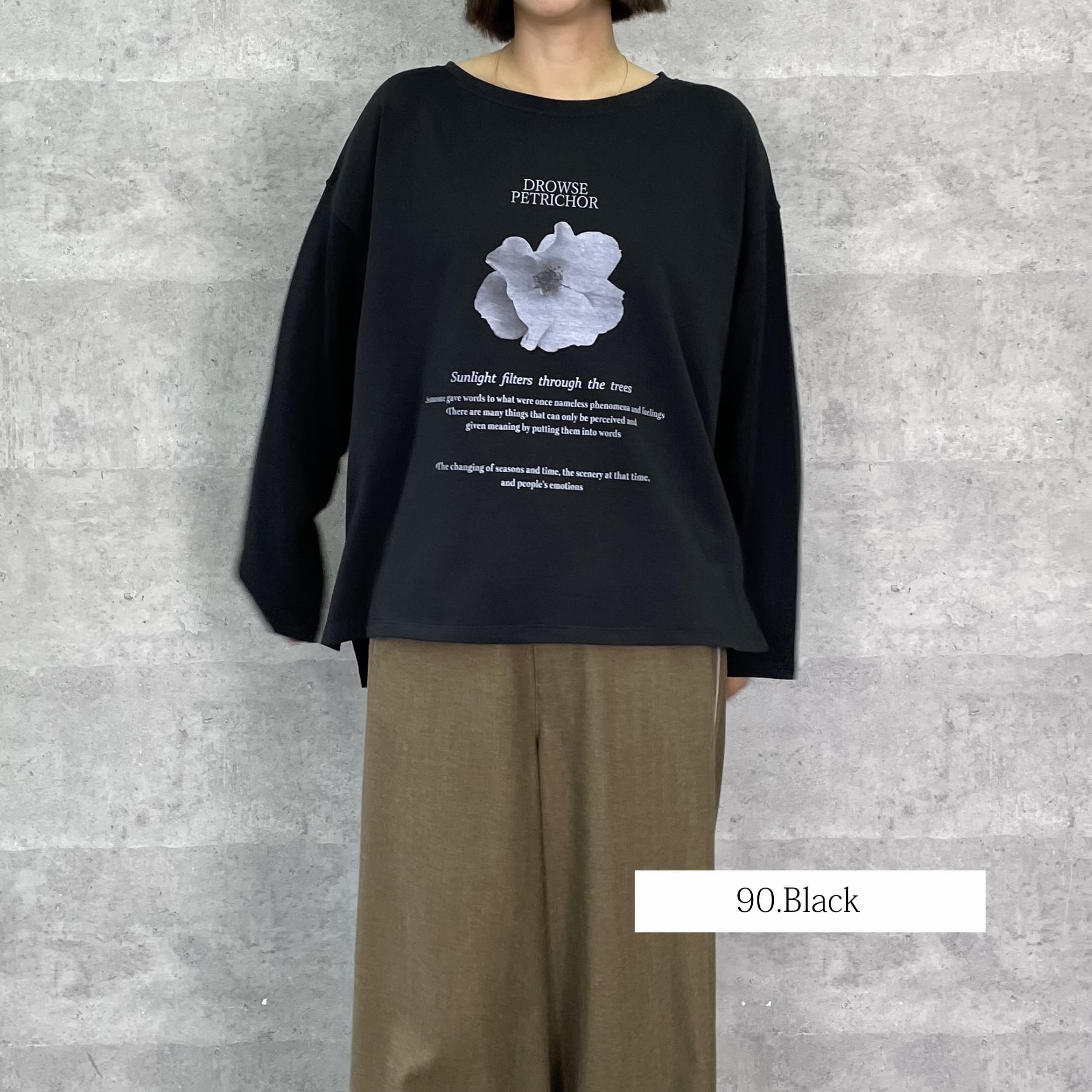 モノトーンのシックなフラワープリントがお洒落で1枚で着映えするミニ裏毛素材のトップス。