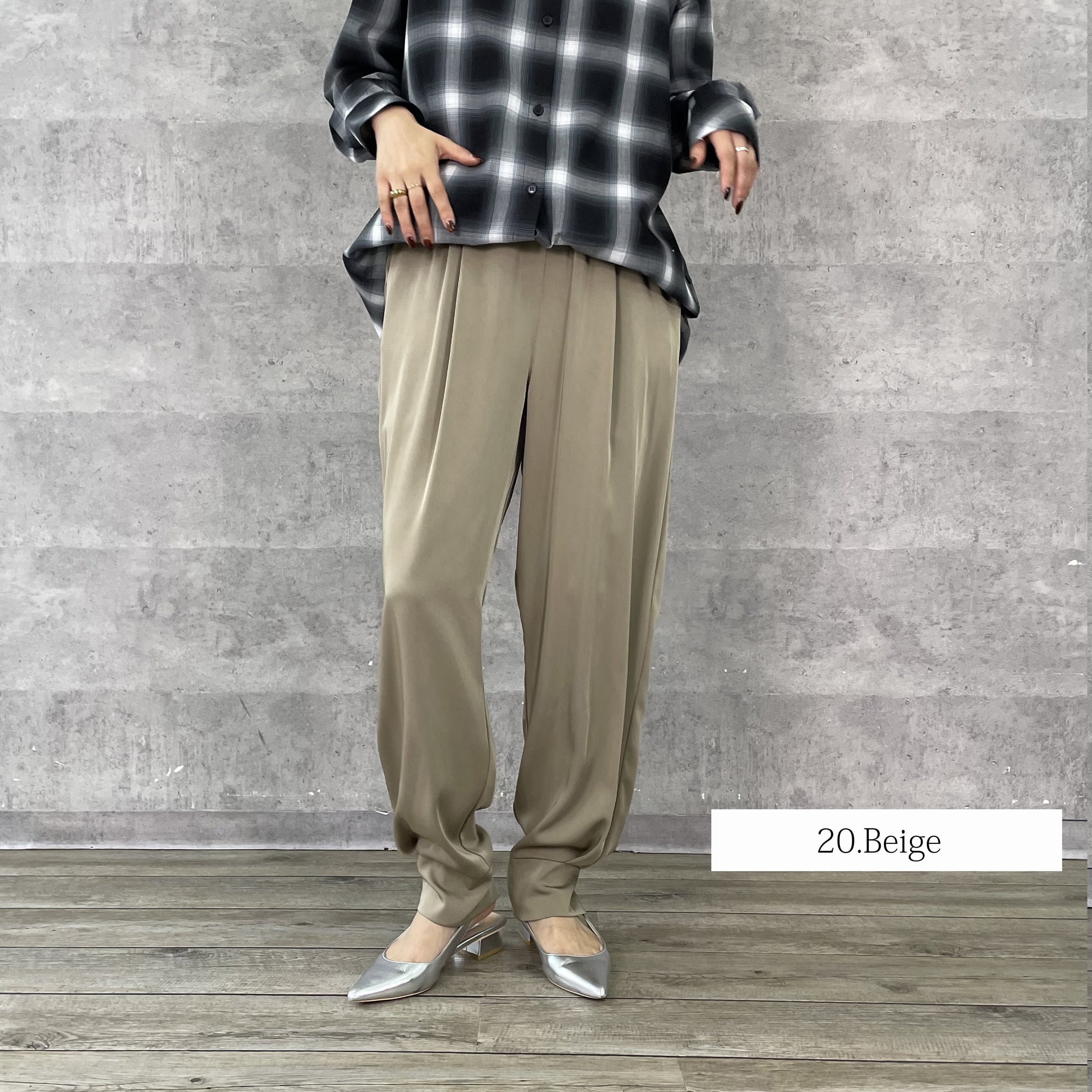 とろみと光沢感のある素材が大人なムードのきれいめジョガーパンツ。