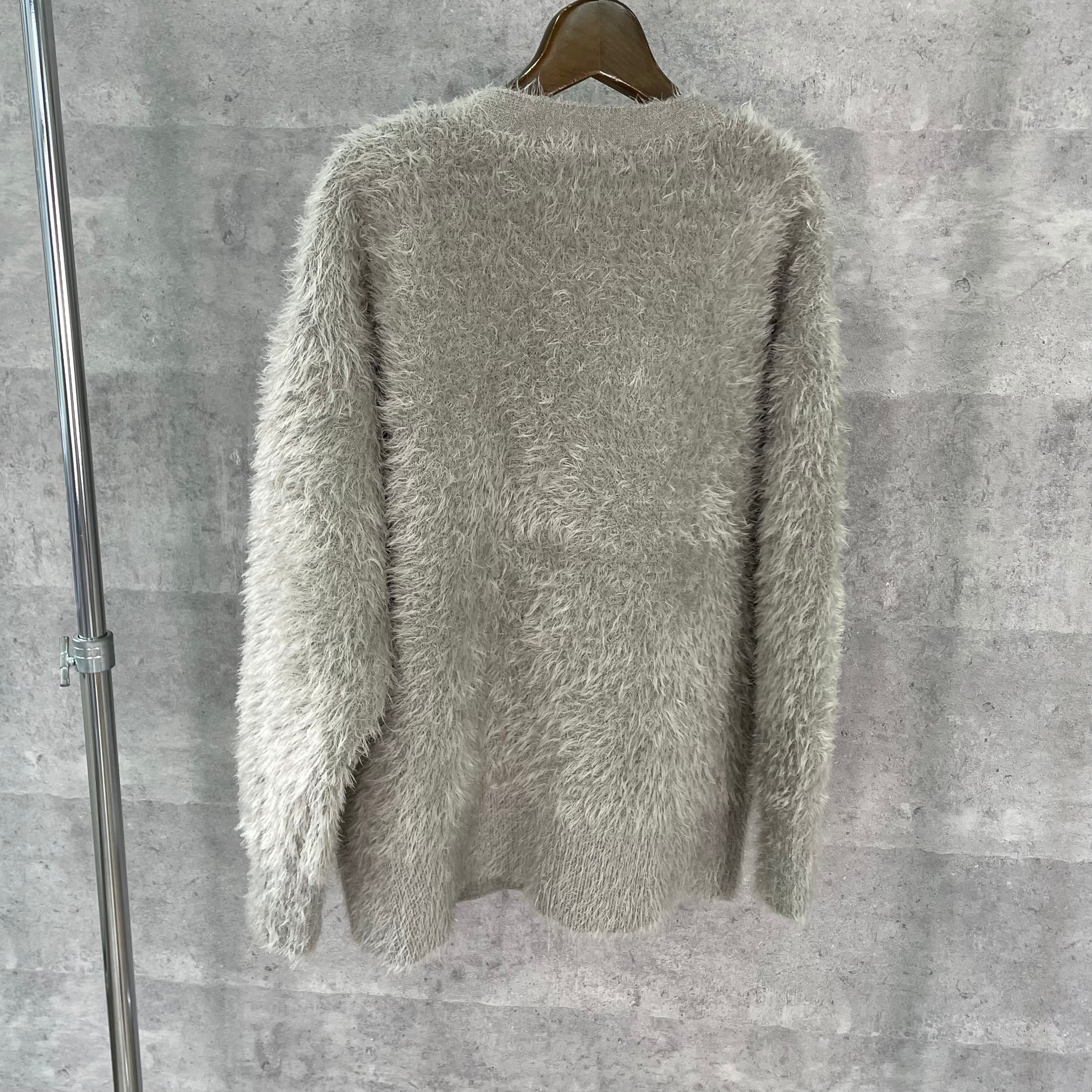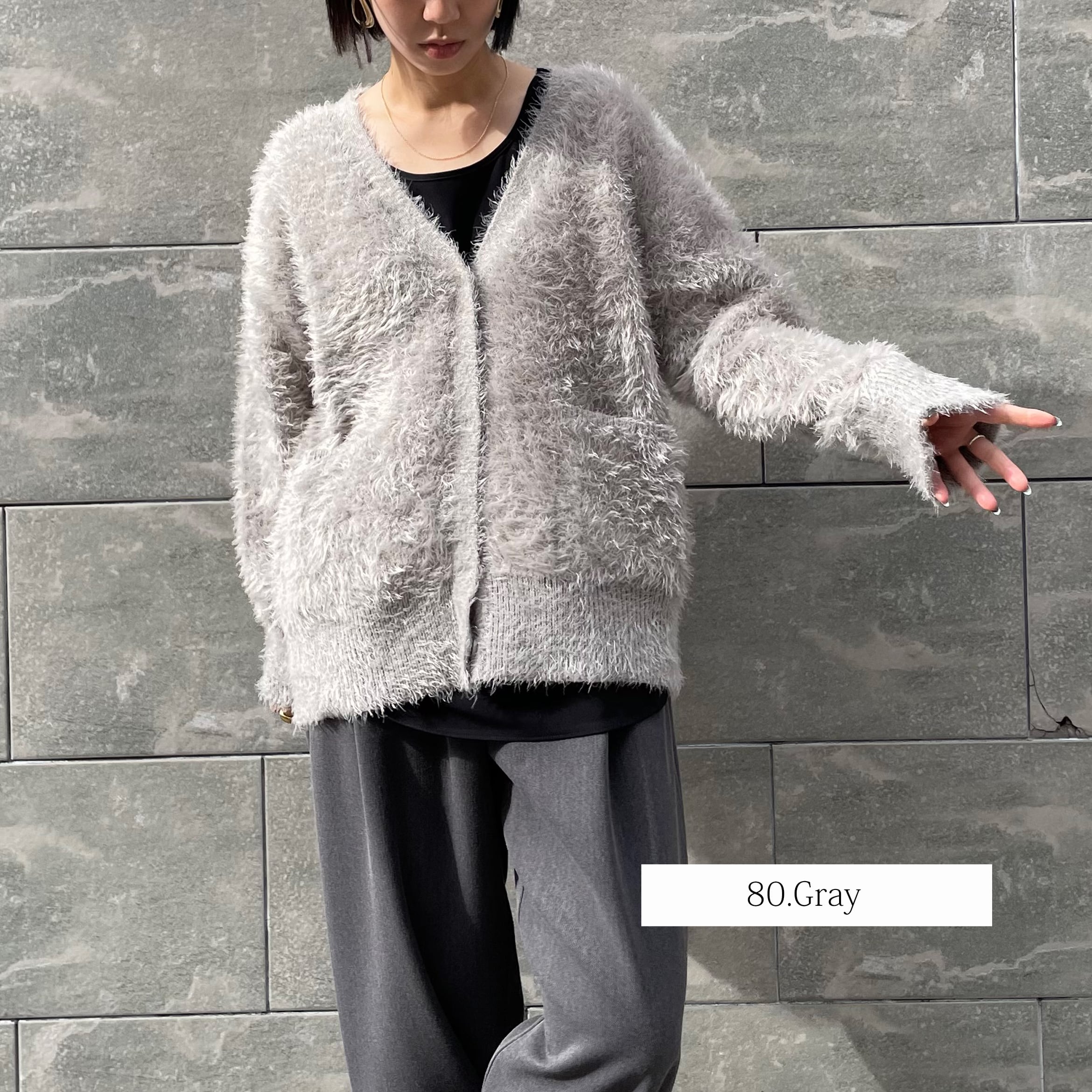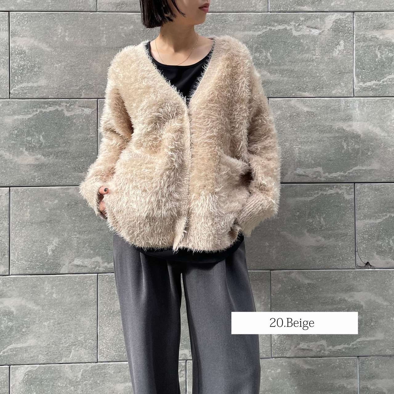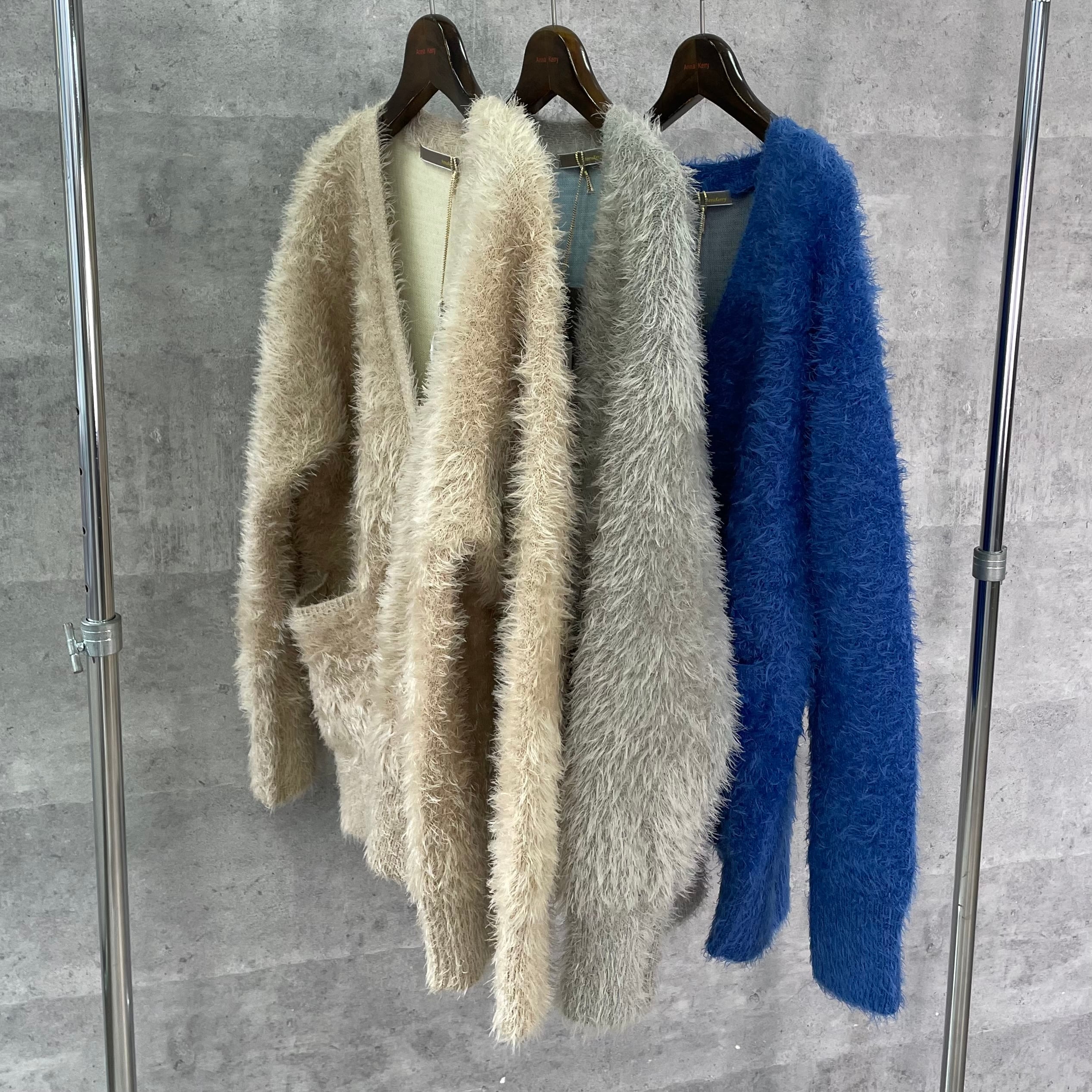 シャギーとポリエステルの編地を接結させたニットカーディガン