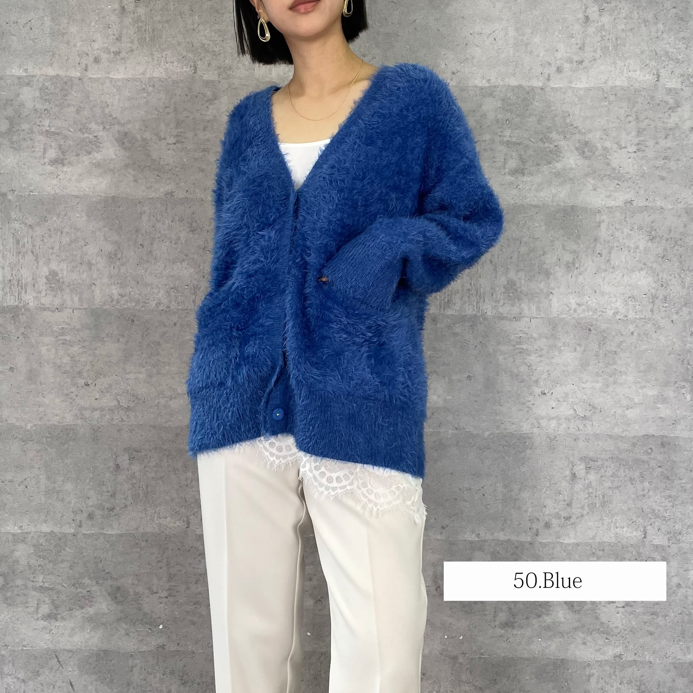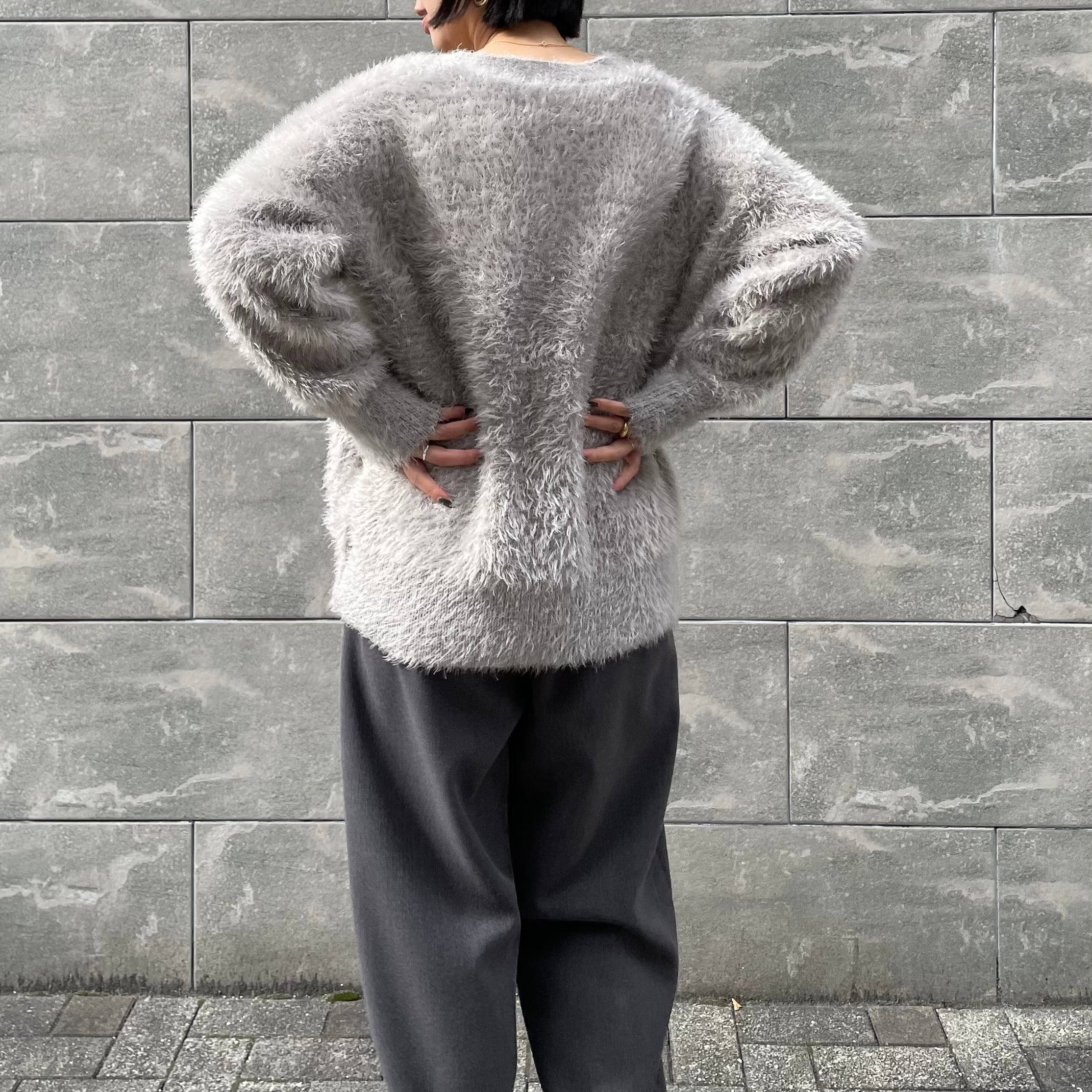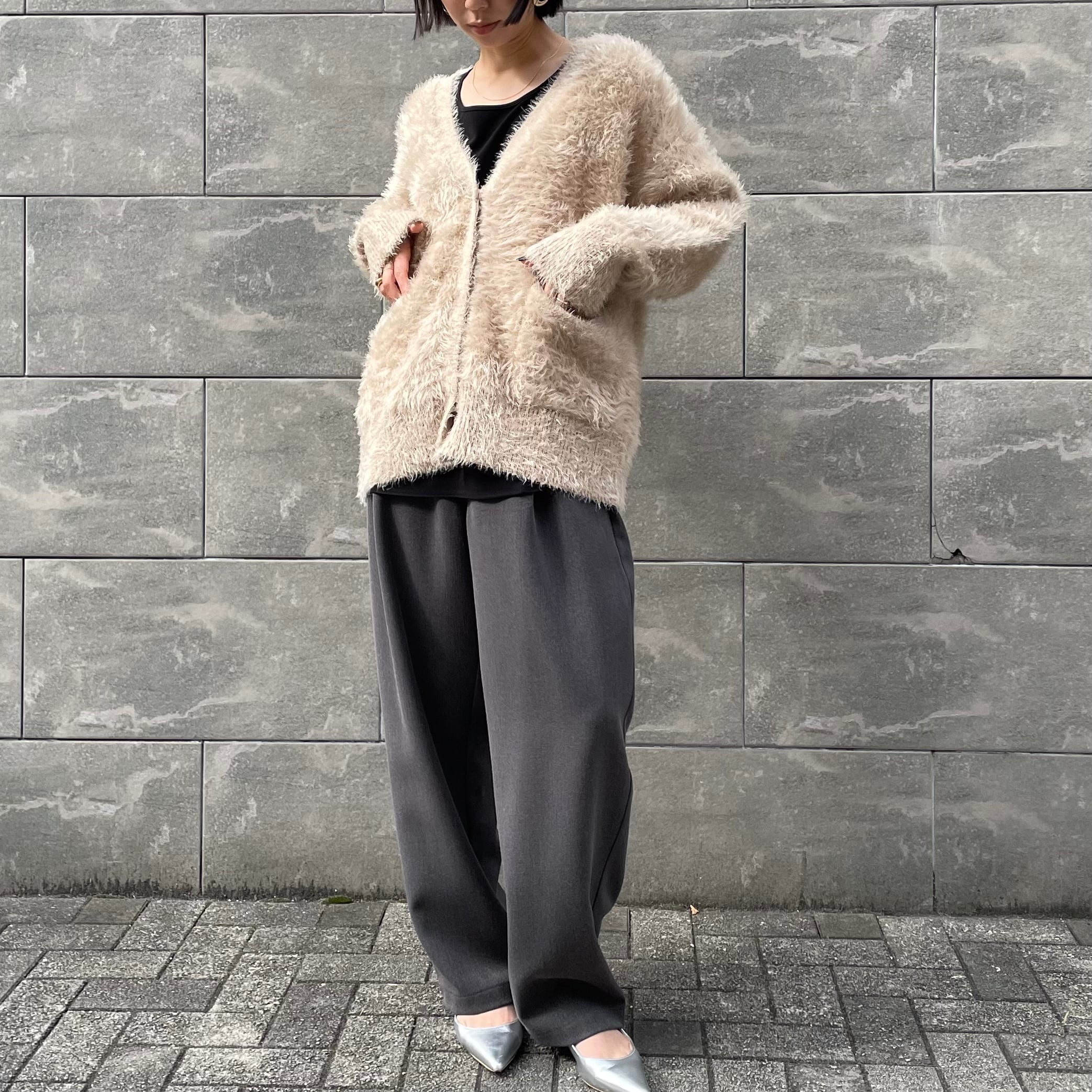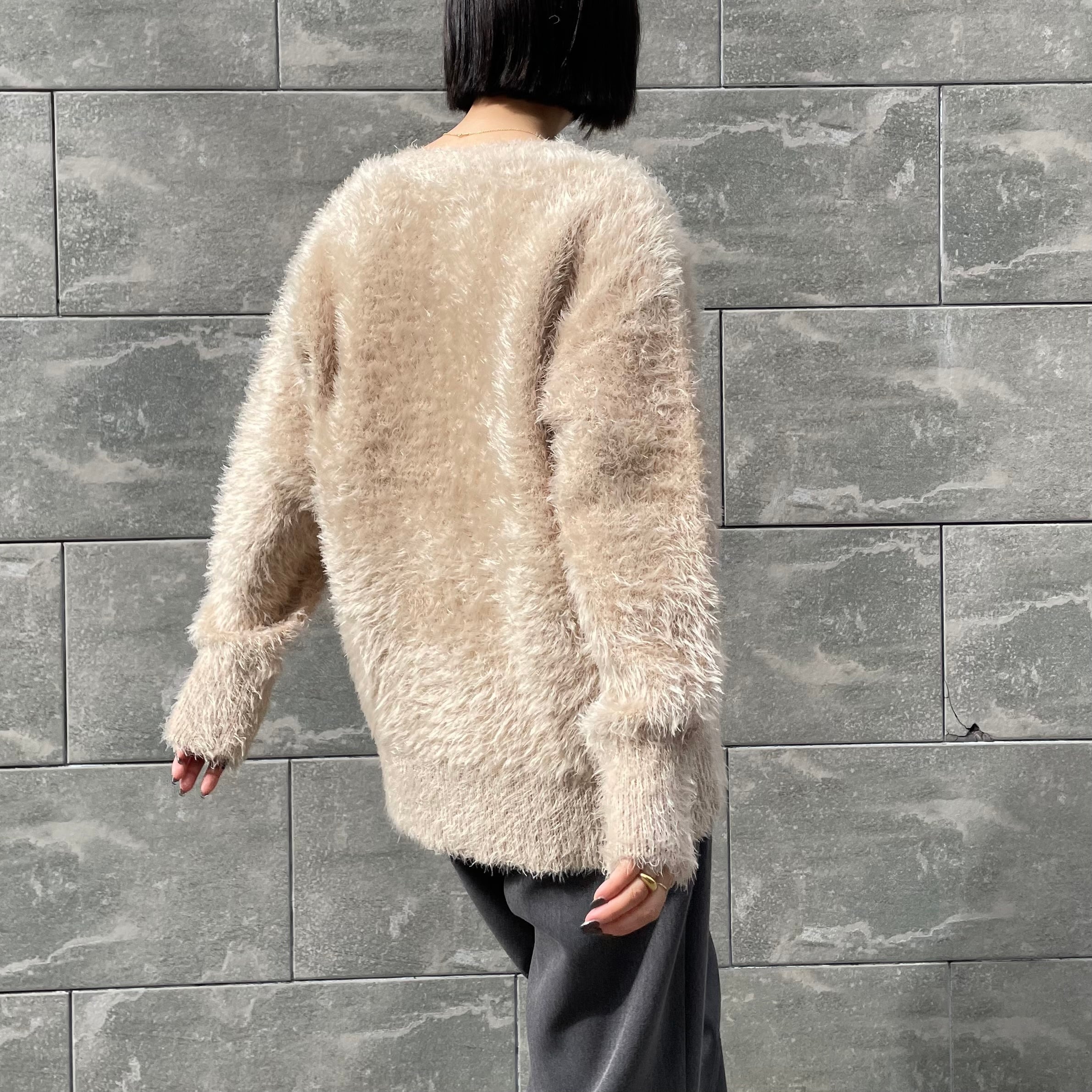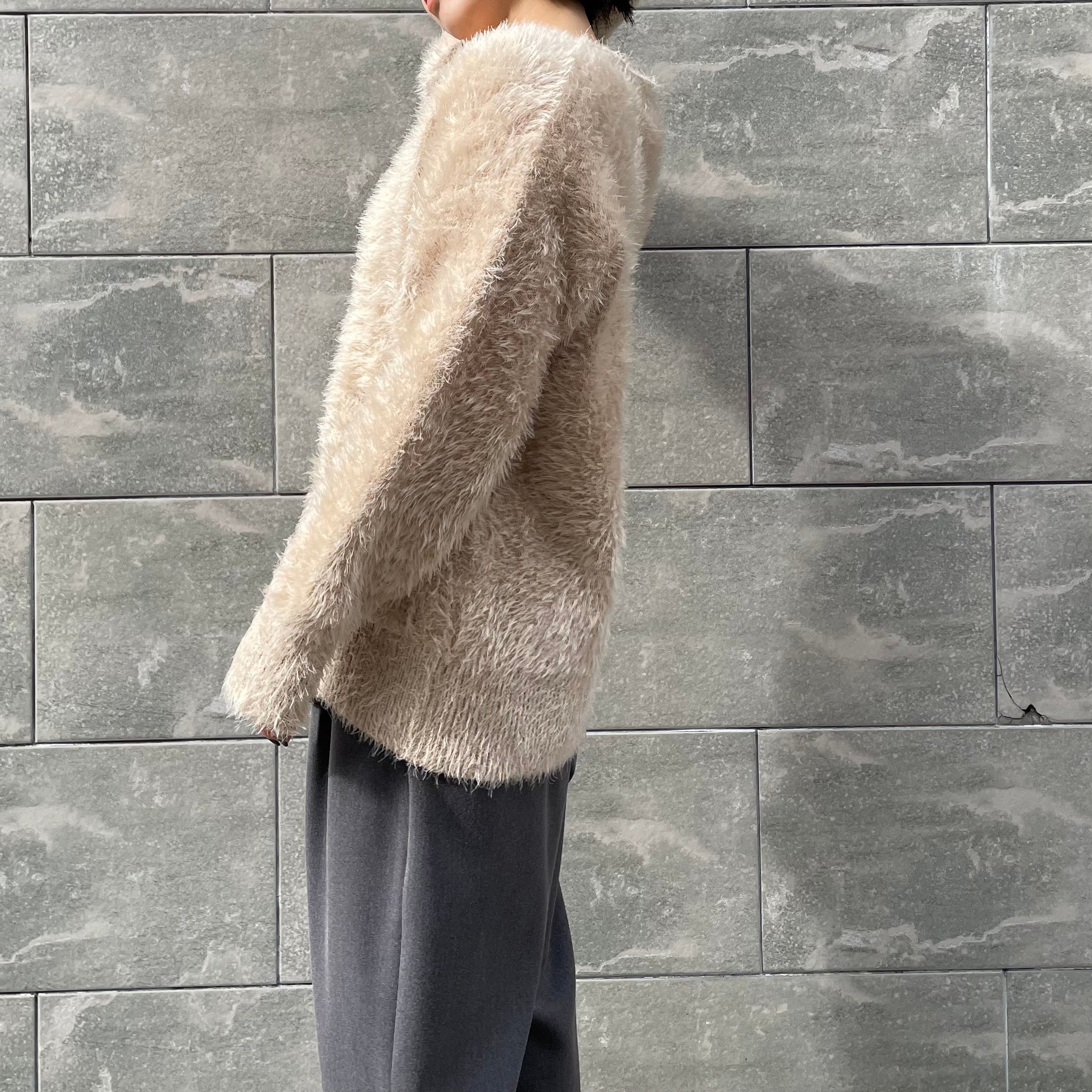 シャギーとポリエステルの編地を接結させたニットカーディガン
