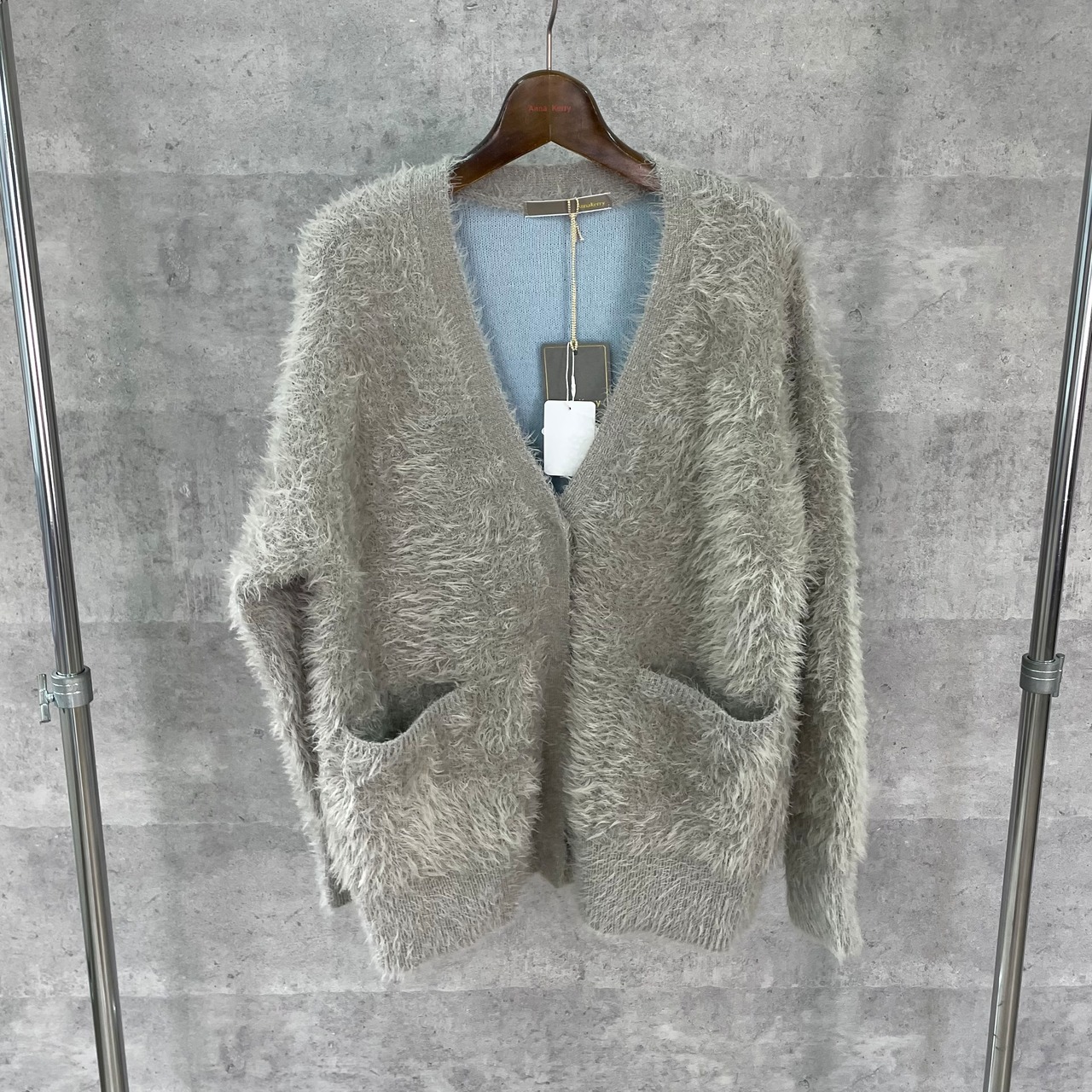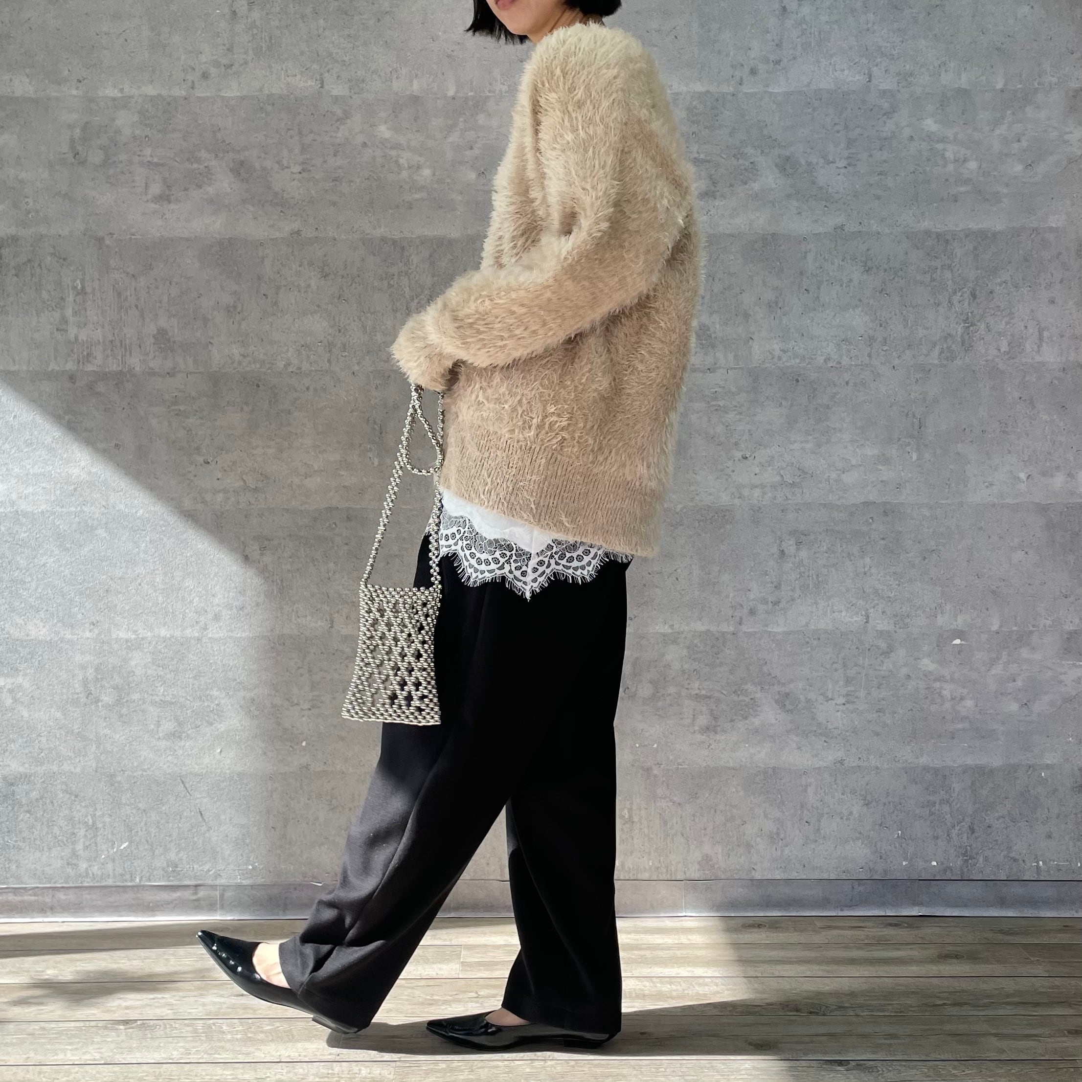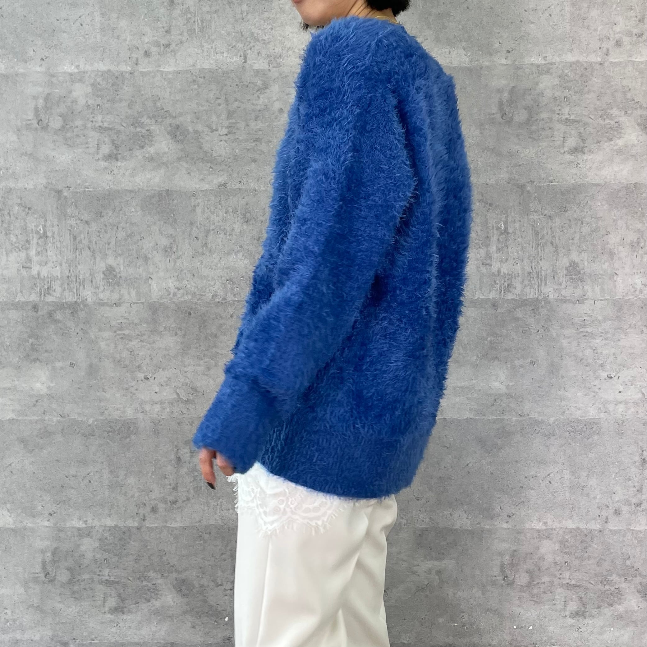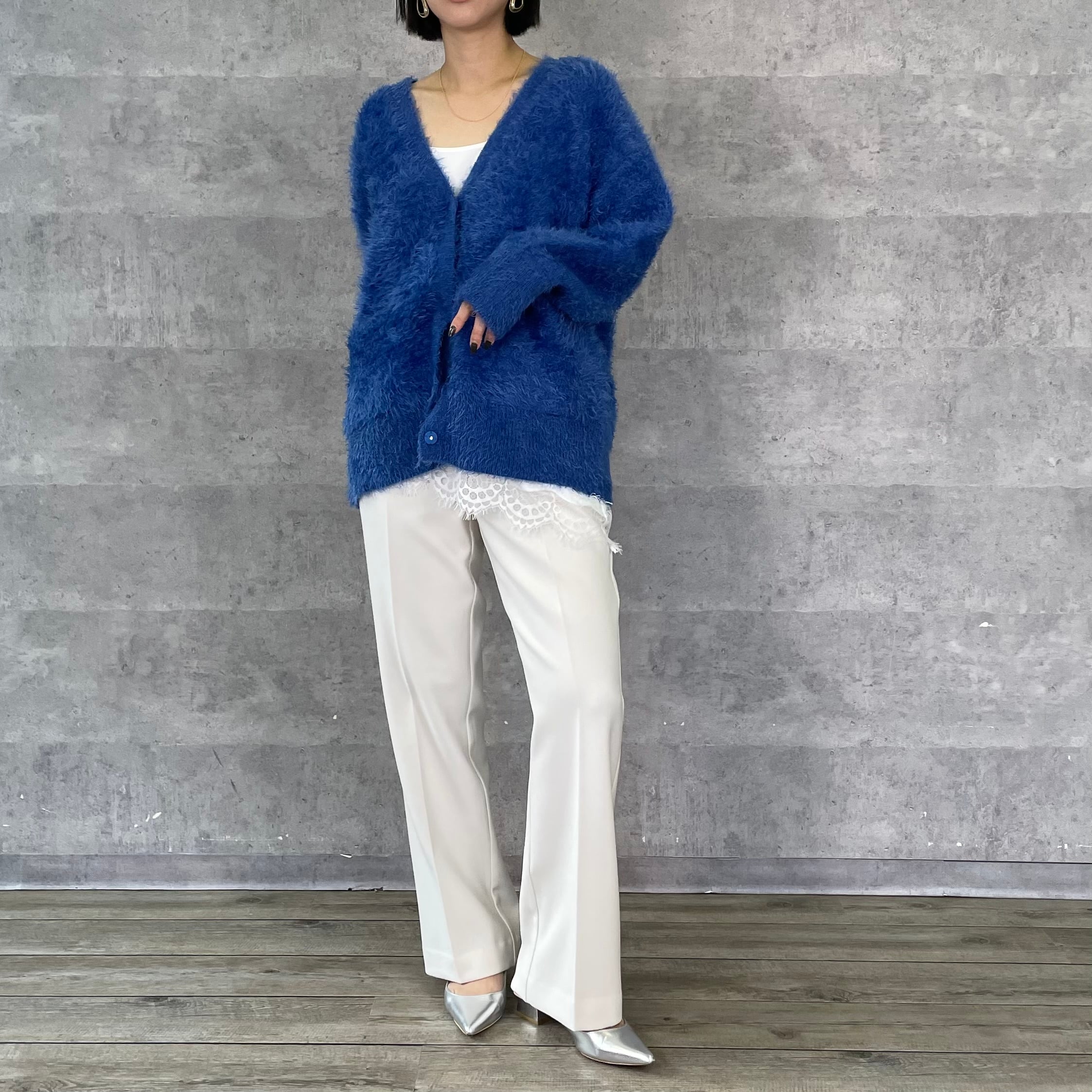 シャギーとポリエステルの編地を接結させたニットカーディガン
