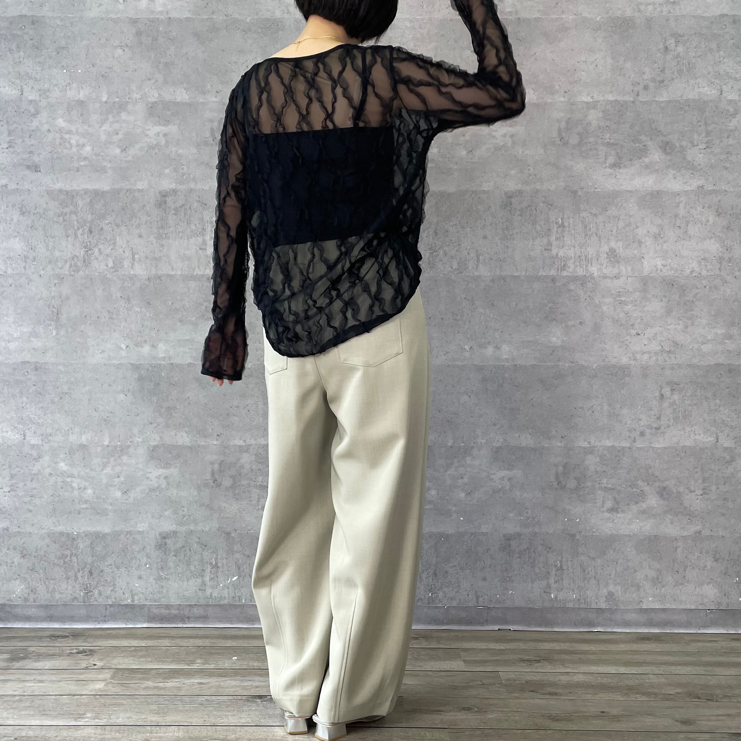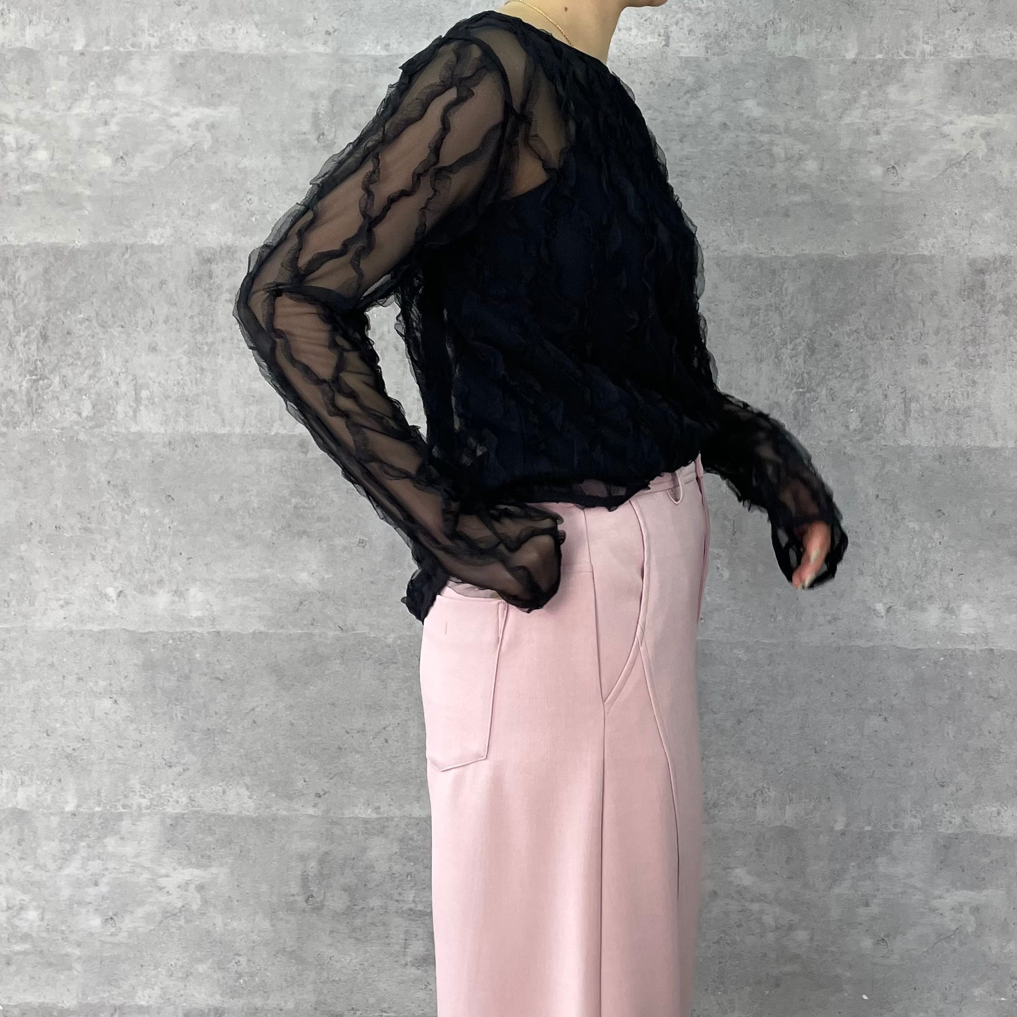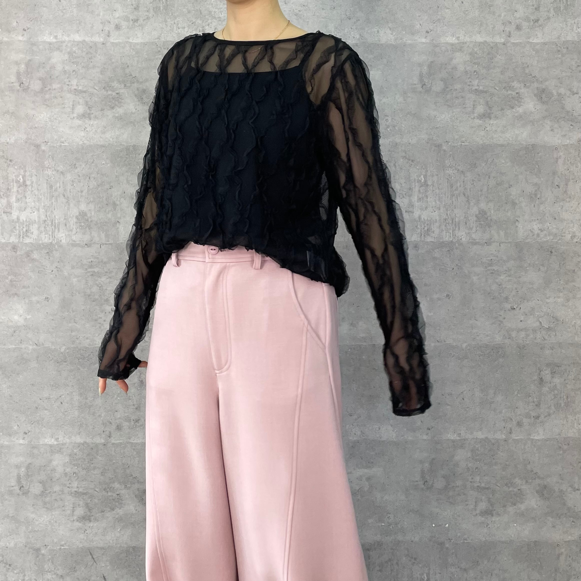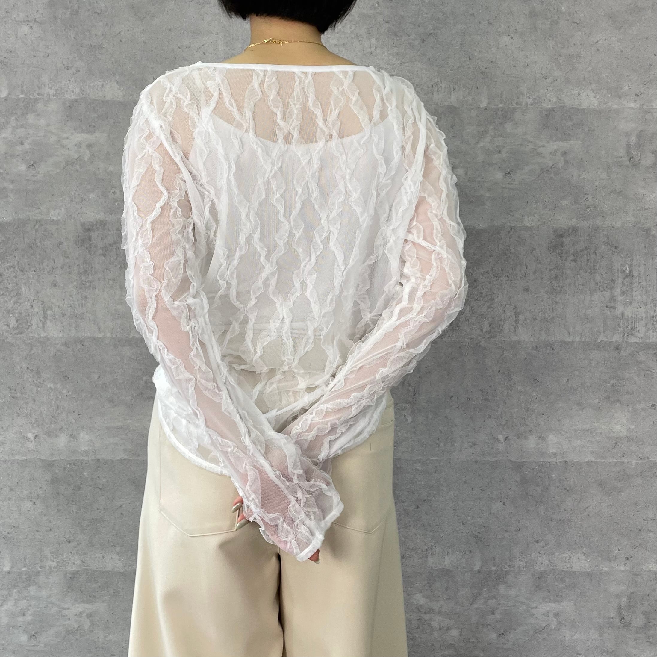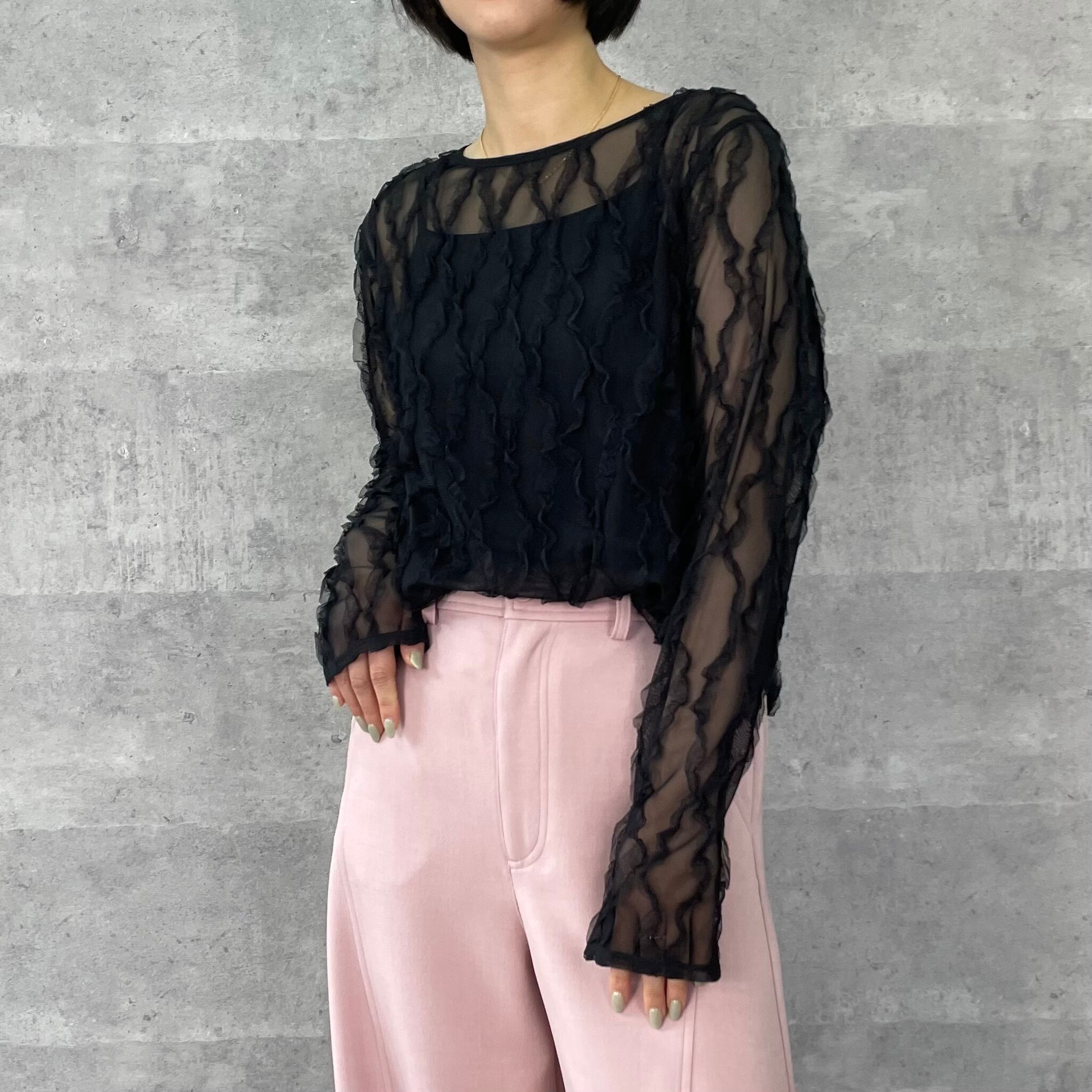 伸縮性のあるチュールにフリルがあしらわれた素材が華やかでフェミニンなシアートップス。
