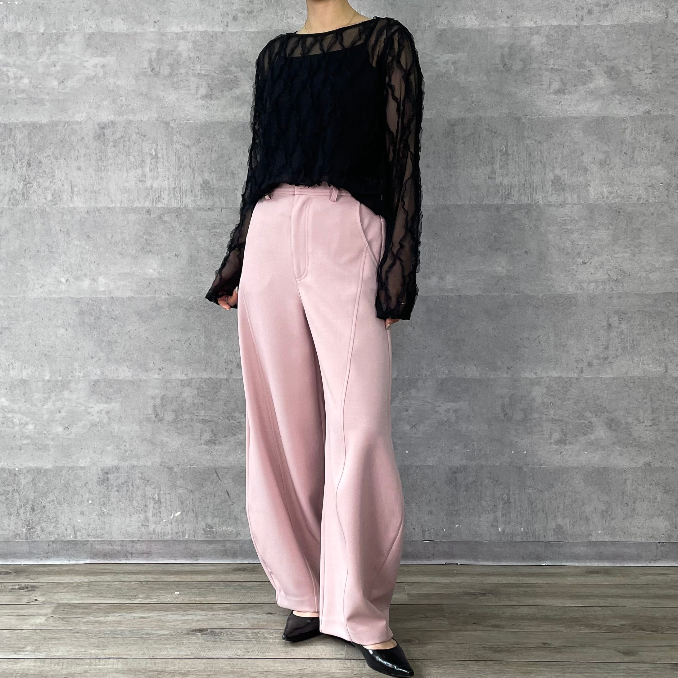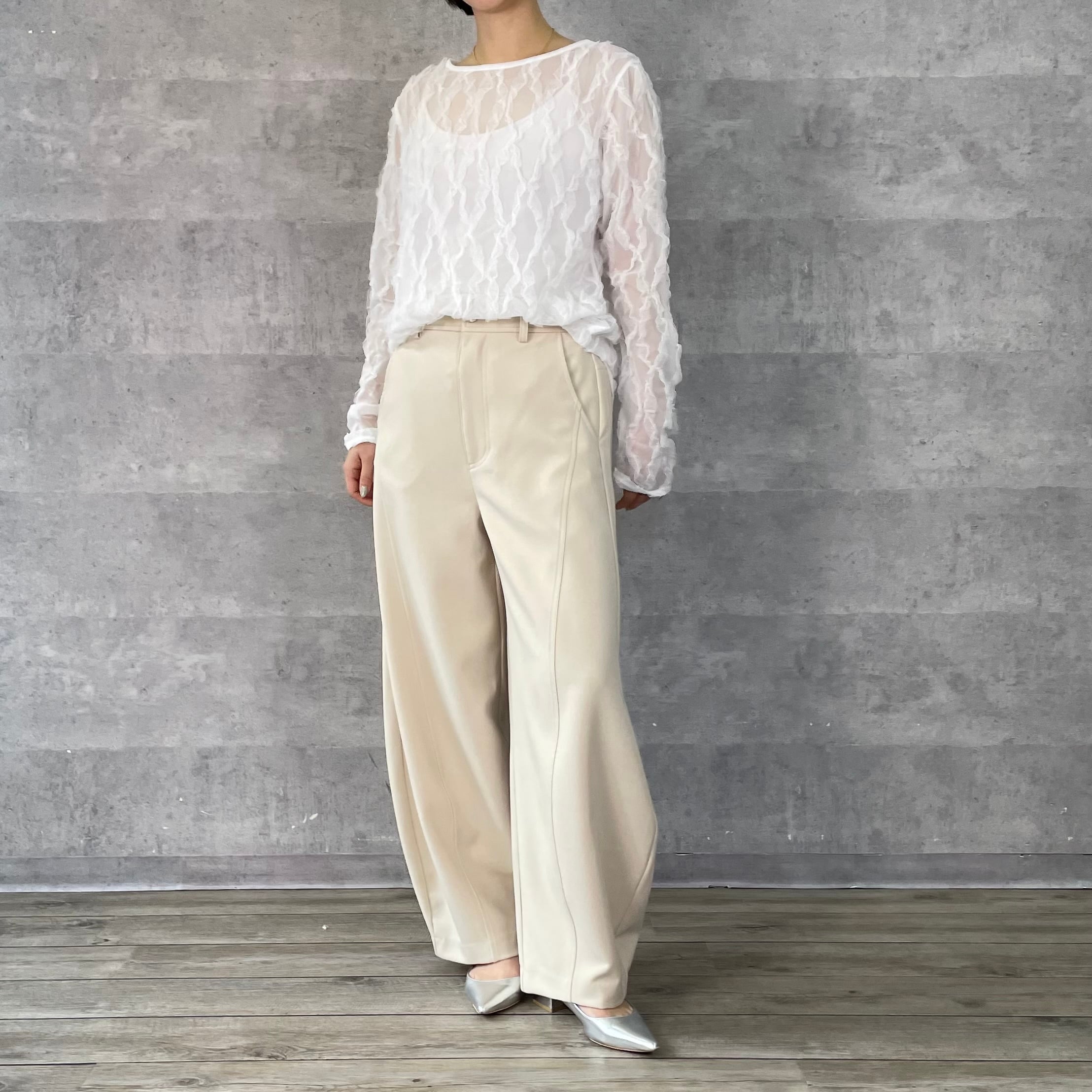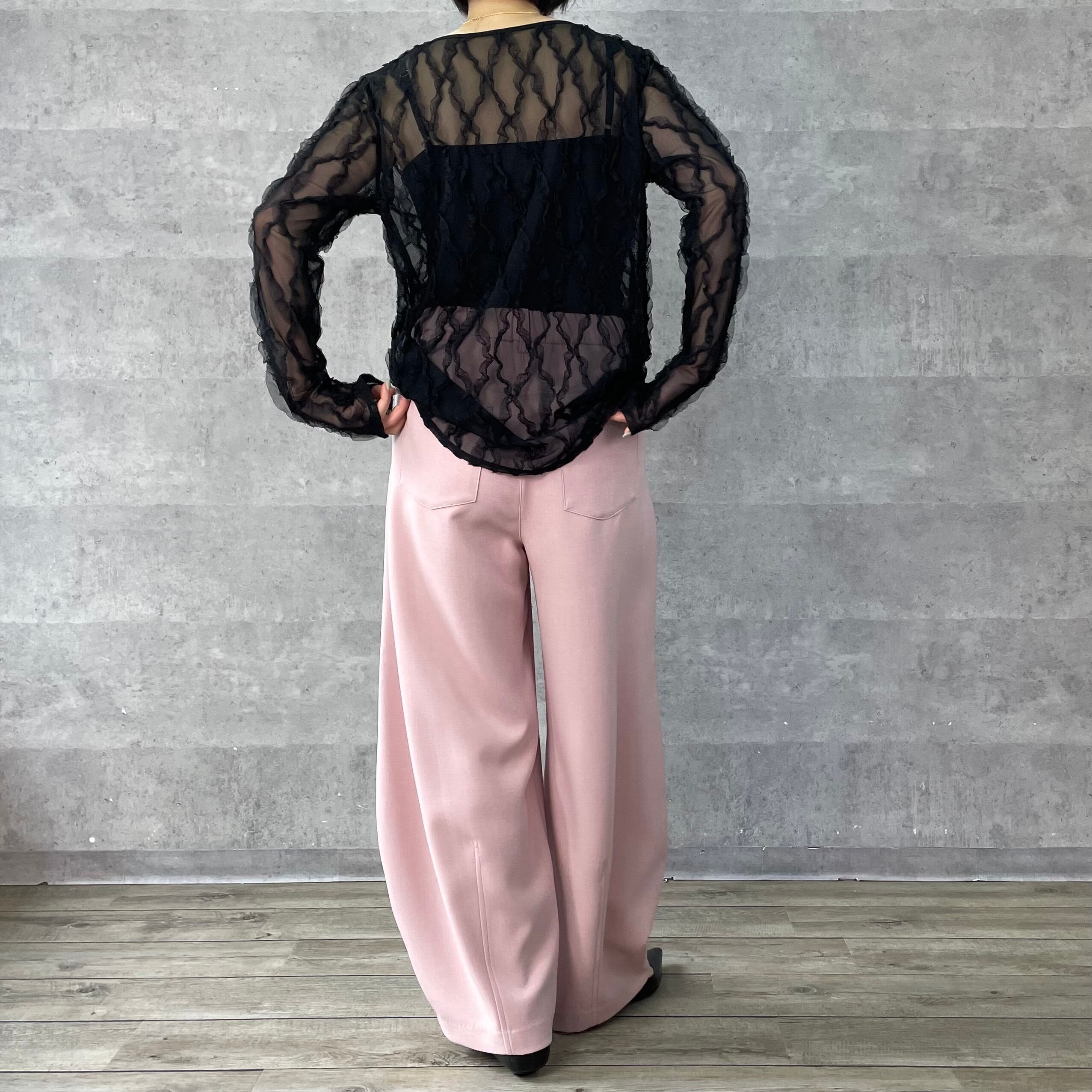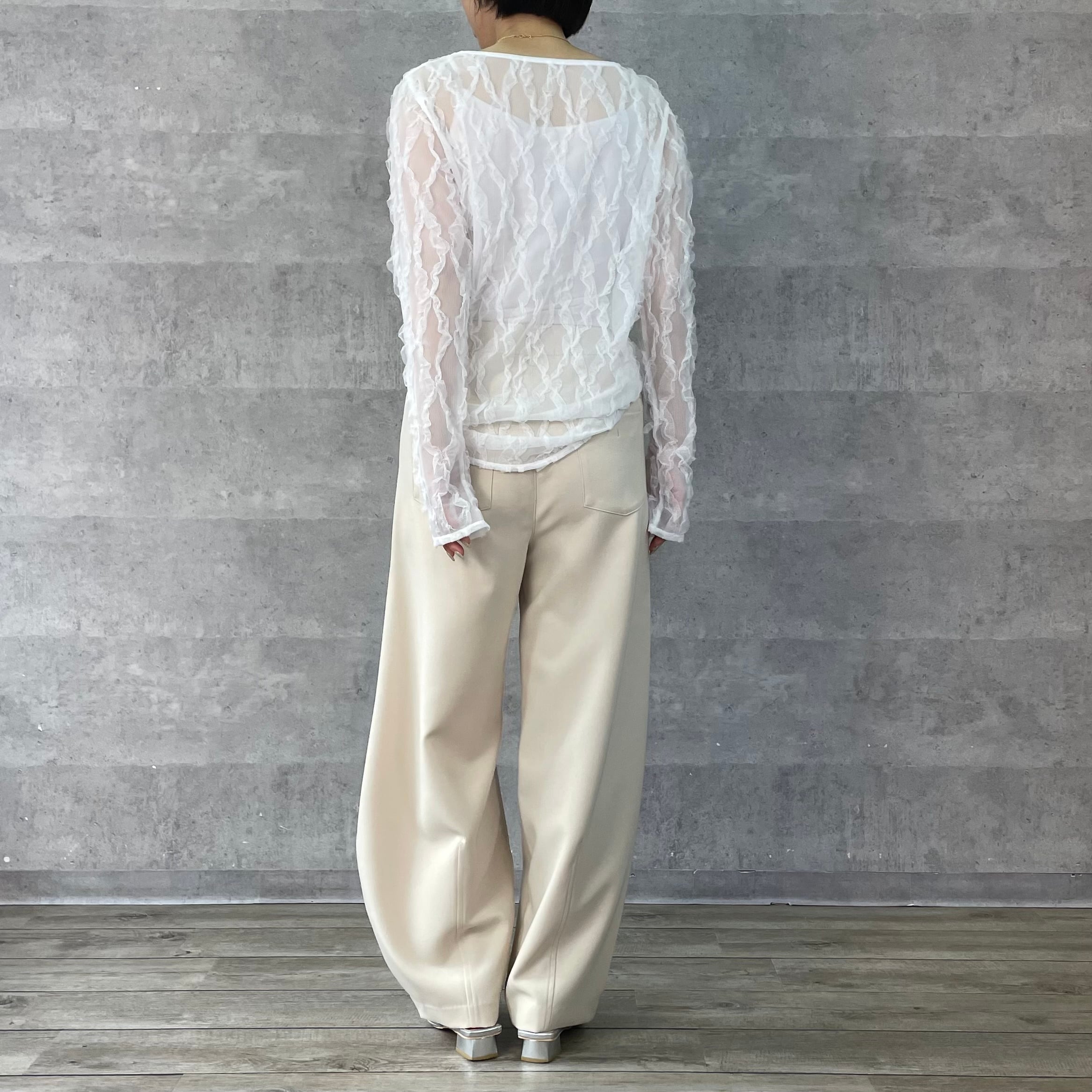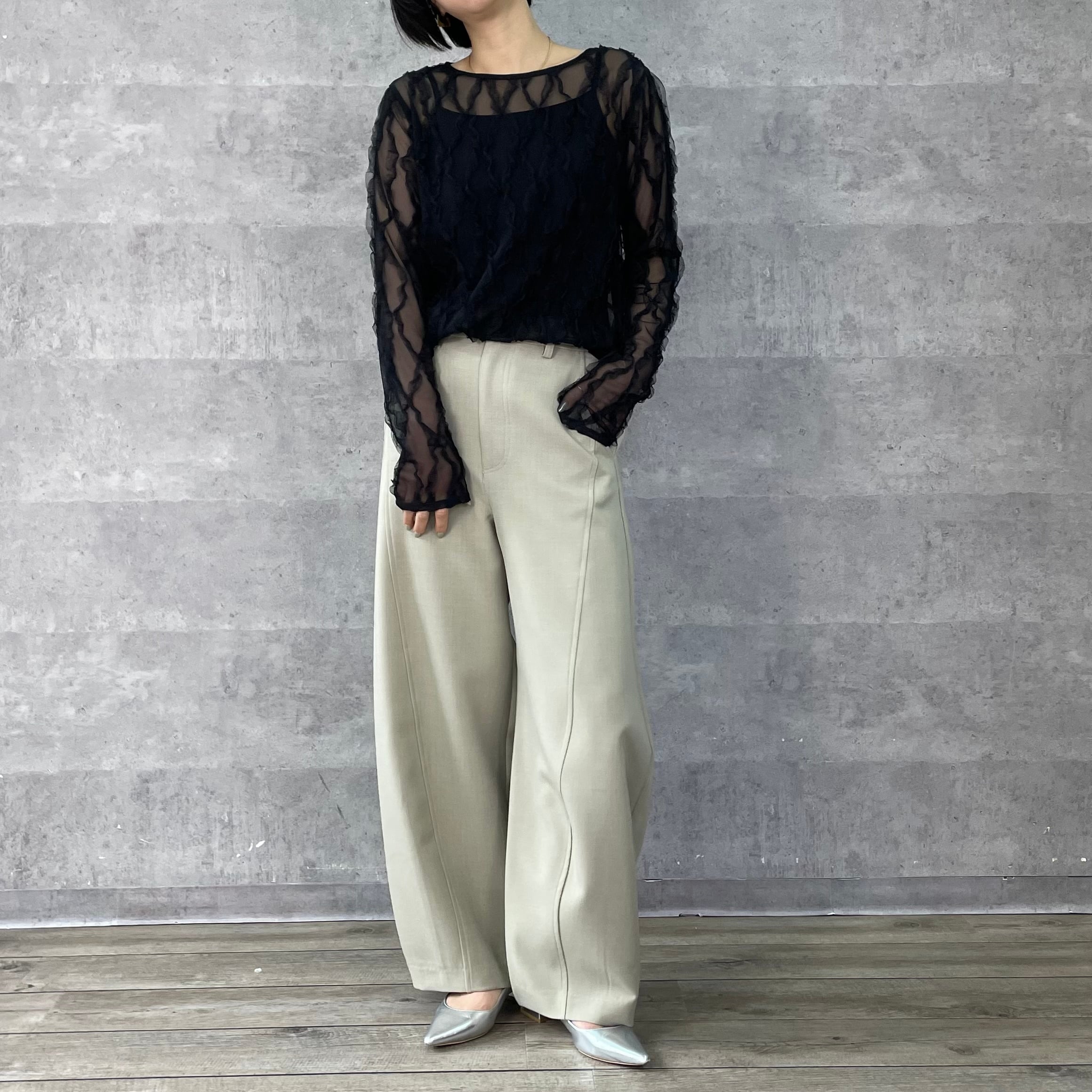 伸縮性のあるチュールにフリルがあしらわれた素材が華やかでフェミニンなシアートップス。