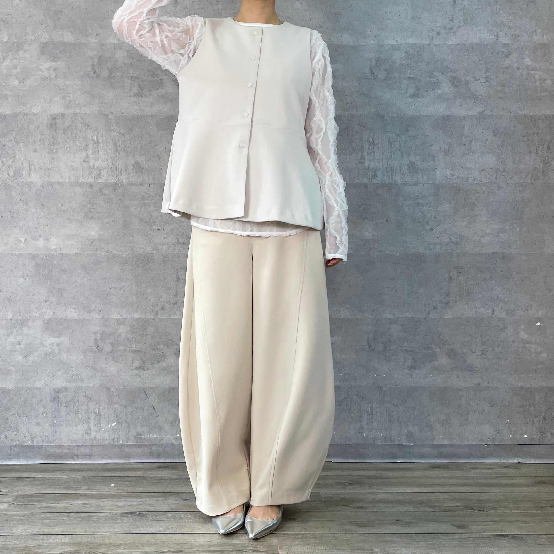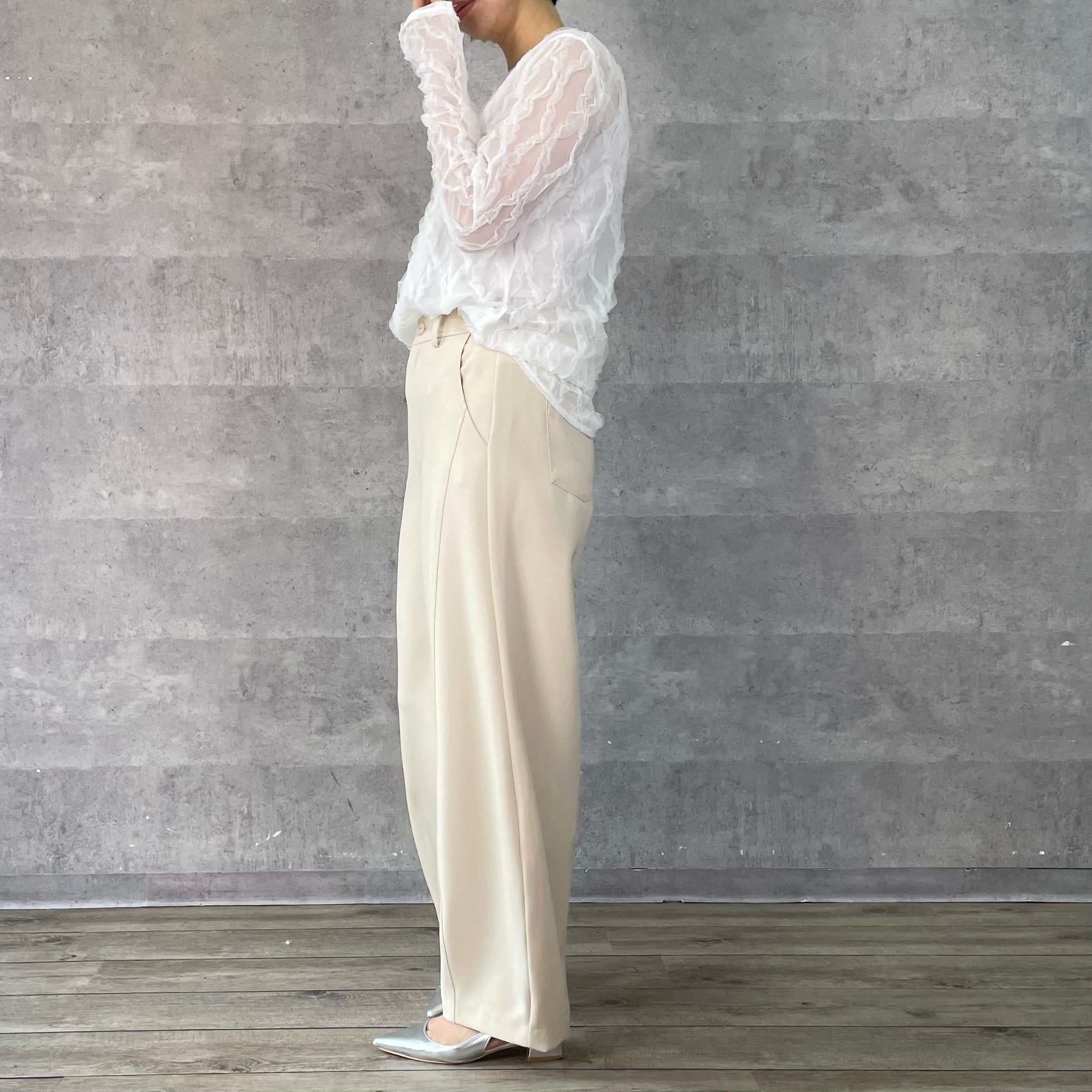 体のラインをきれいに見せる身頃のシルエットと長めの袖丈で華奢見えして