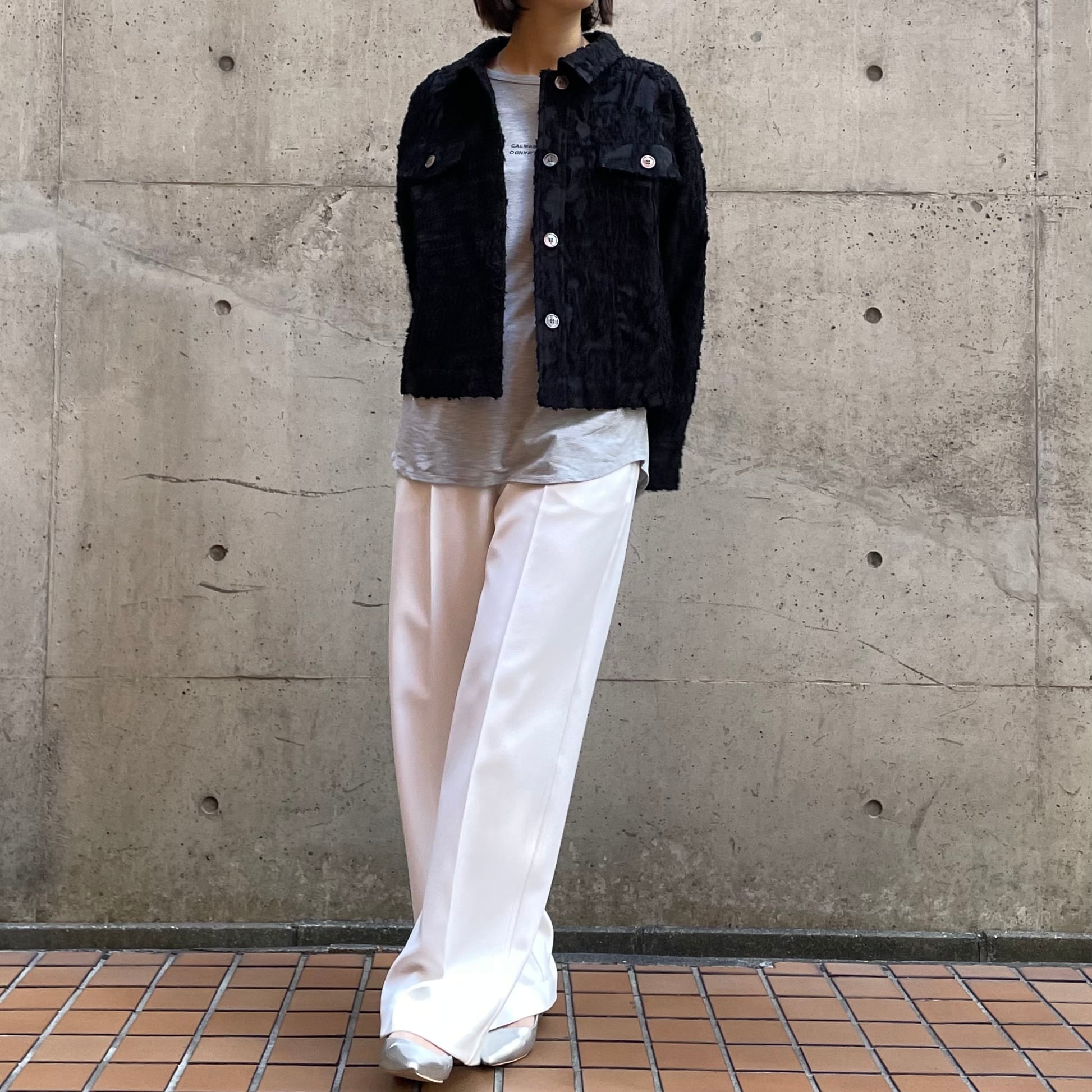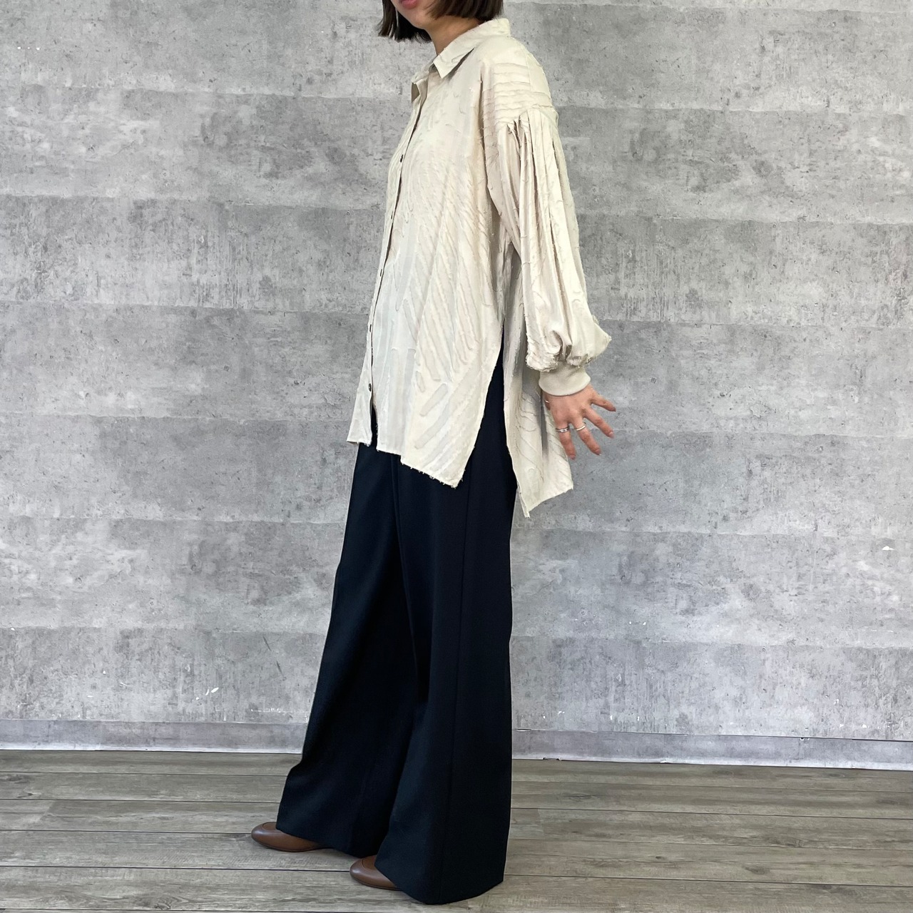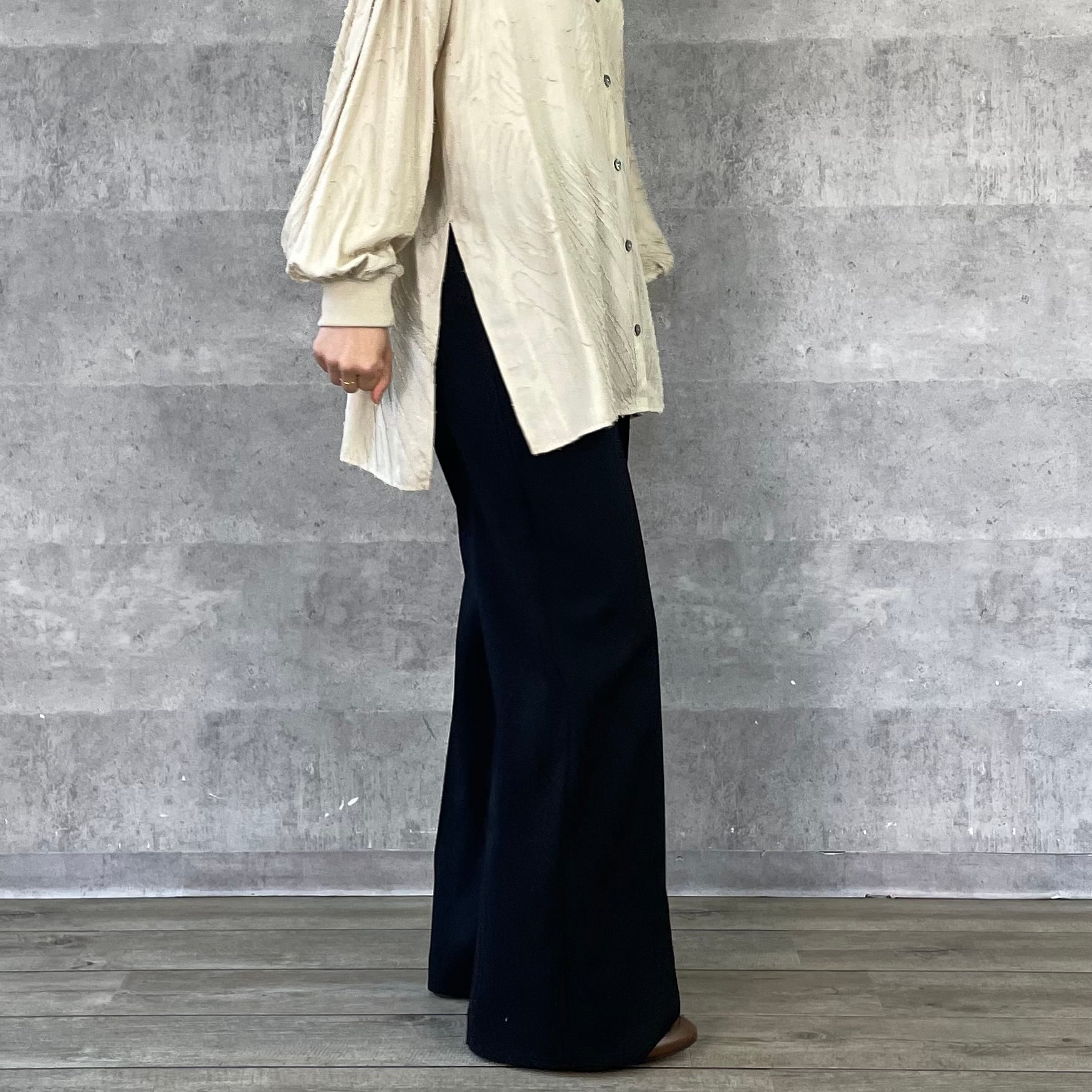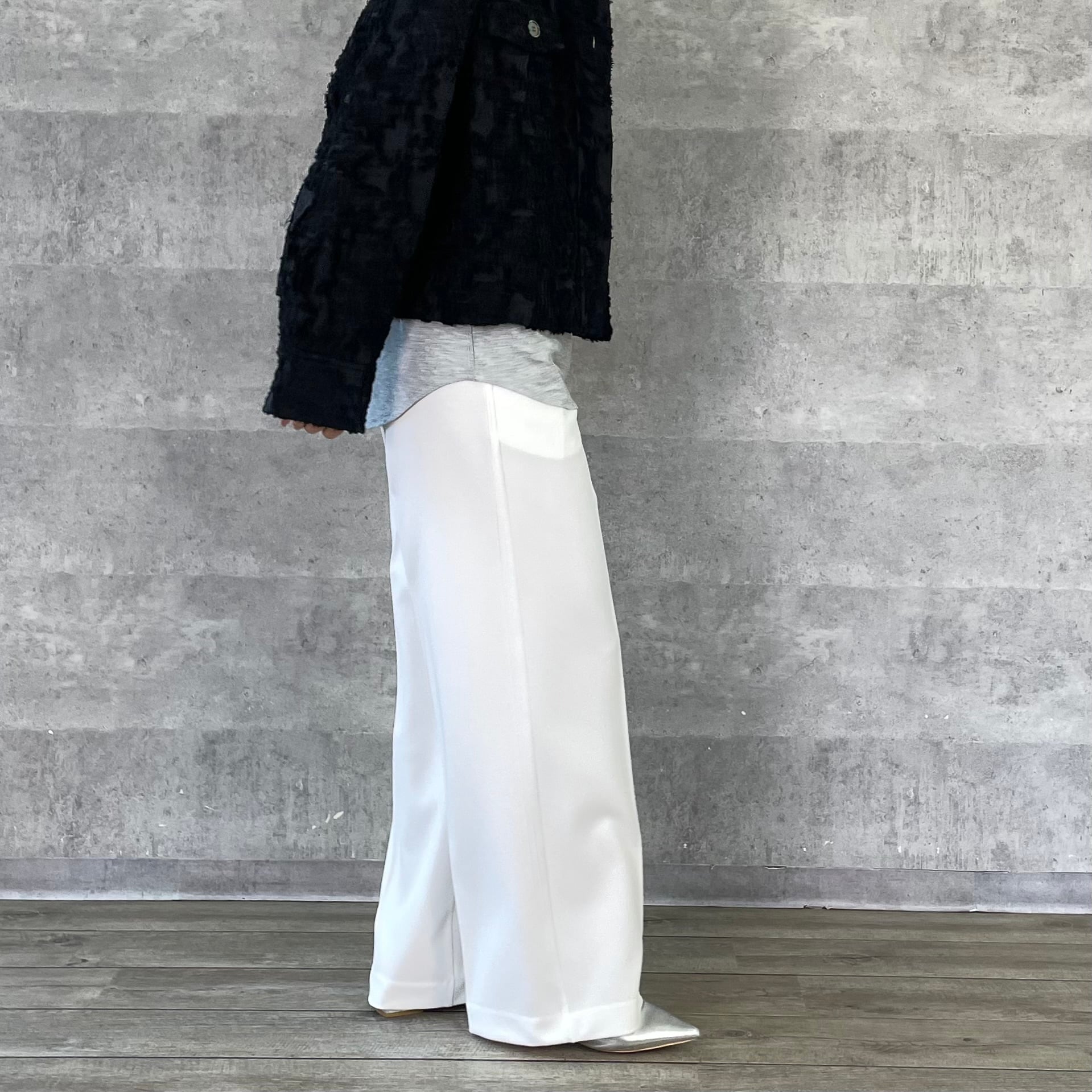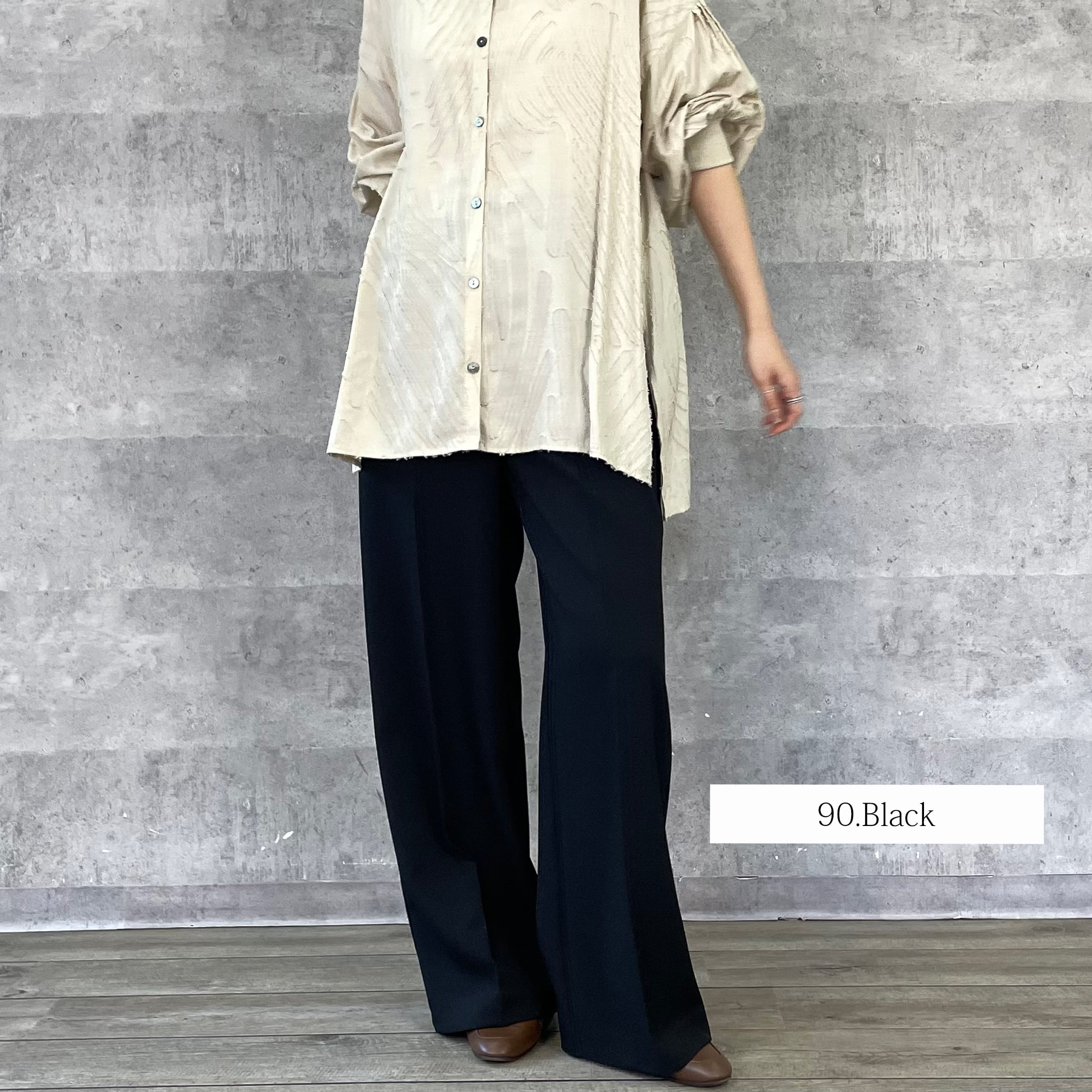 程よくワイドシルエットながらノータックで腰回りはすっきりと仕立てています