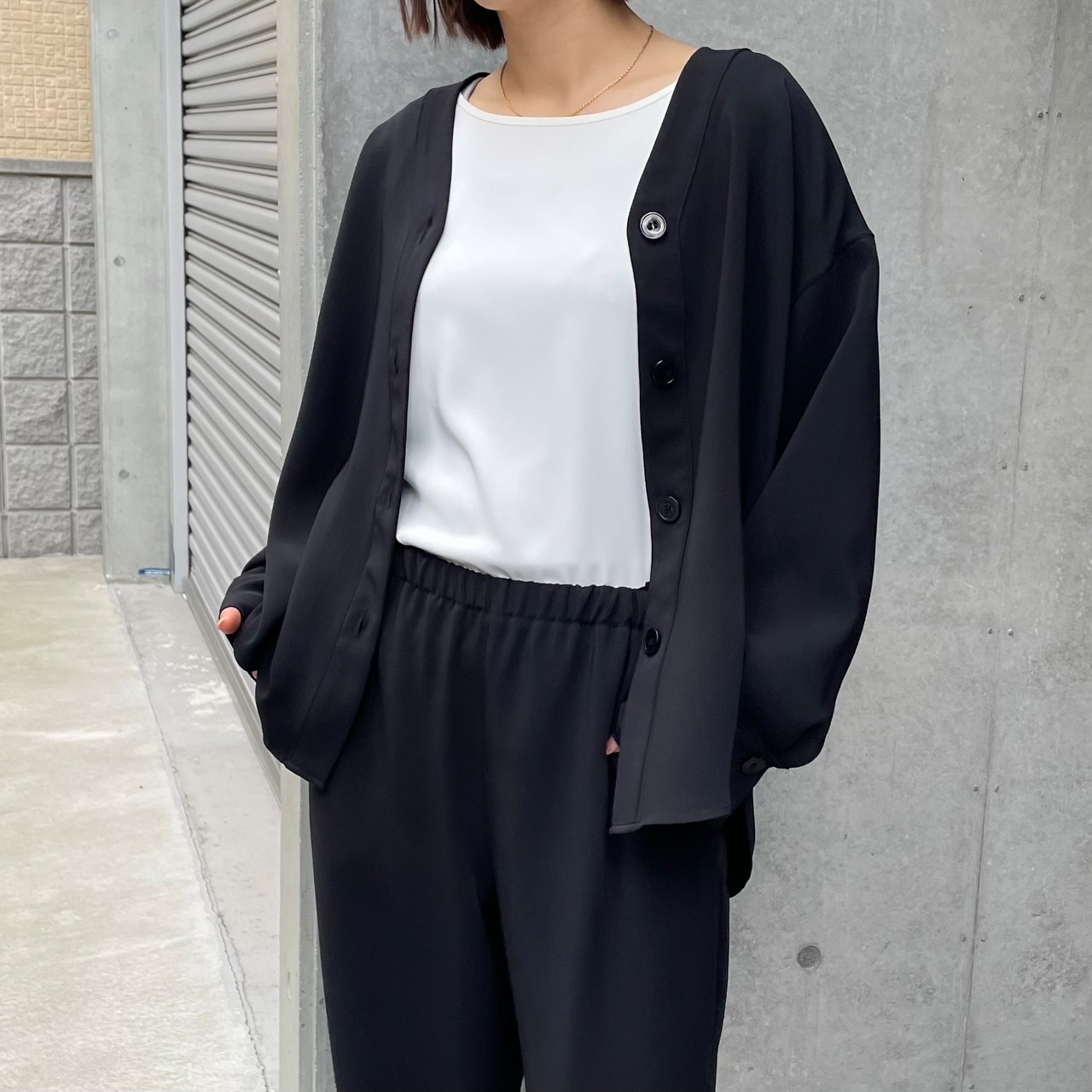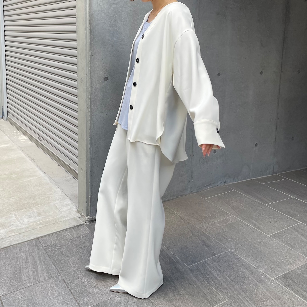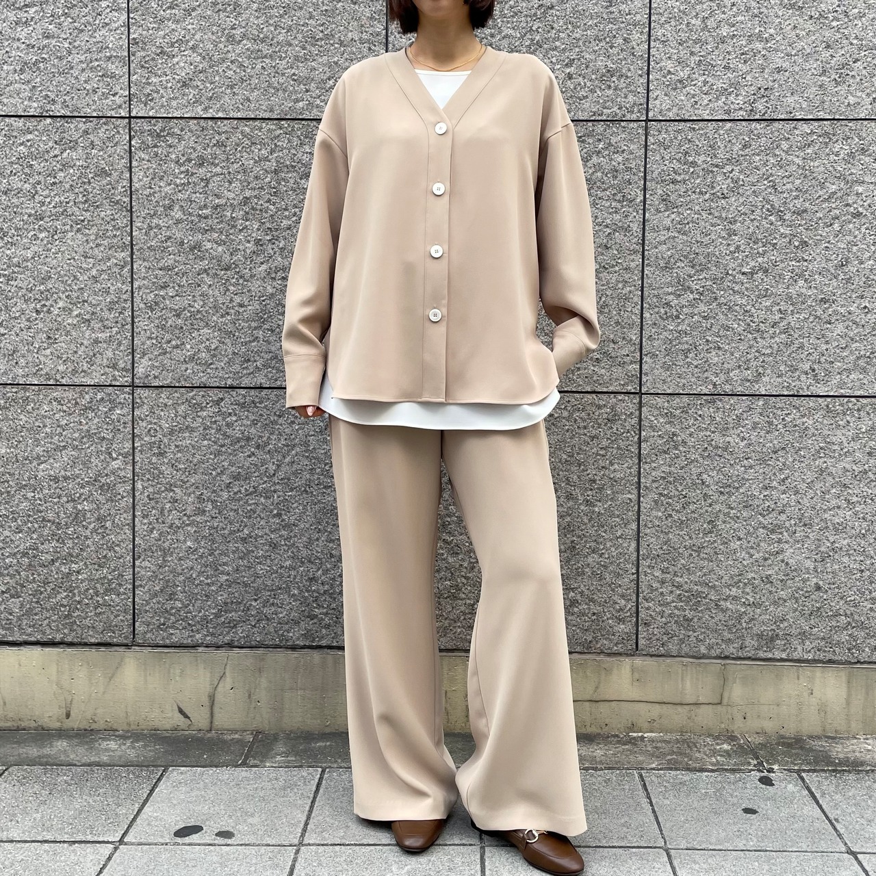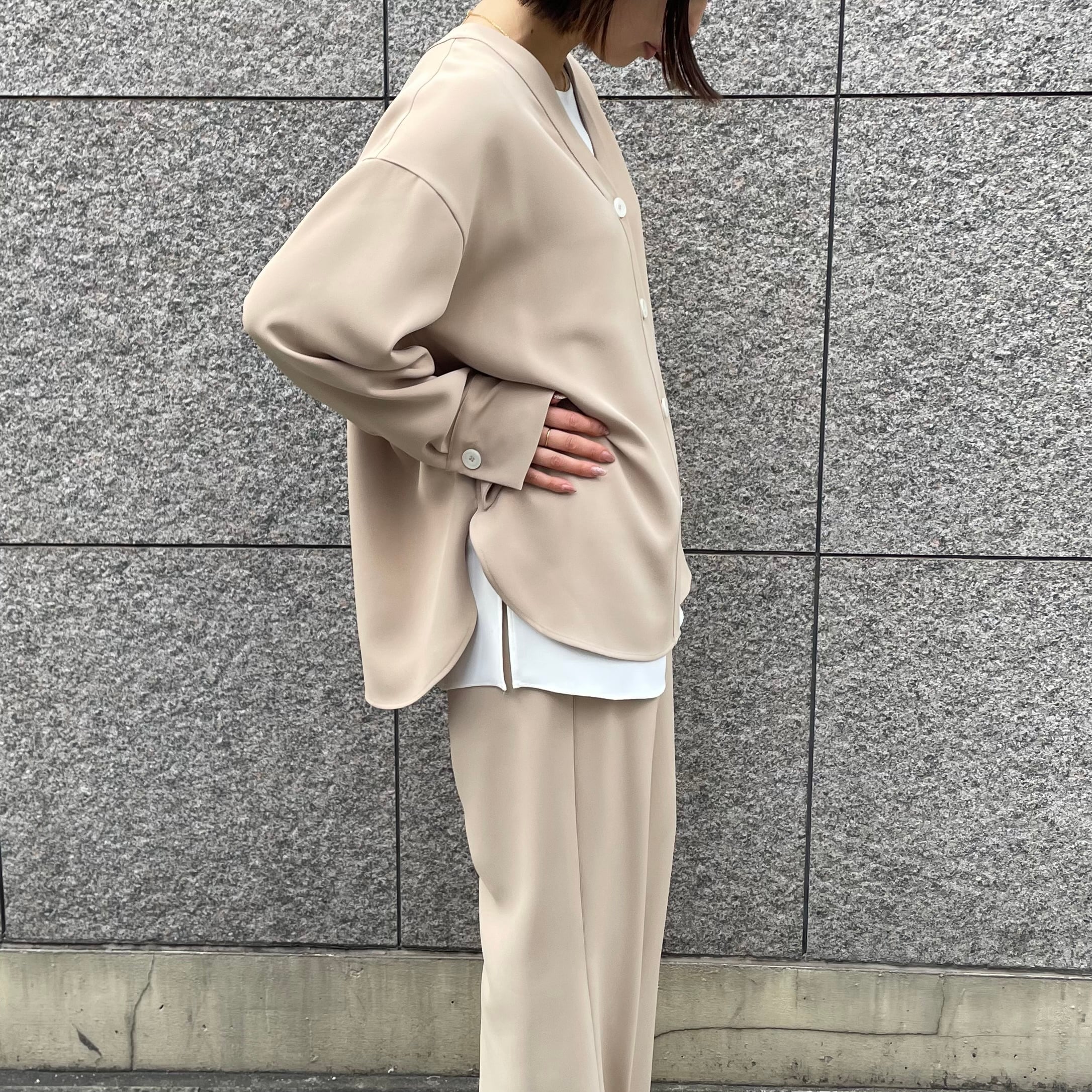 同素材のセットアップでの着用もおすすめです。