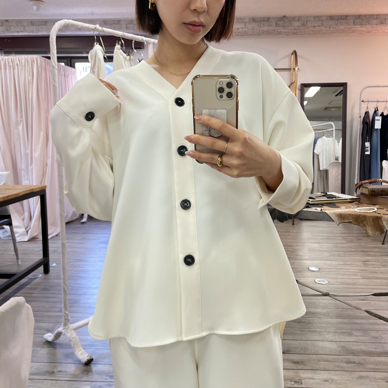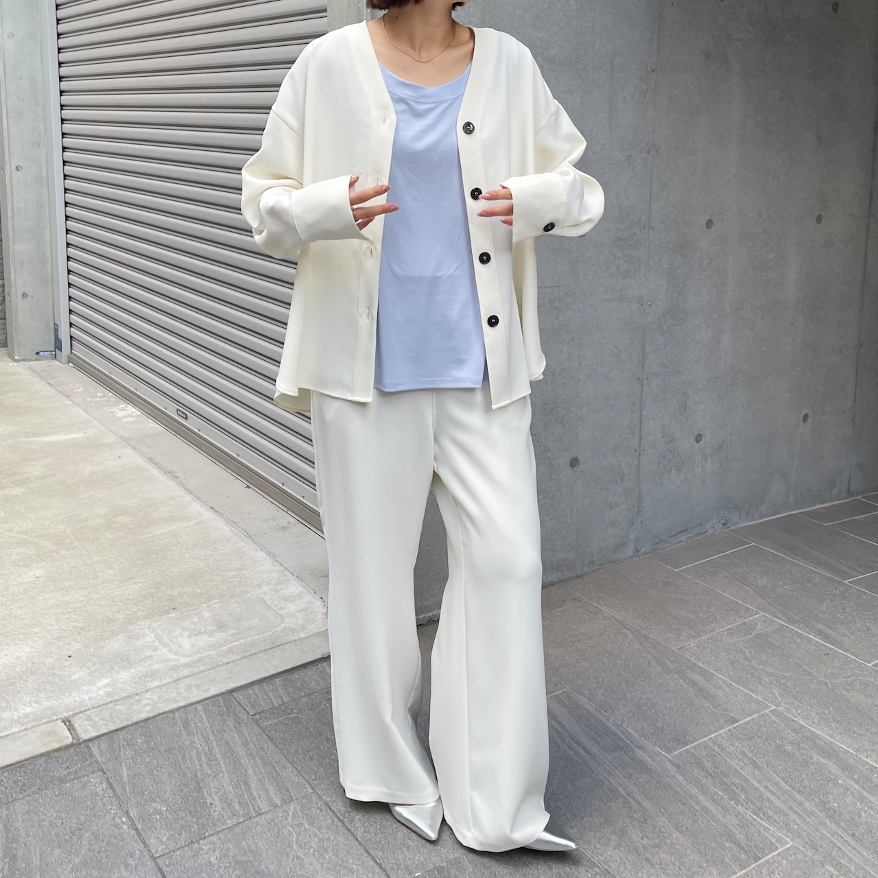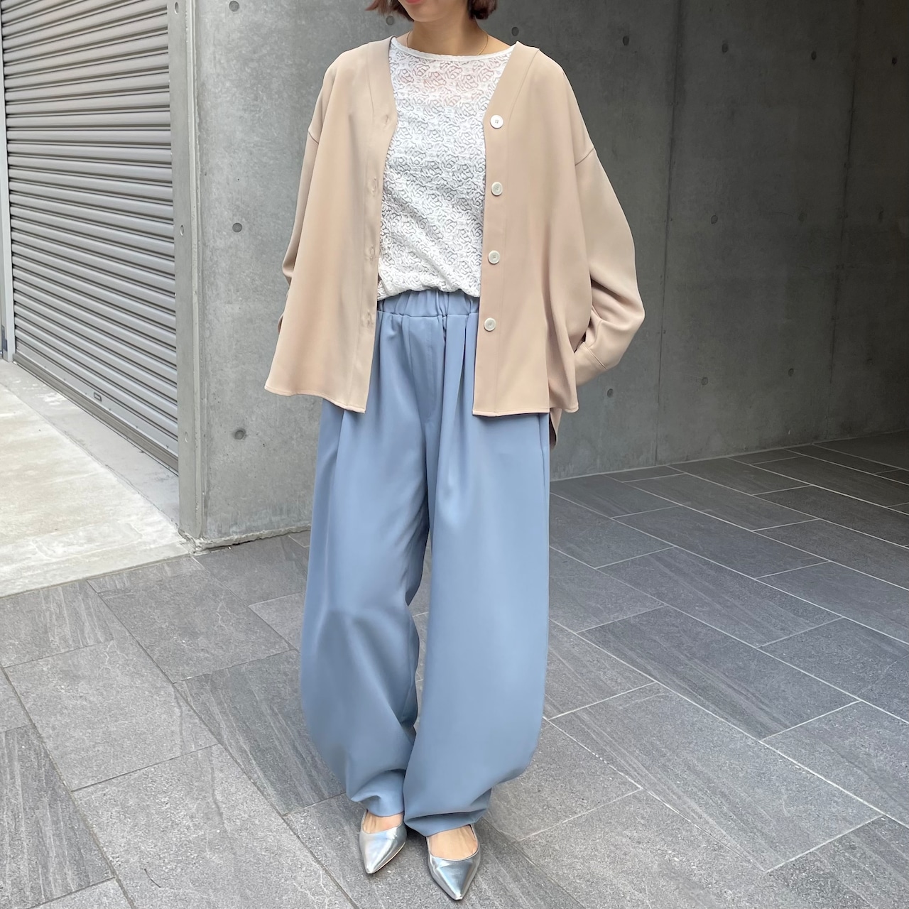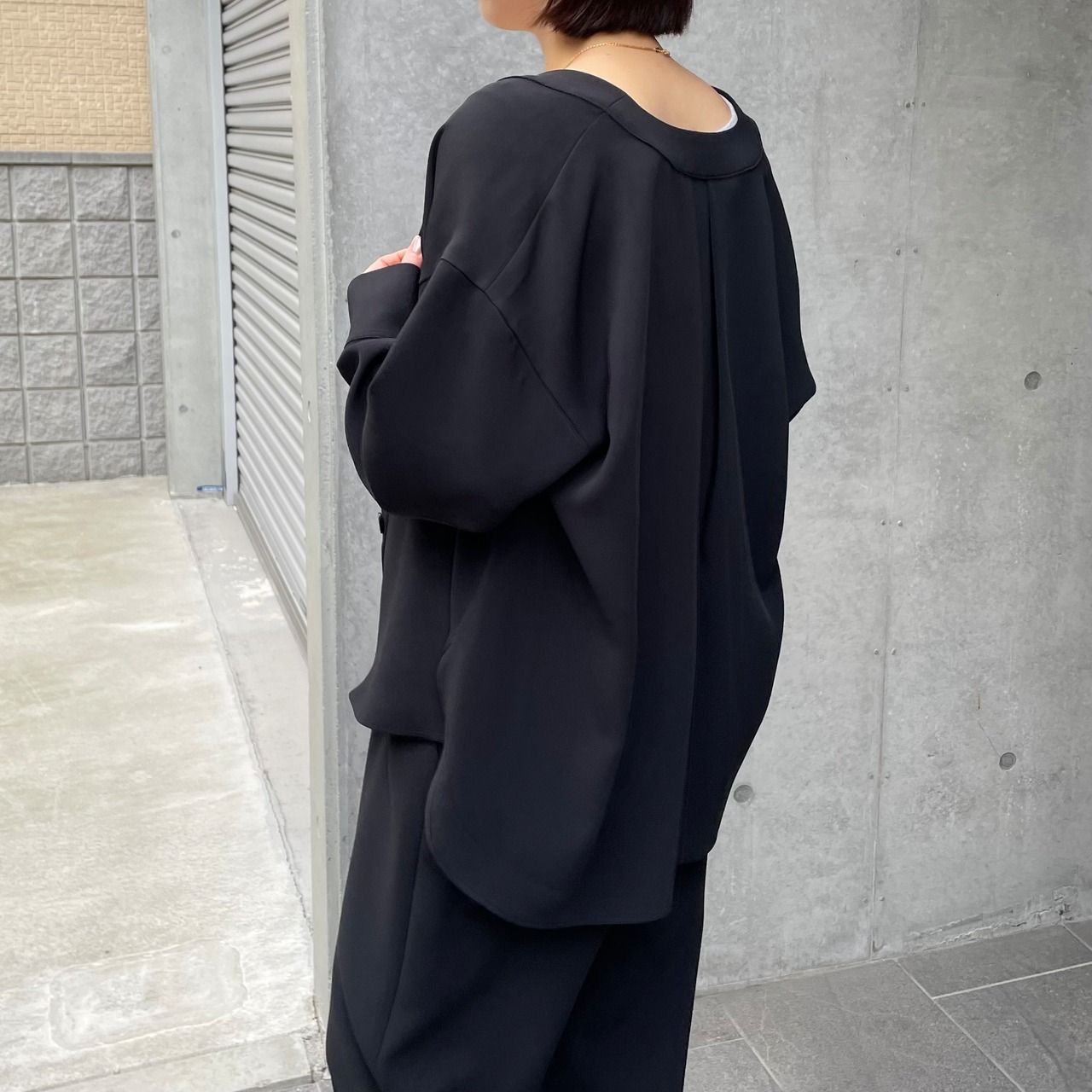 同素材のセットアップでの着用もおすすめです。