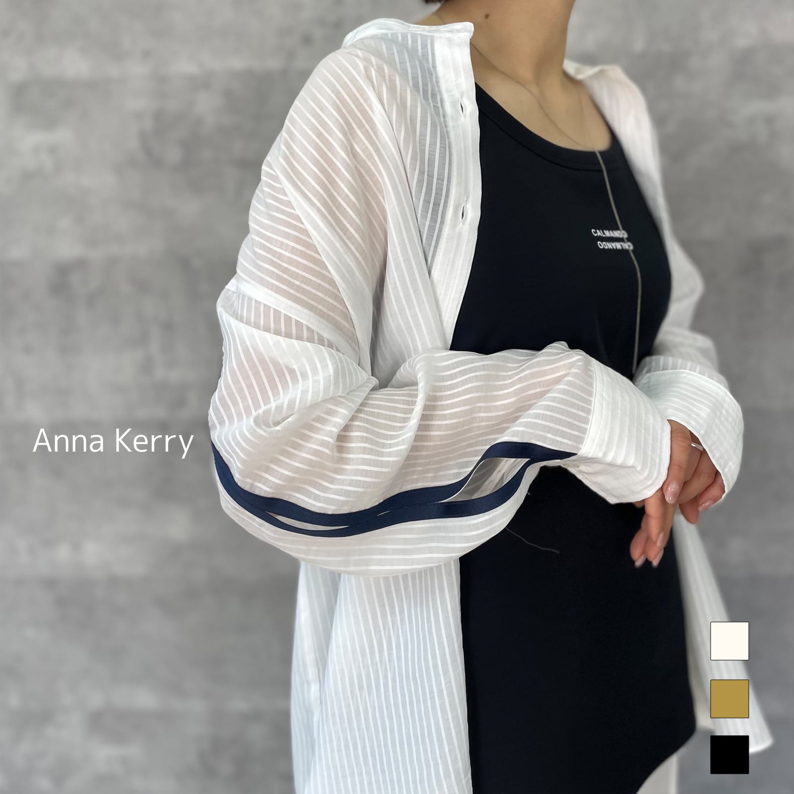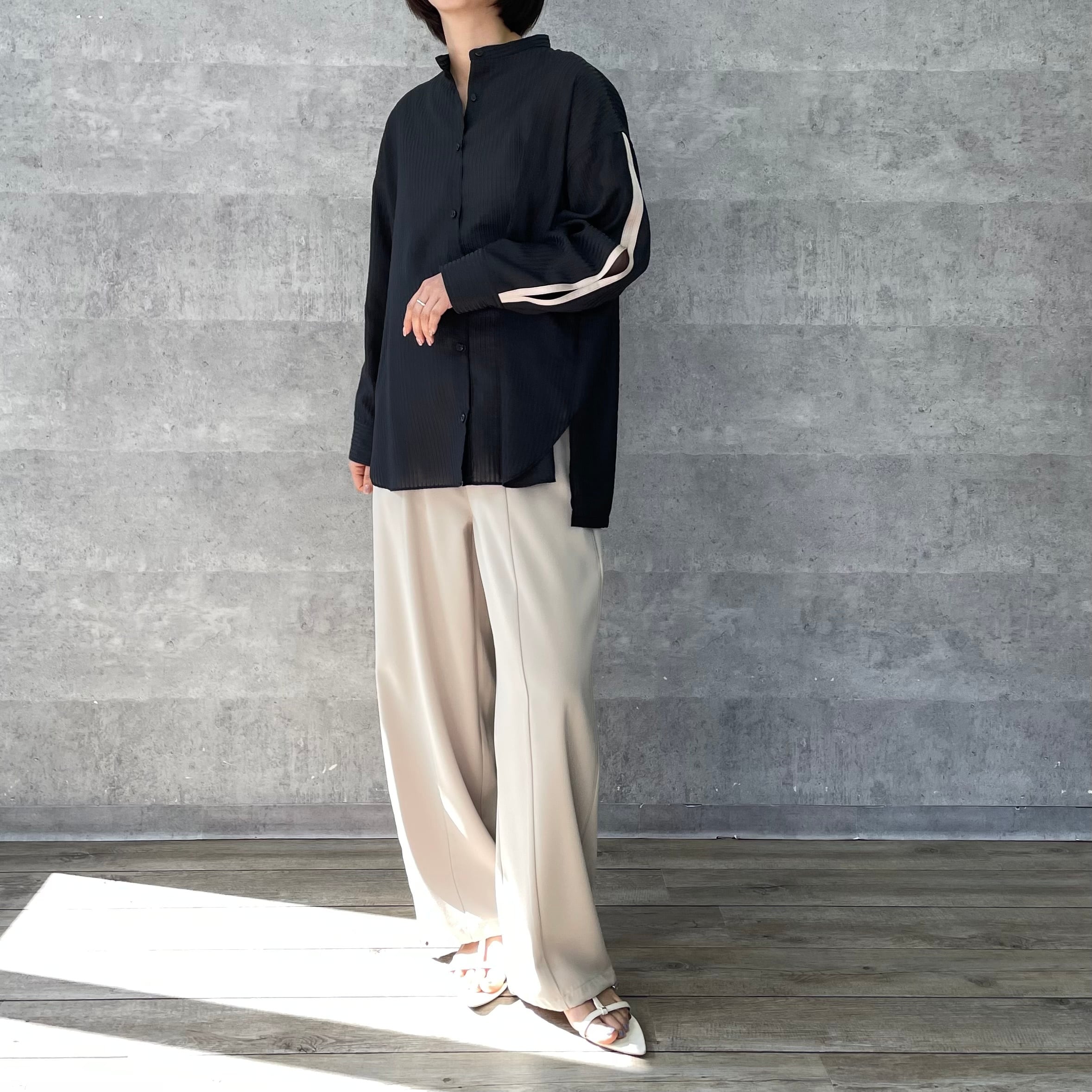 袖のグログランテープから程よくちらっと見える肌が春夏らしいヘルシーな印象に