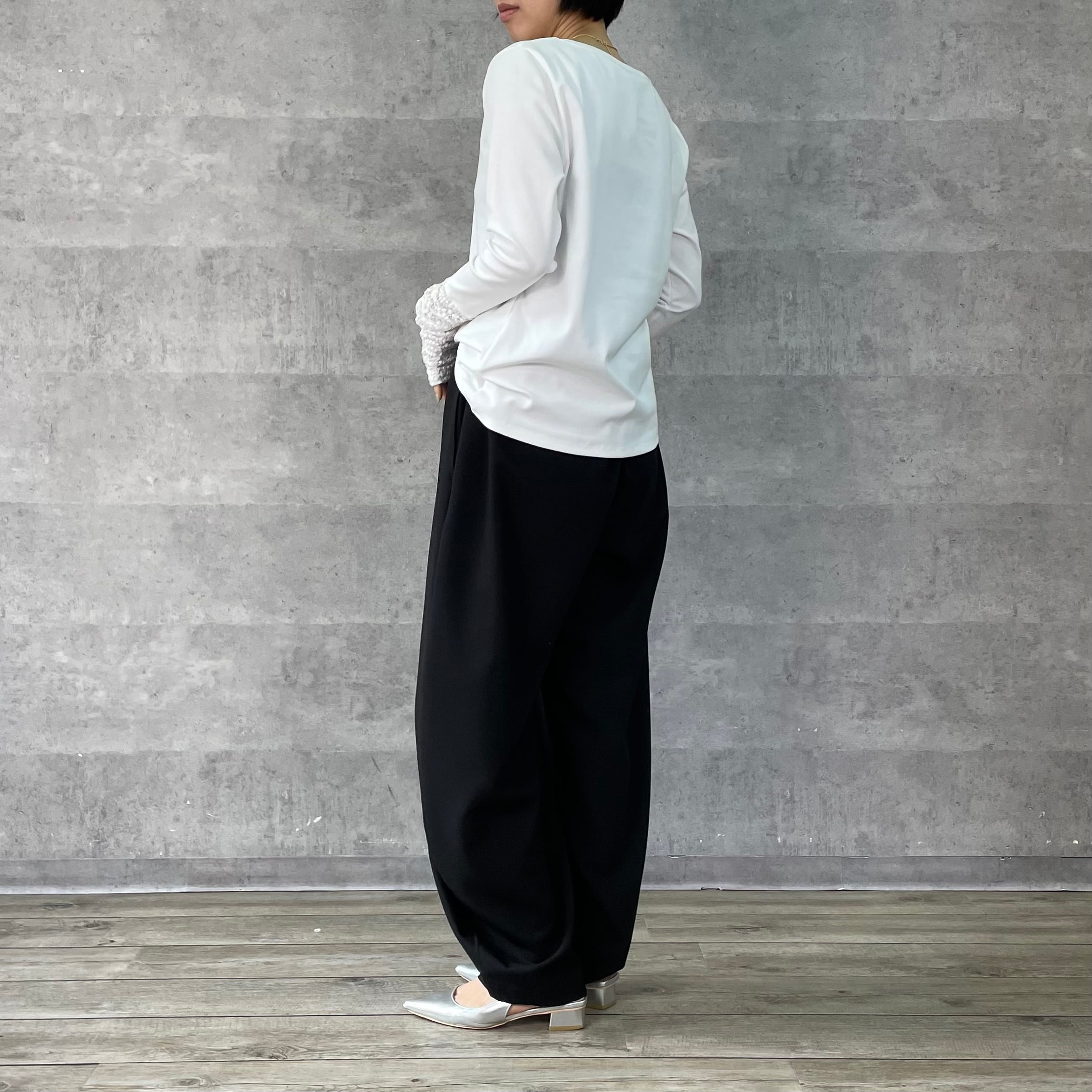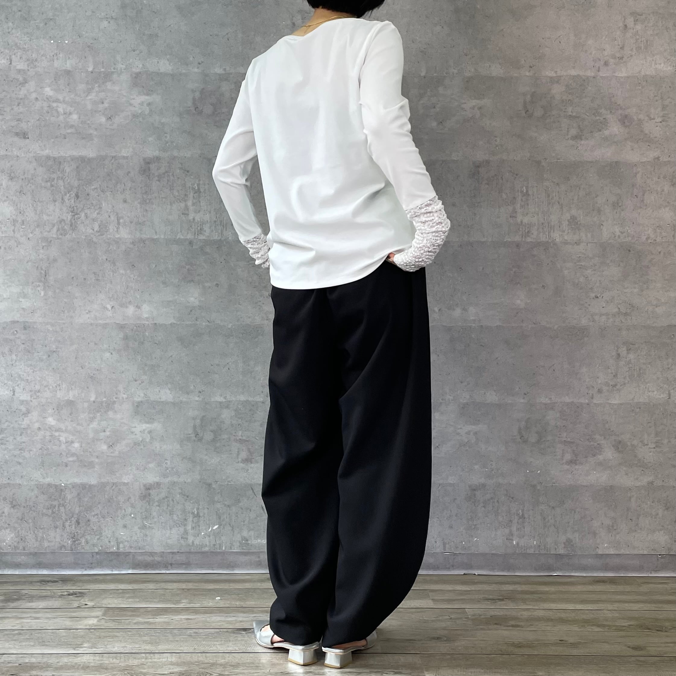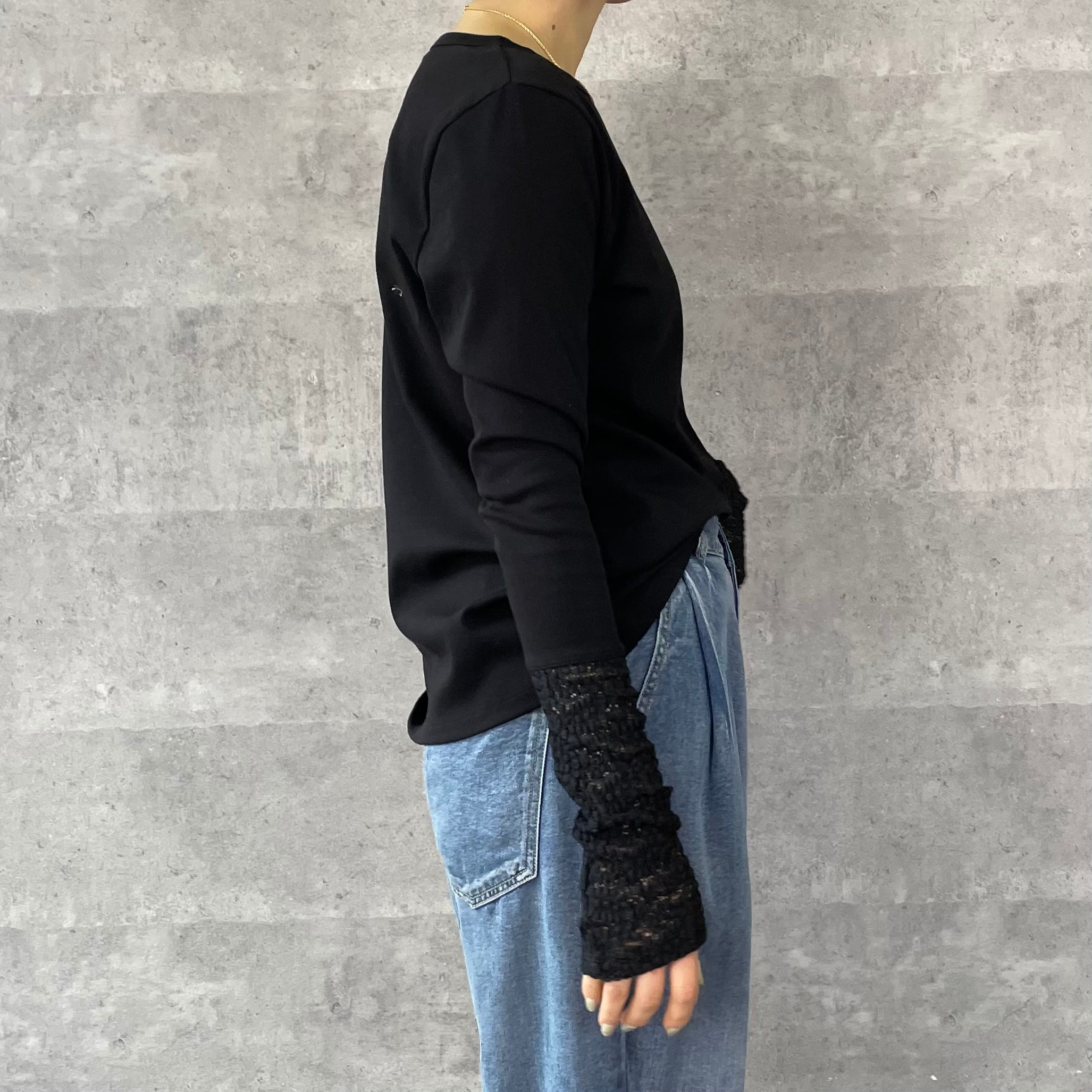 すっきりとしたシルエットと袖口のレース切替が女性らしく抜け感をプラスします。