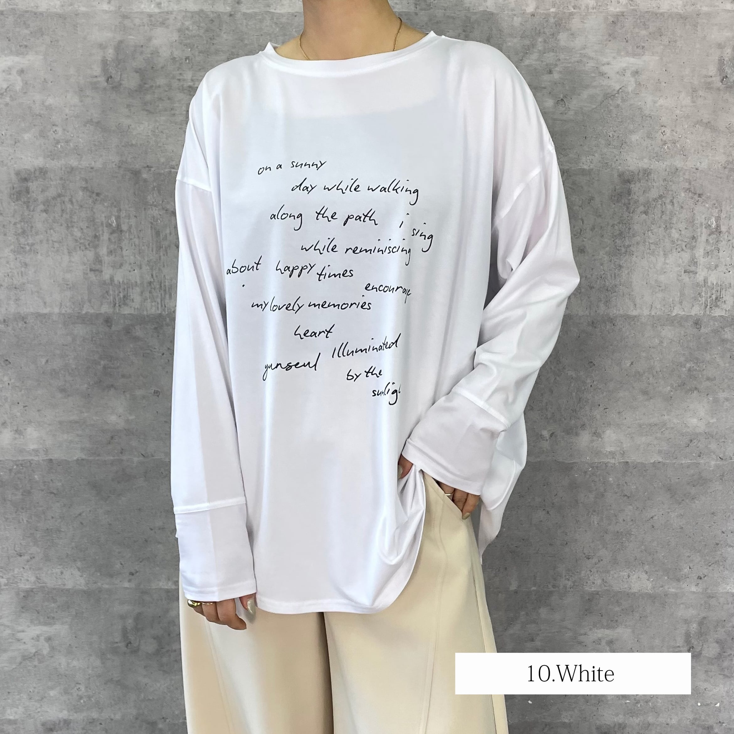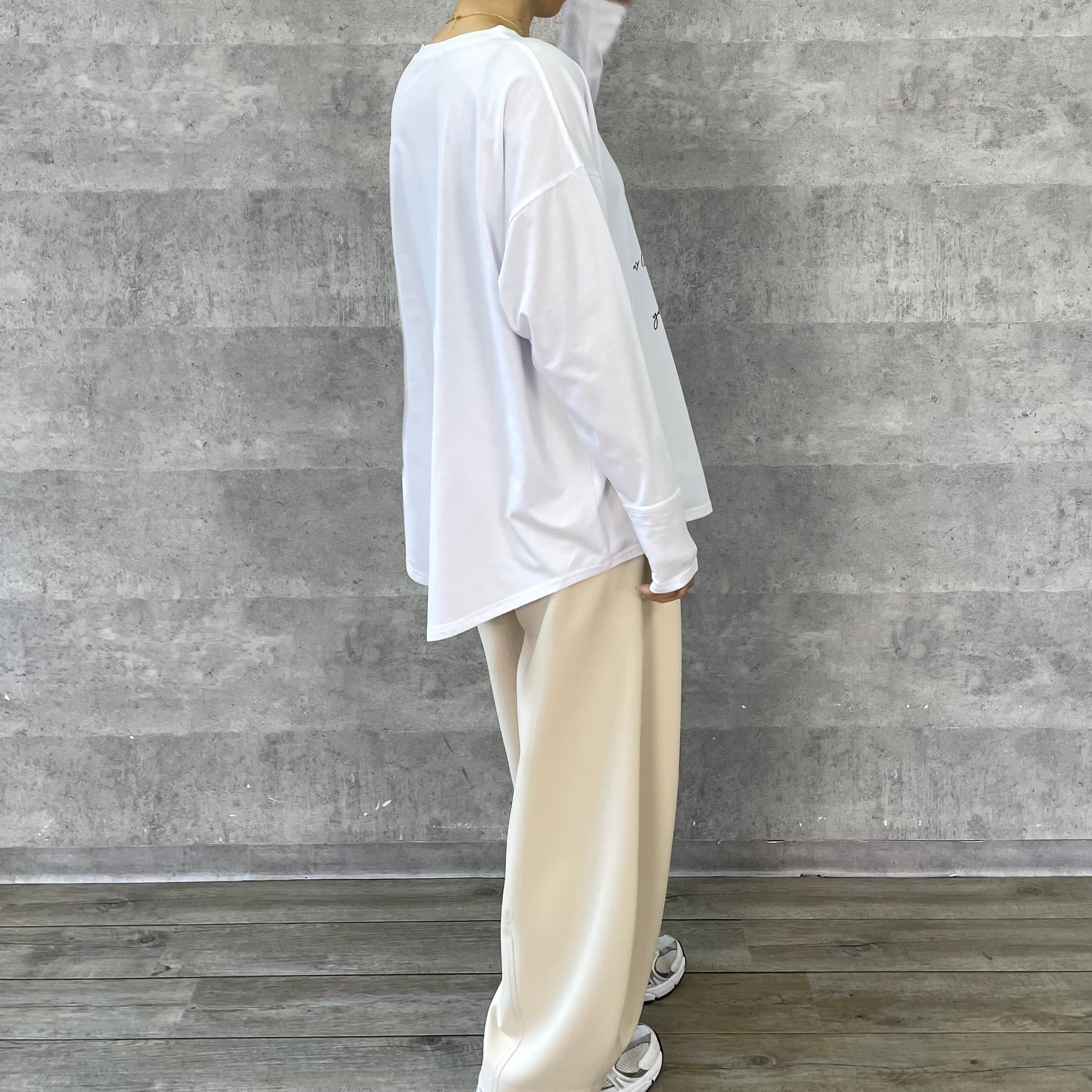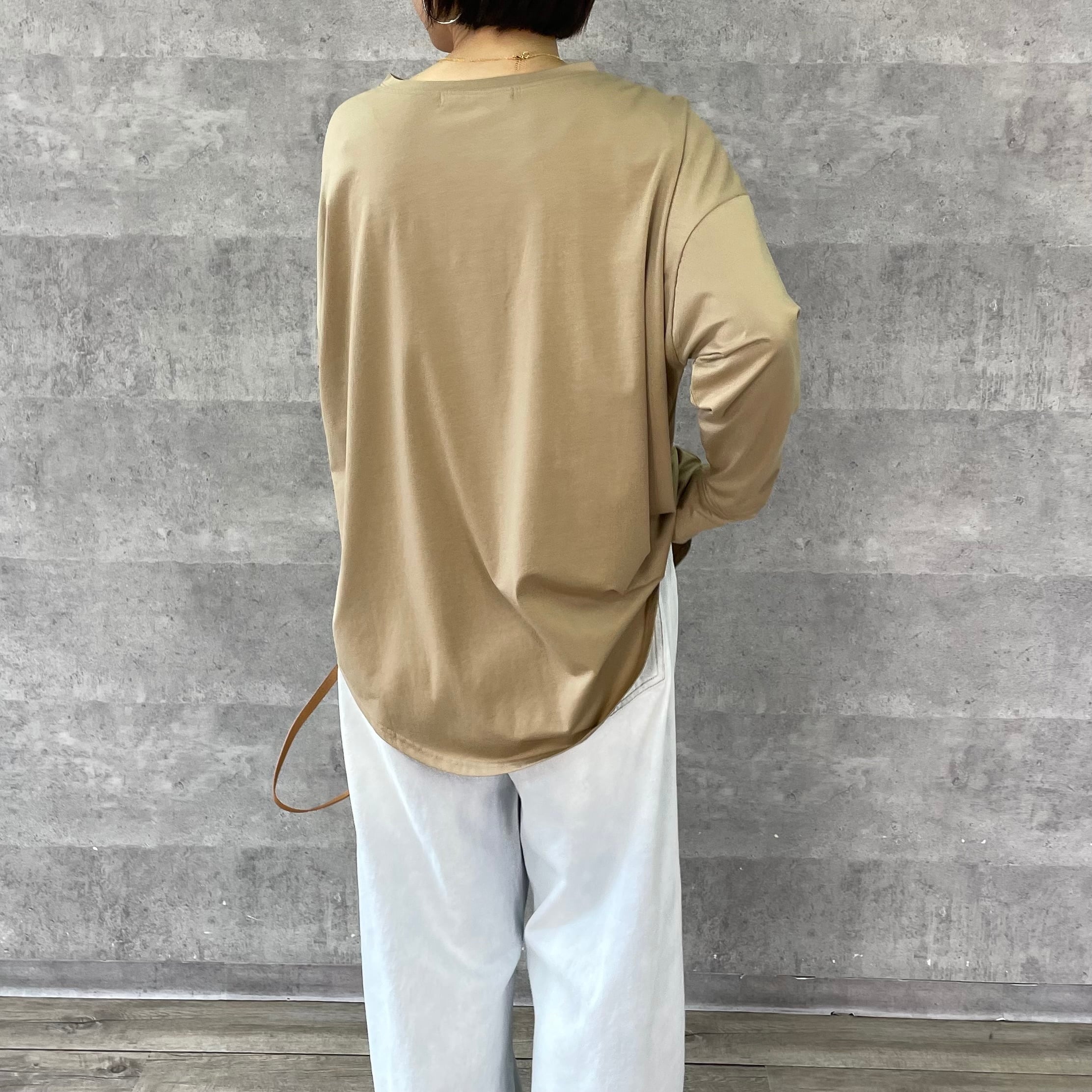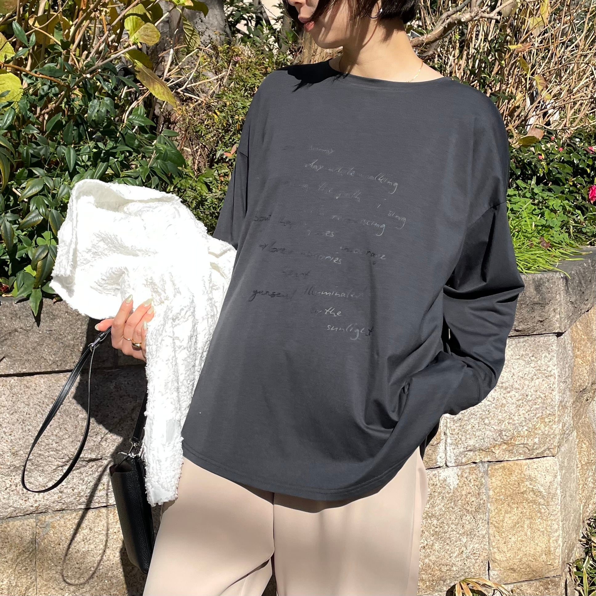 ゆったりルーズなシルエットに手書き風のロゴプリントを施したリラックス感のあるロンT