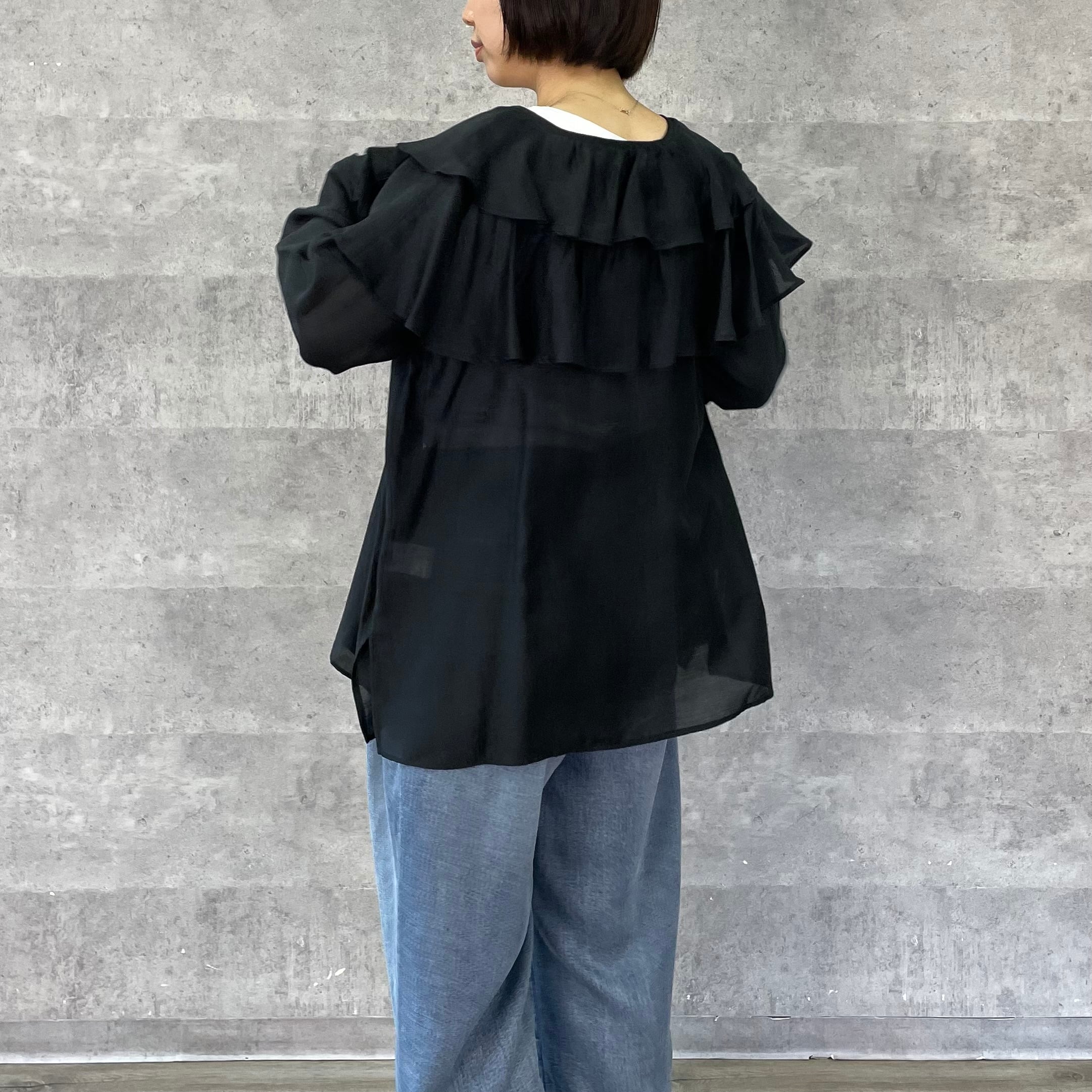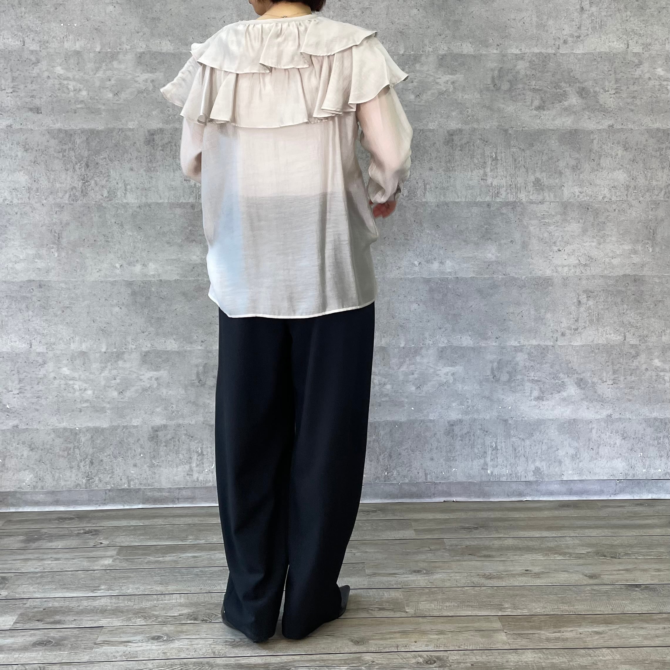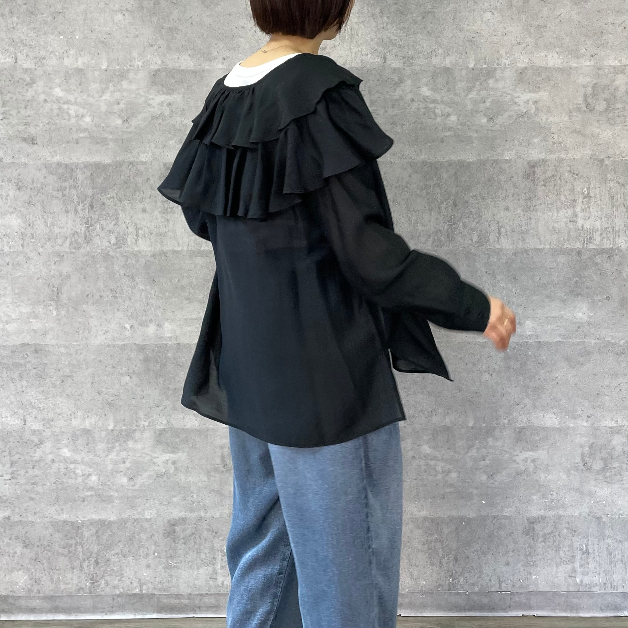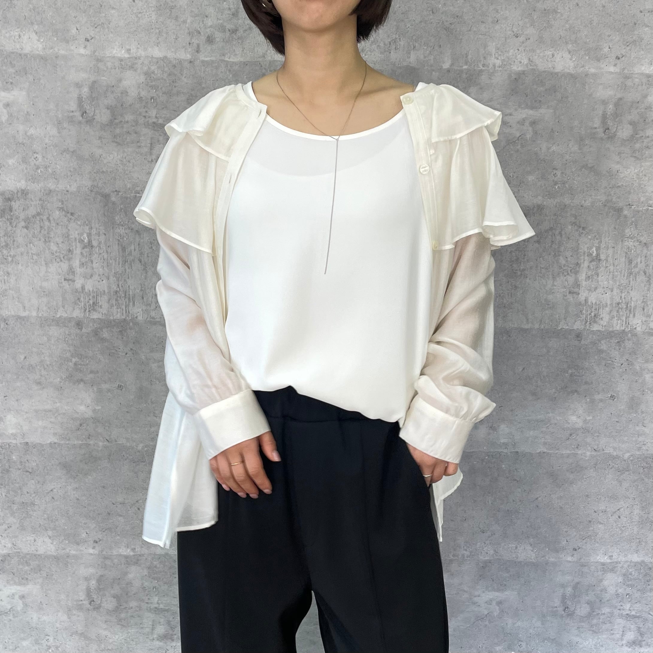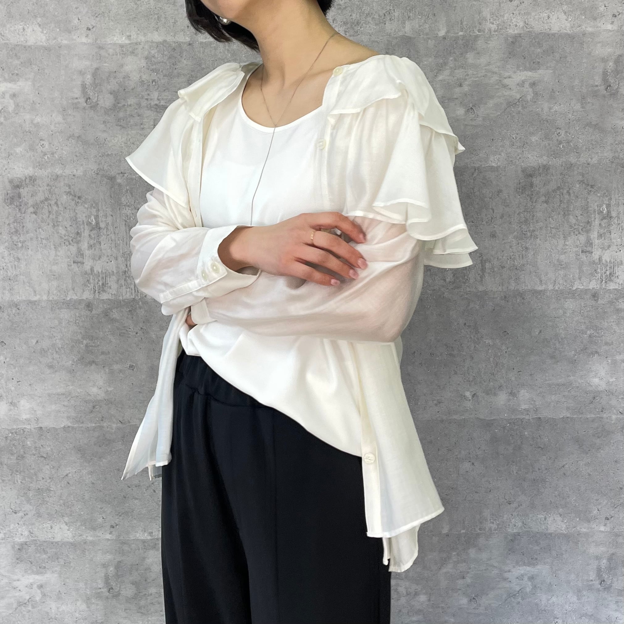 肩に大ぶりなフリルをあしらっており一枚あるだけでスタイリングが華やぐアイテムです