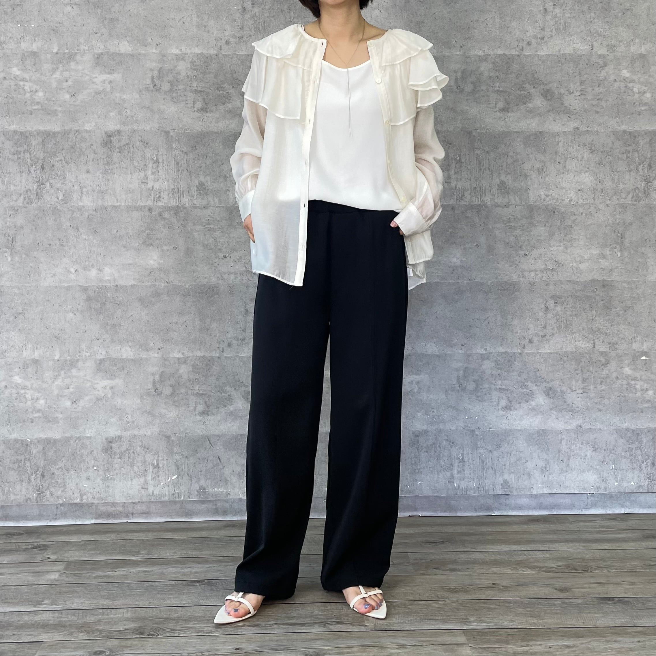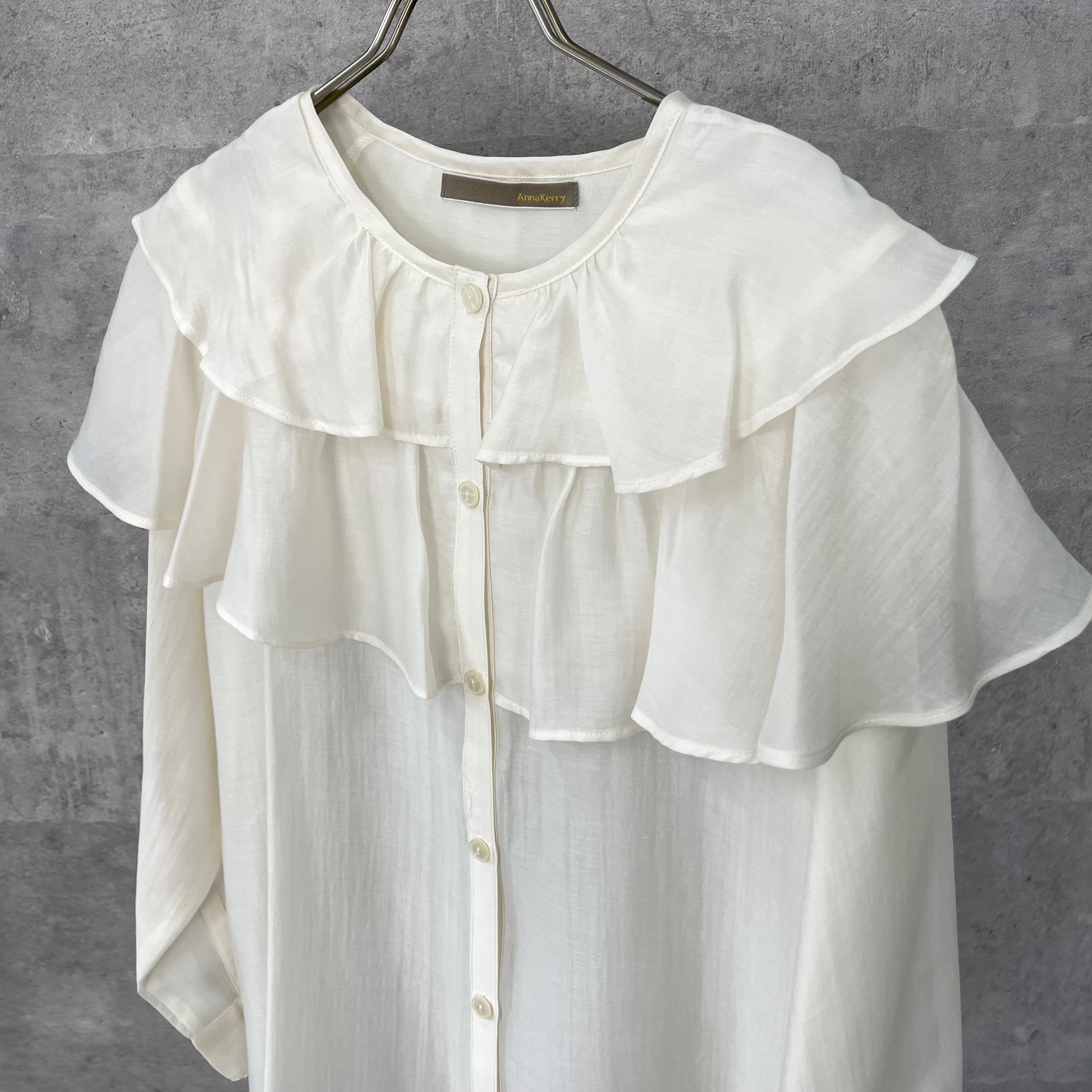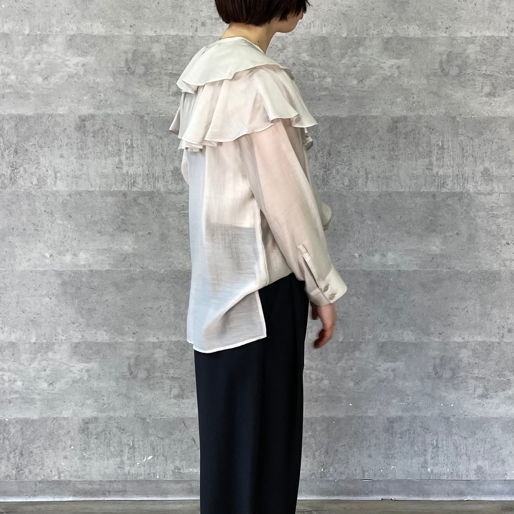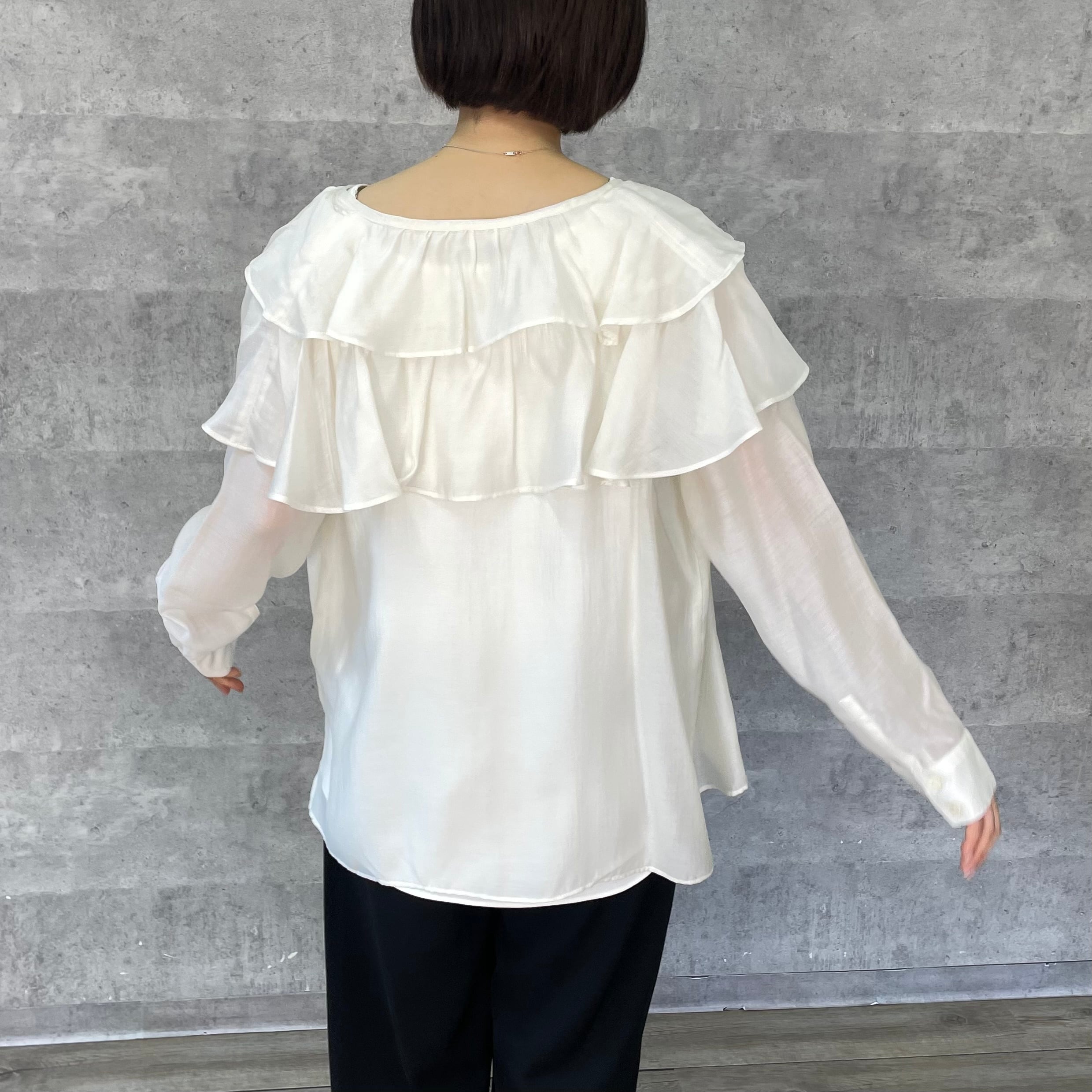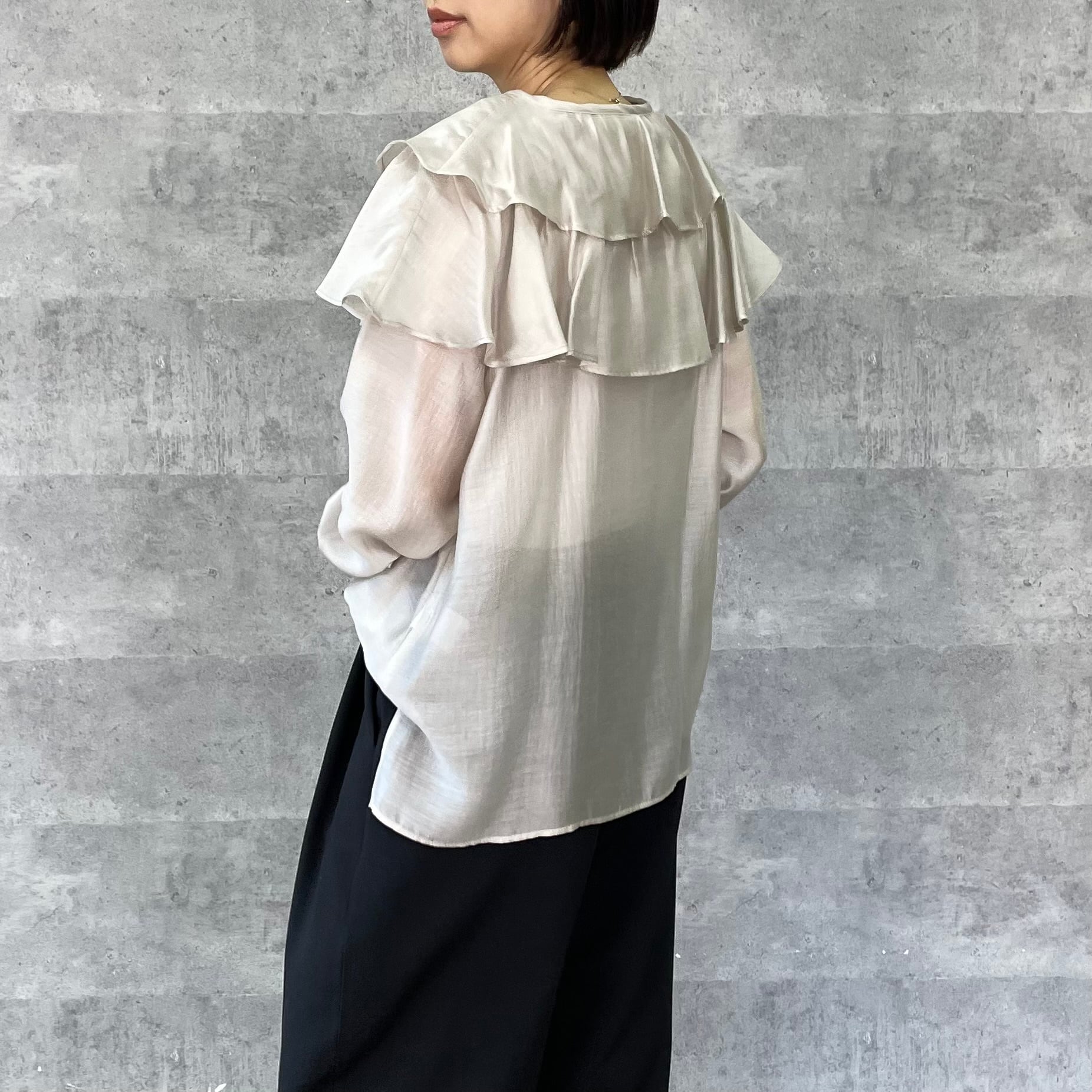 肩に大ぶりなフリルをあしらっており一枚あるだけでスタイリングが華やぐアイテムです