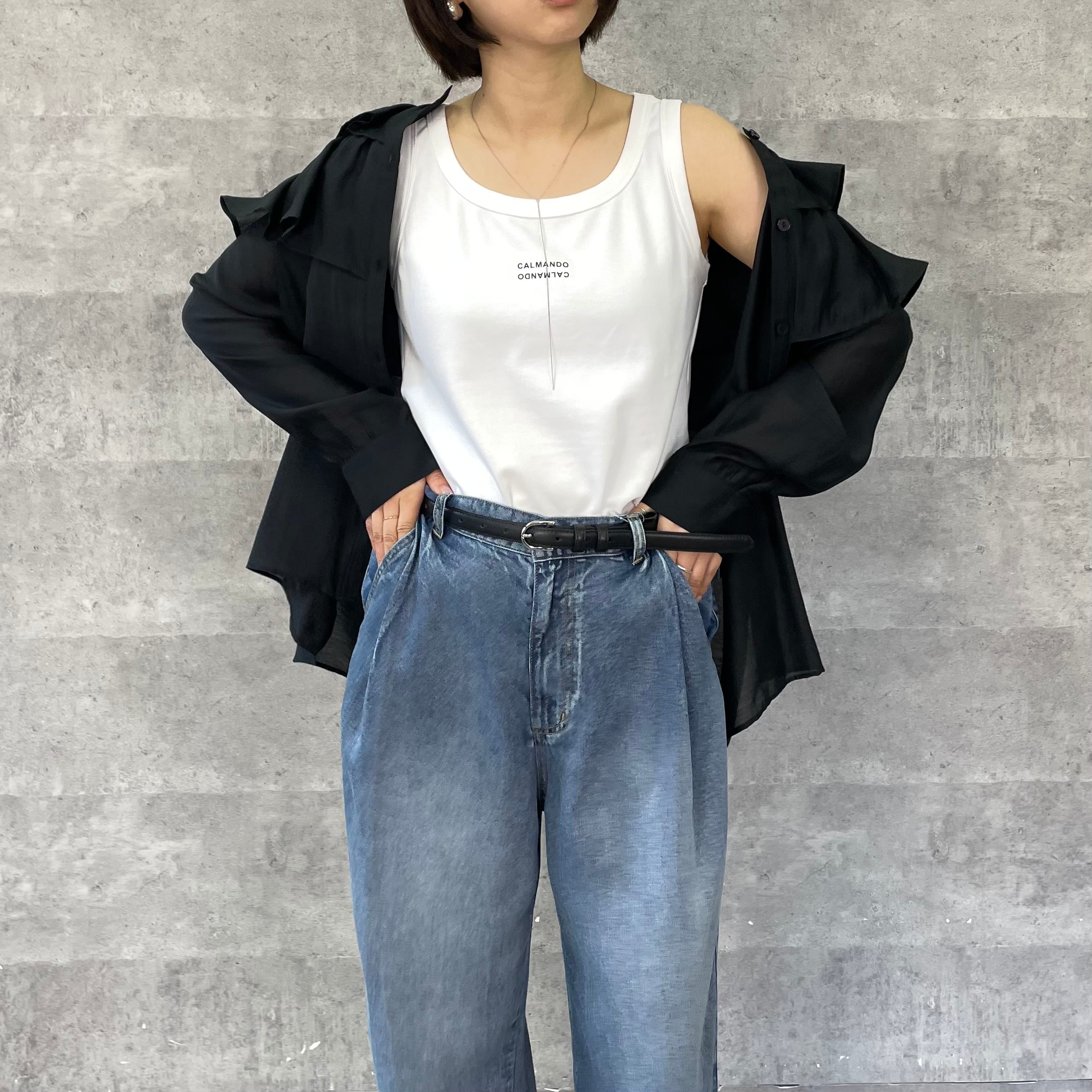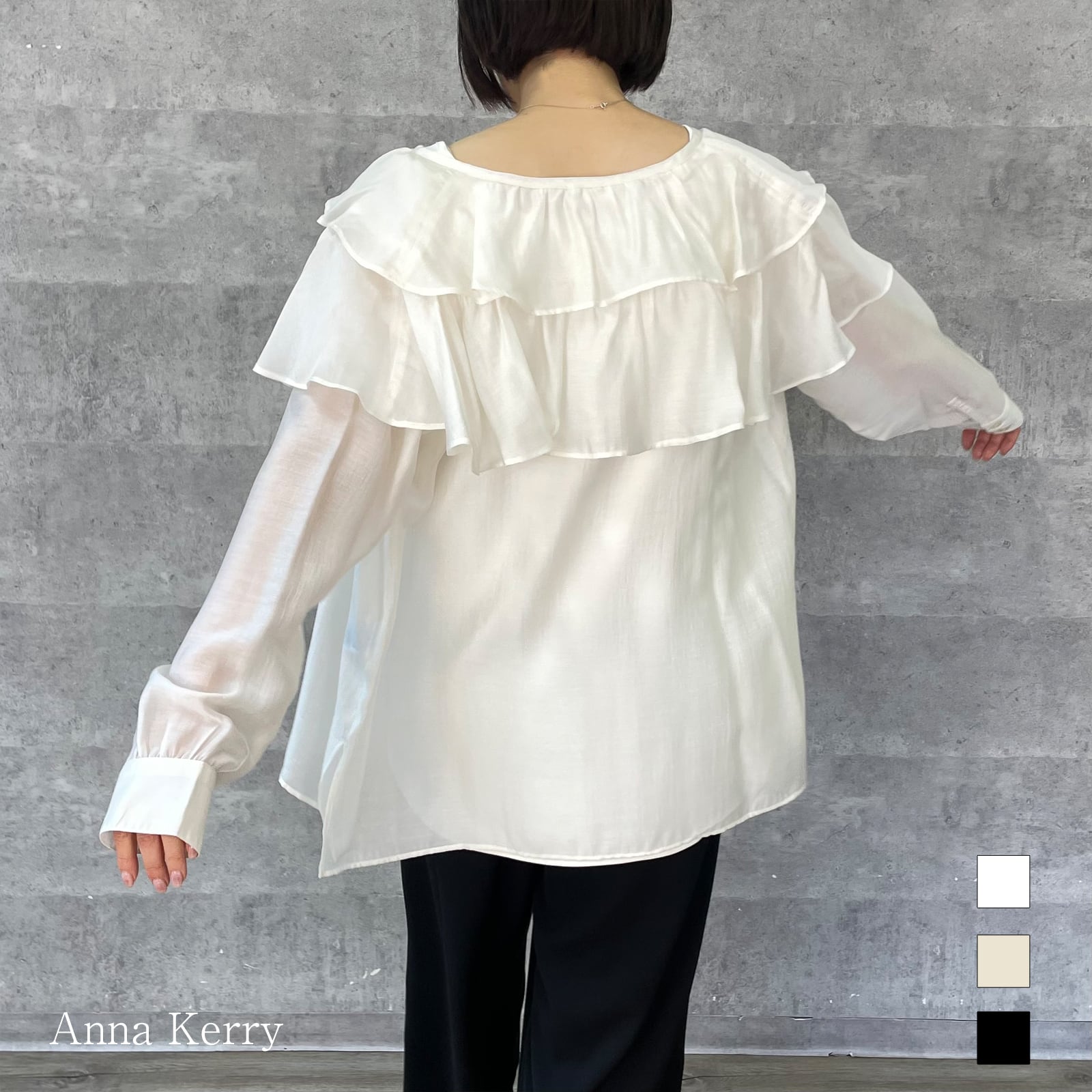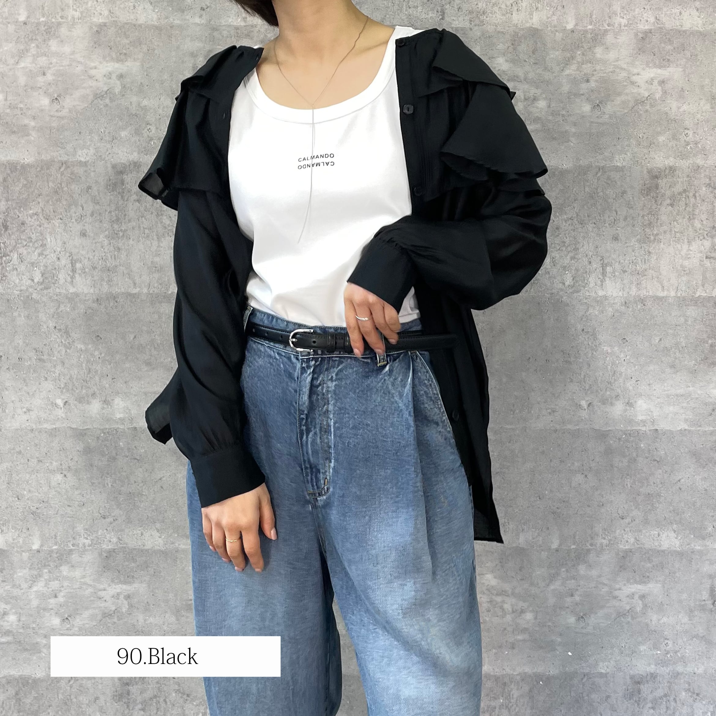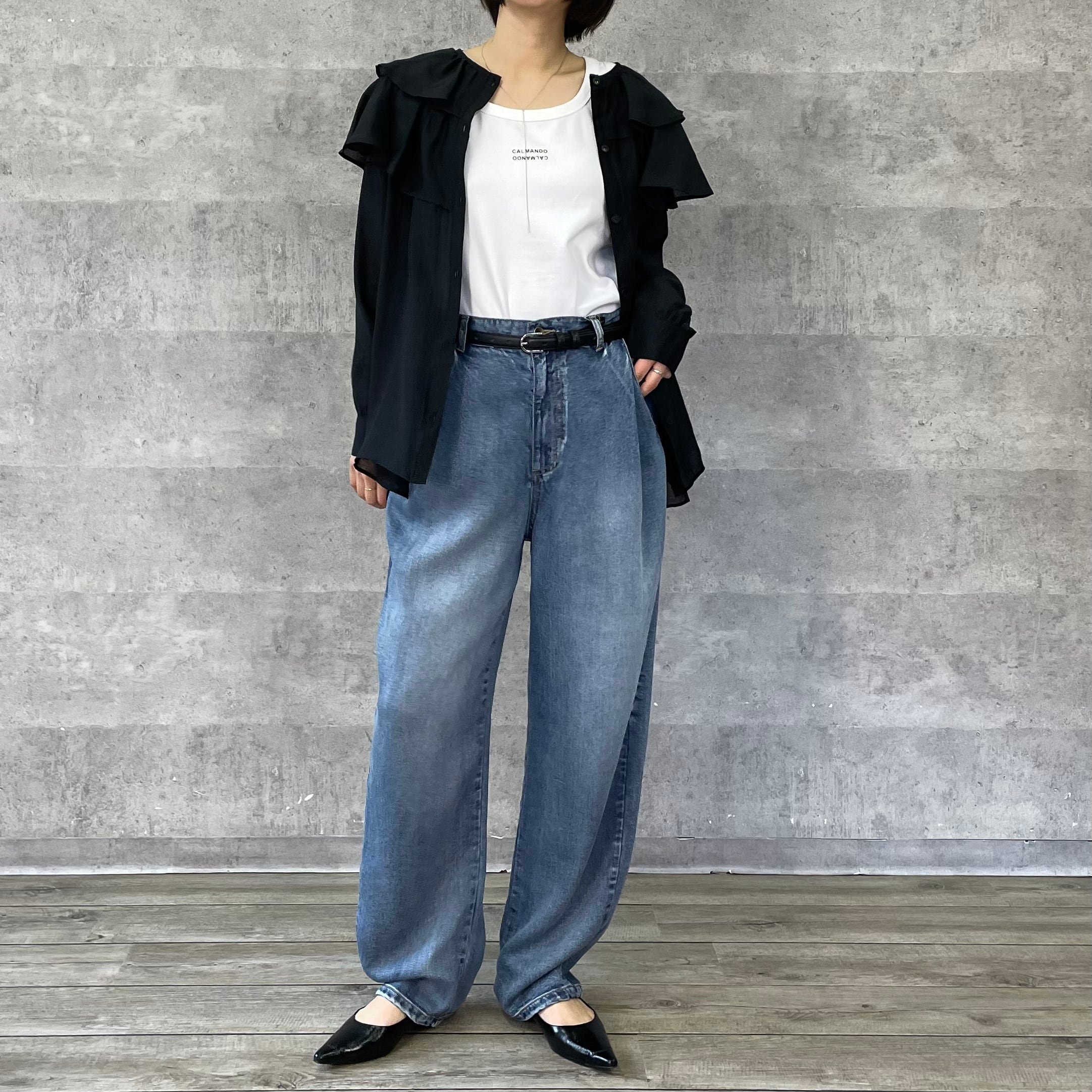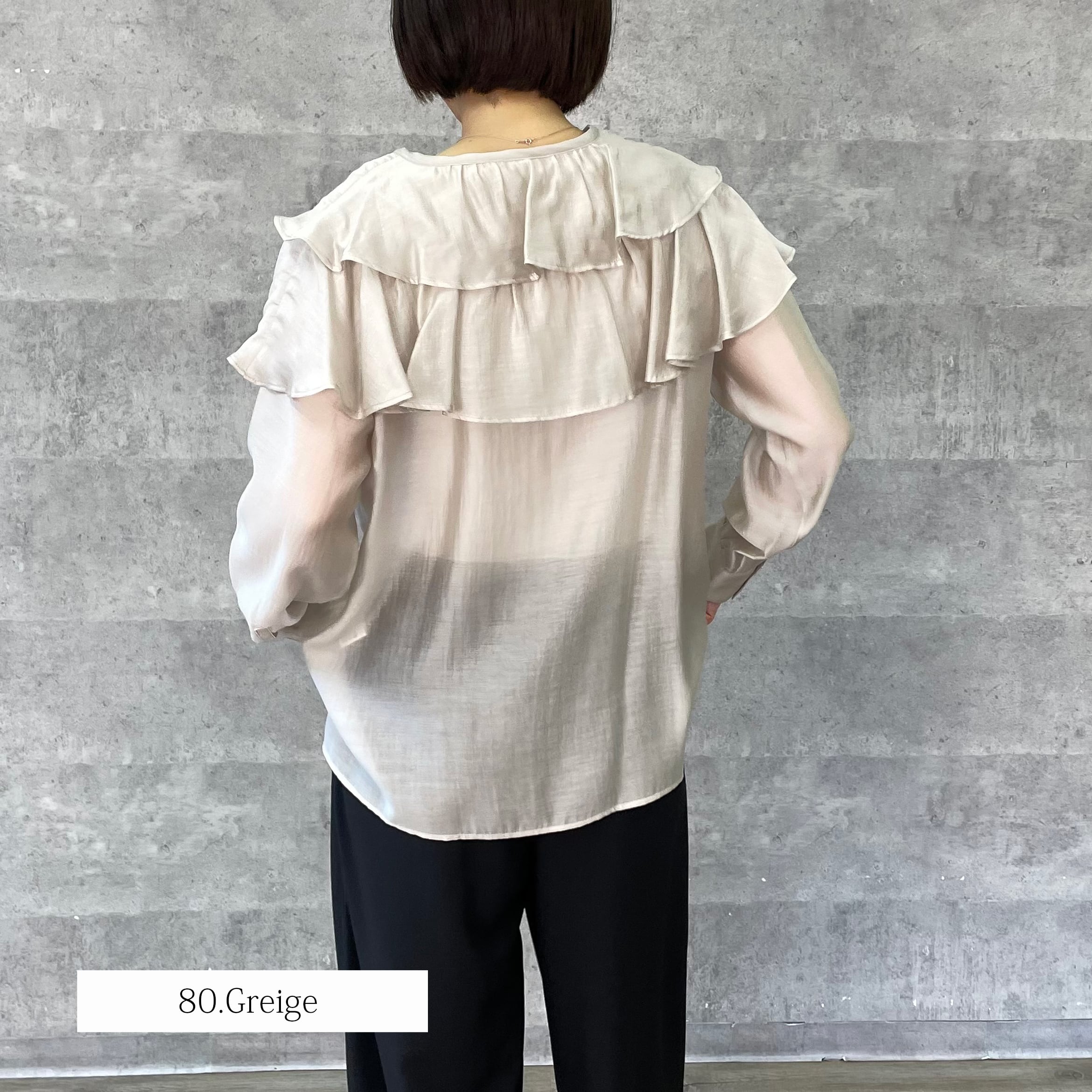 肩に大ぶりなフリルをあしらっており一枚あるだけでスタイリングが華やぐアイテムです