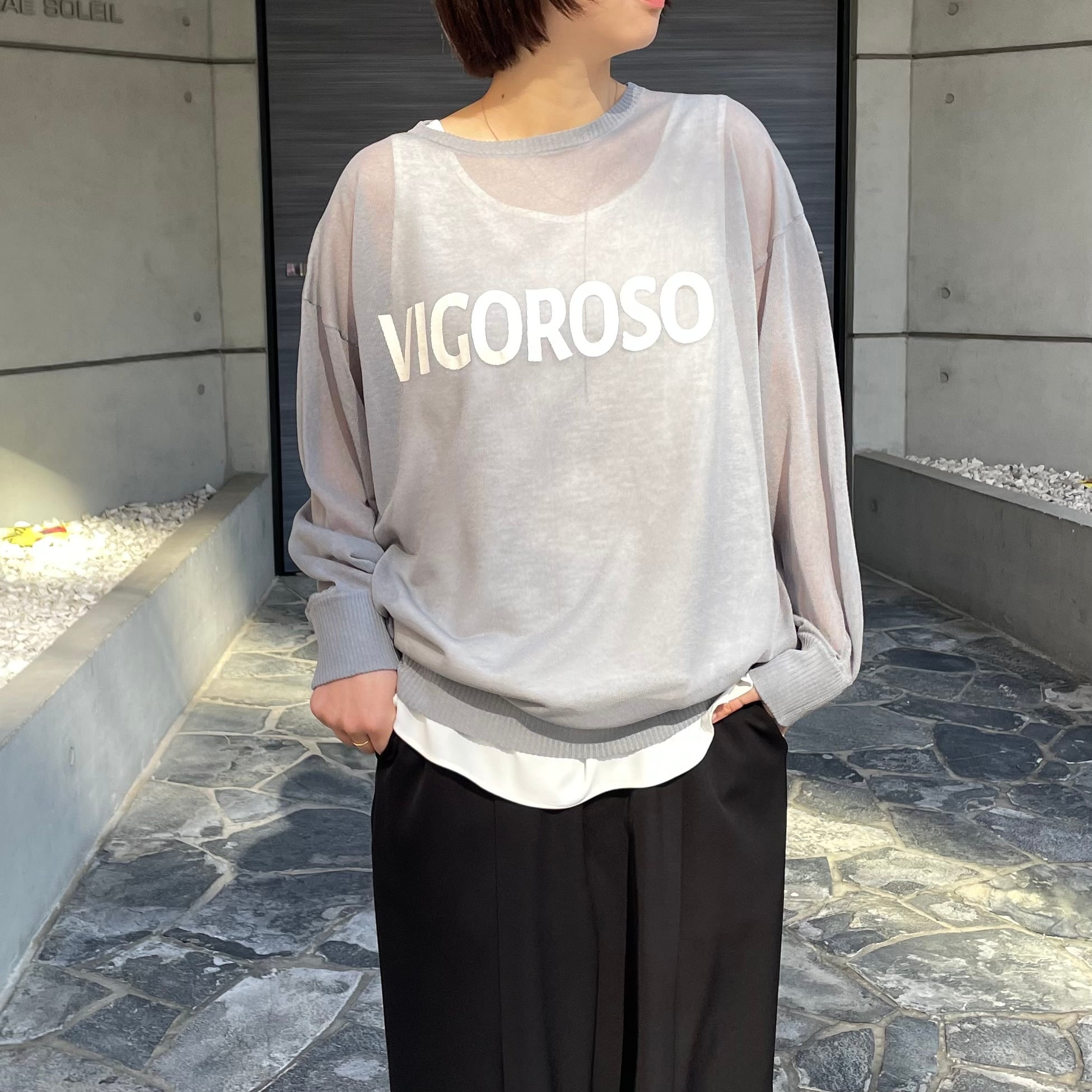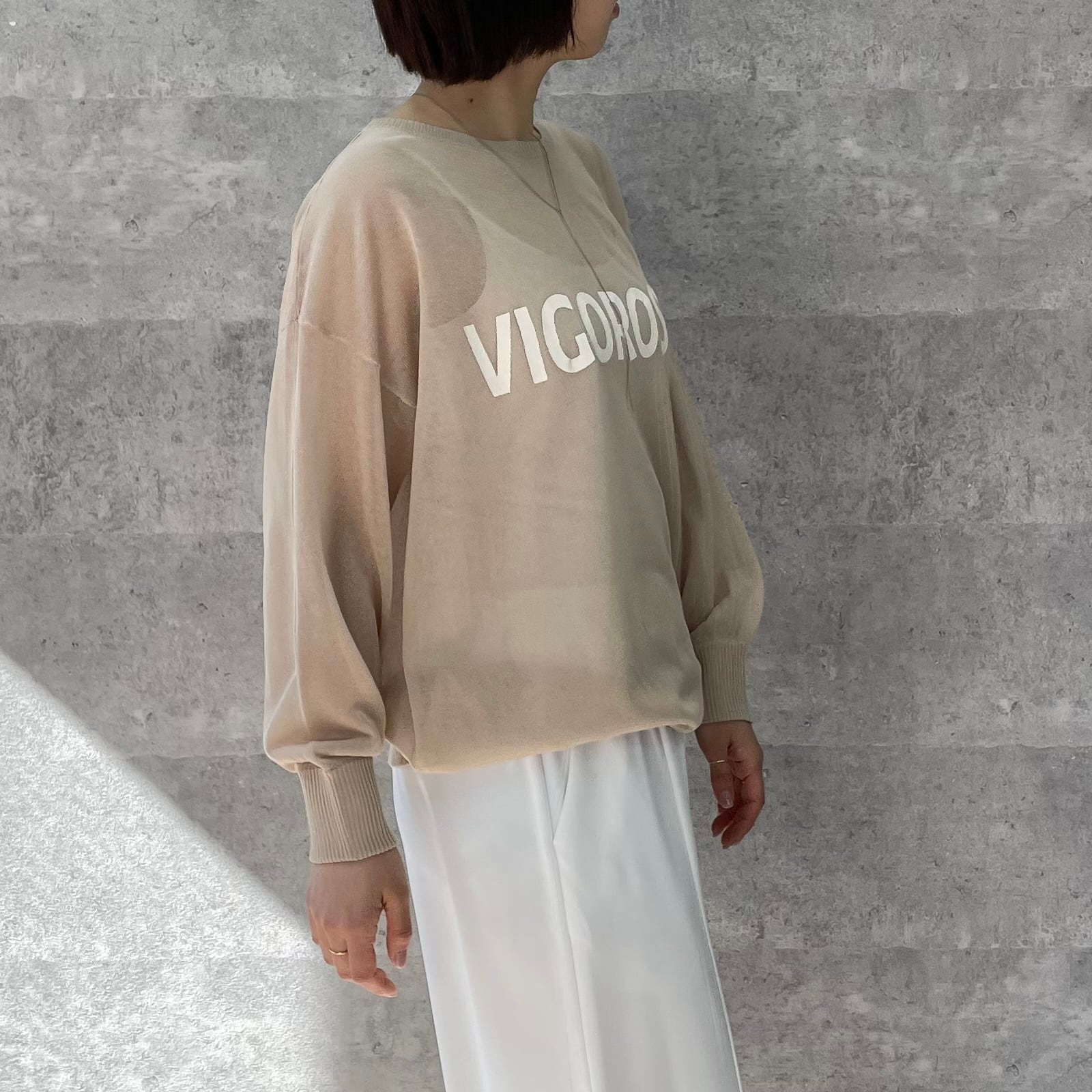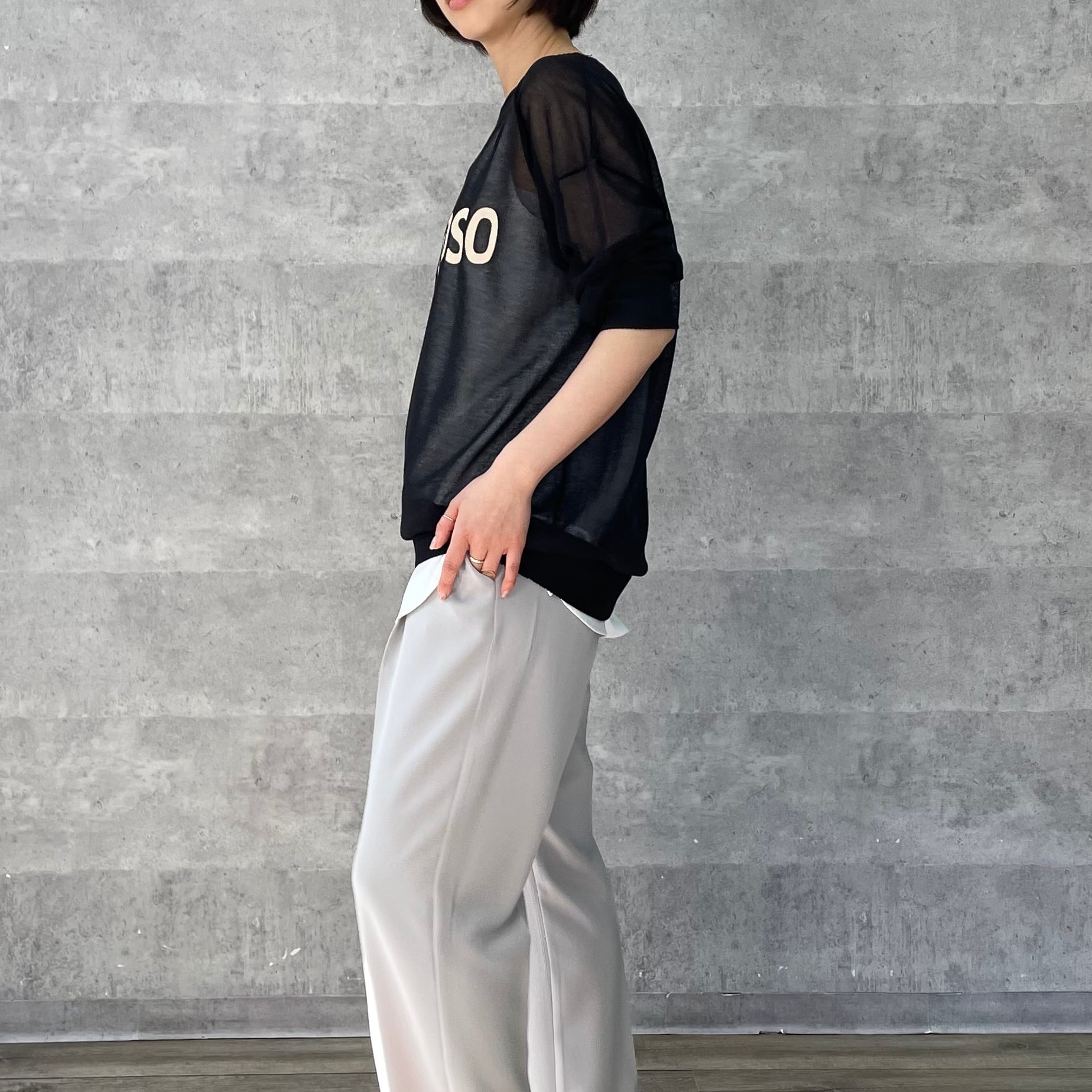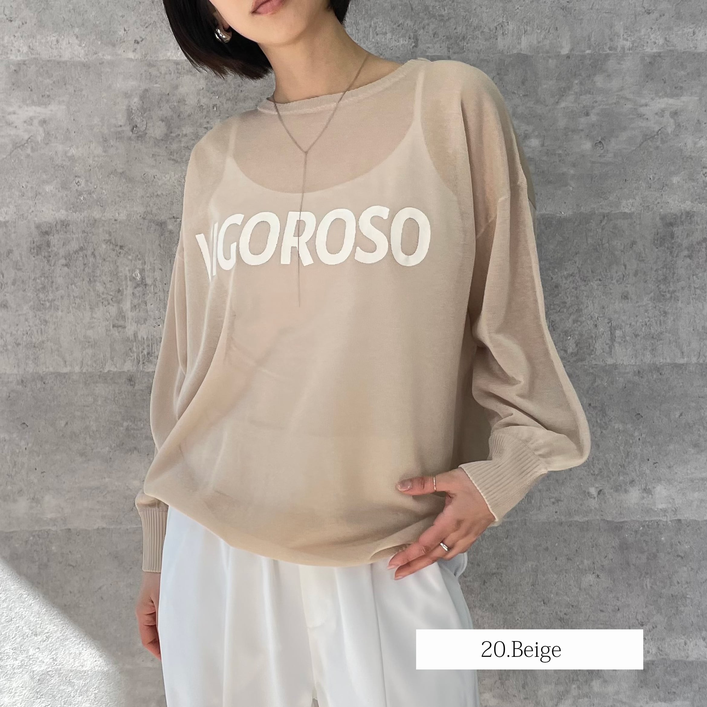 シアー素材のロゴ入りニット