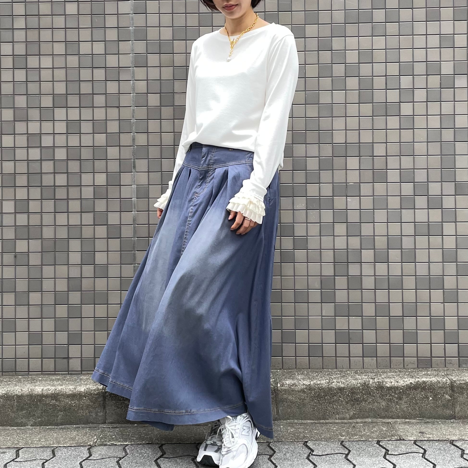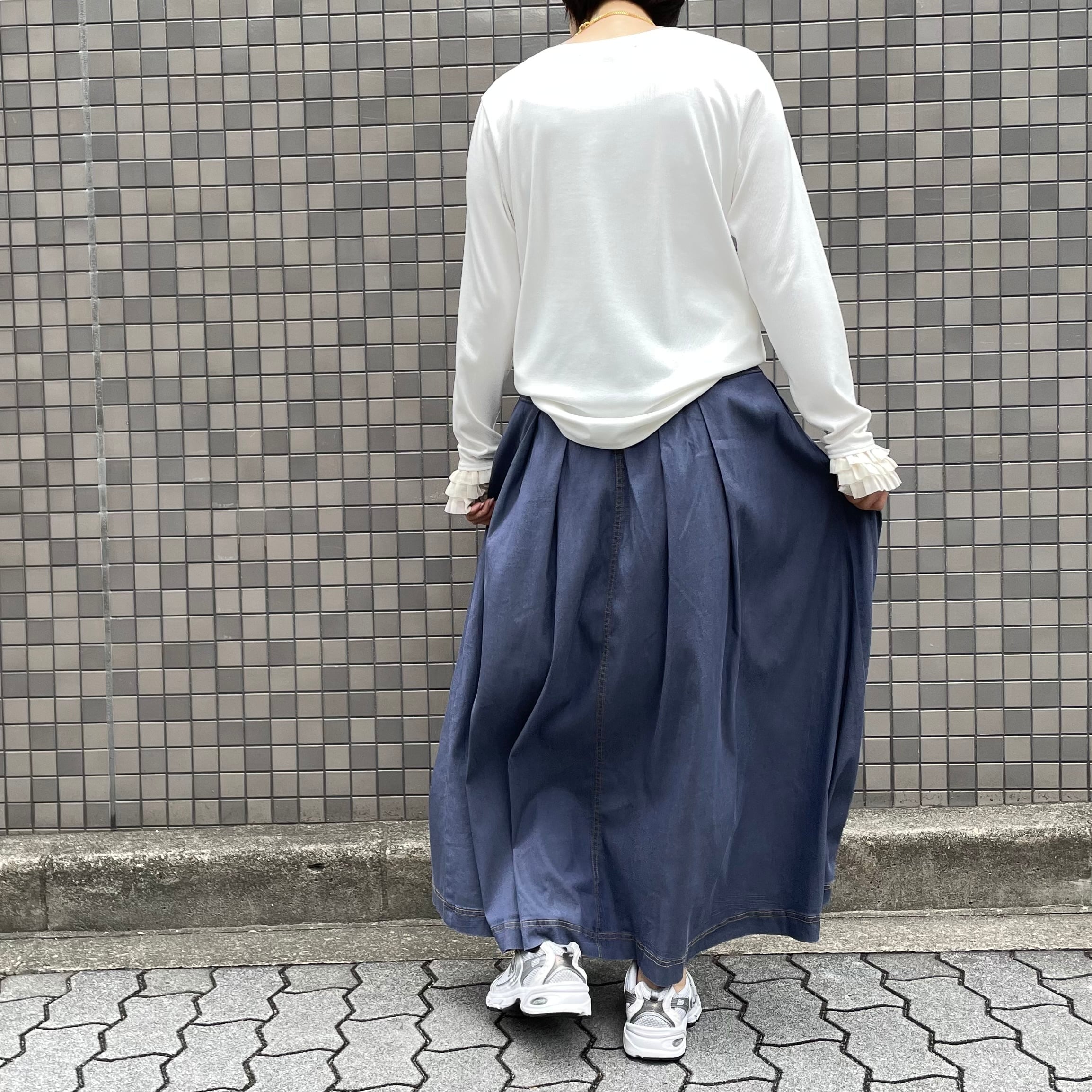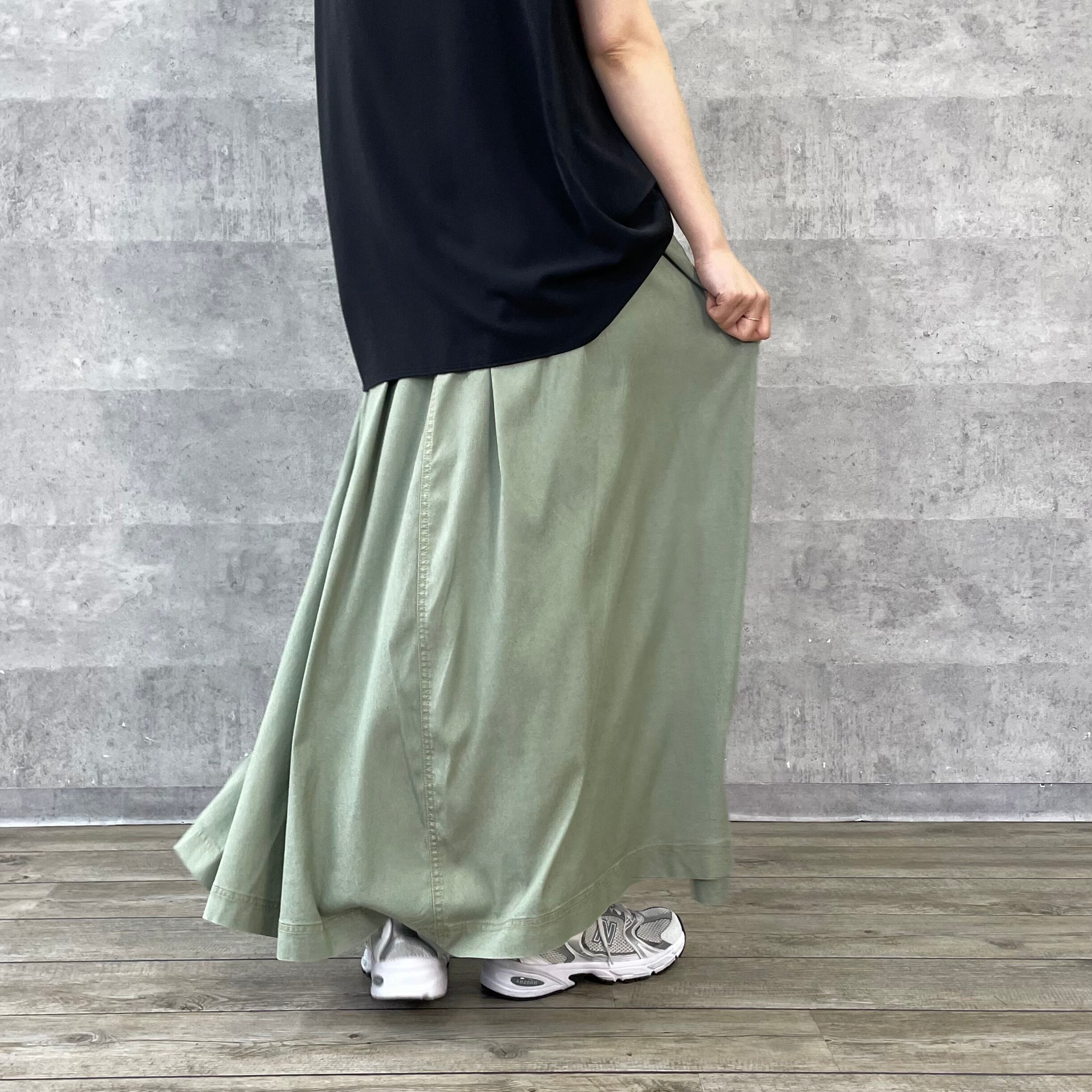洗い加工でカジュアルダウンさせているのできれいすぎないロングスカートのコーディネートにぴったりです