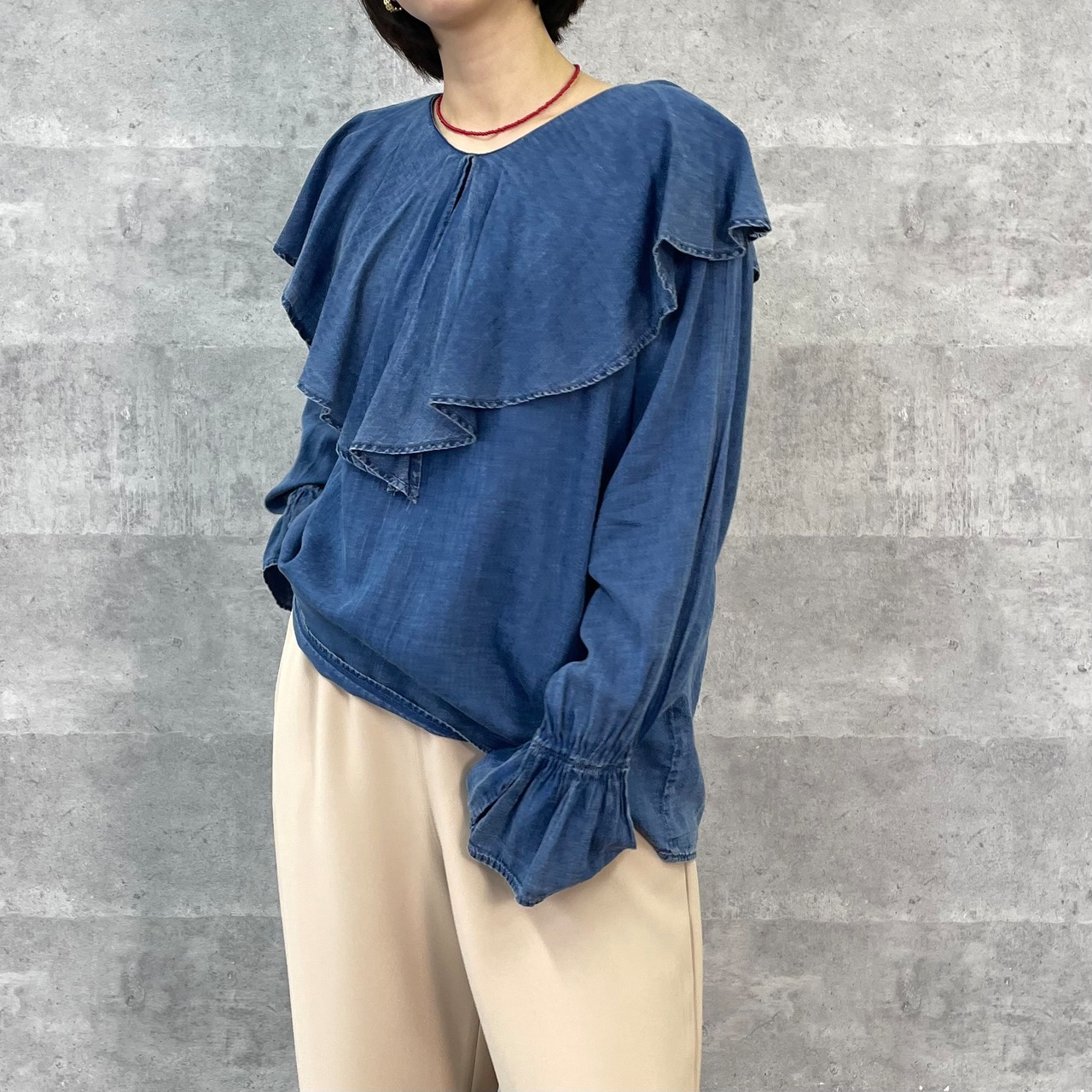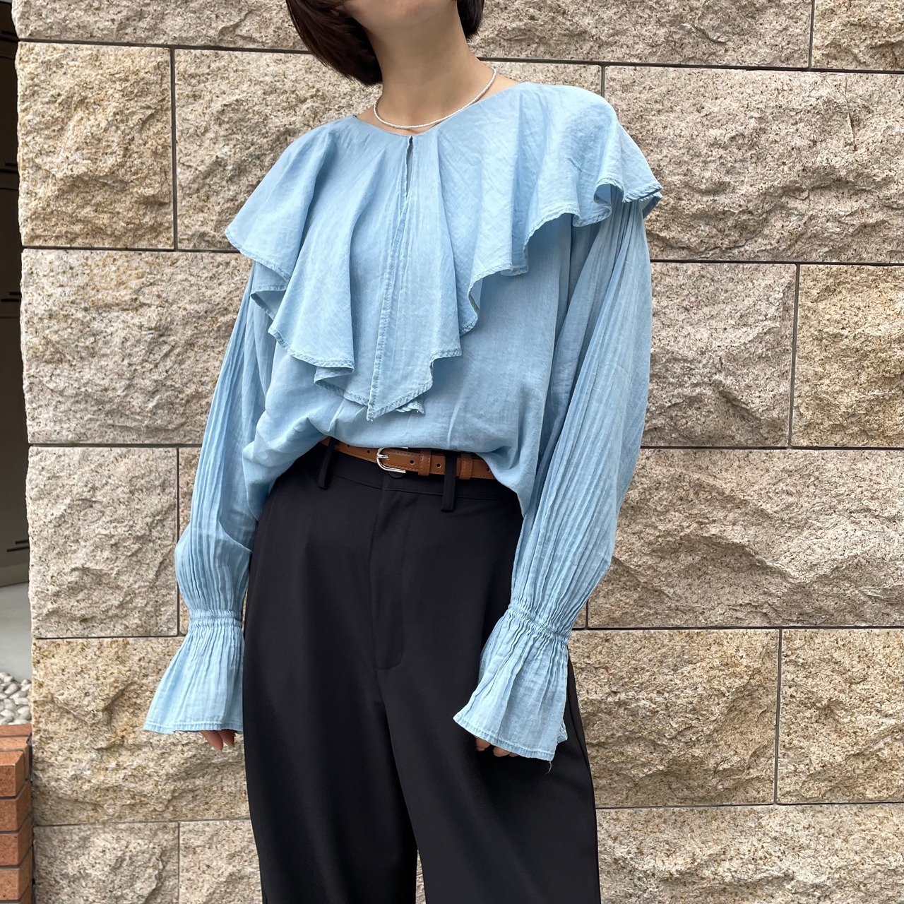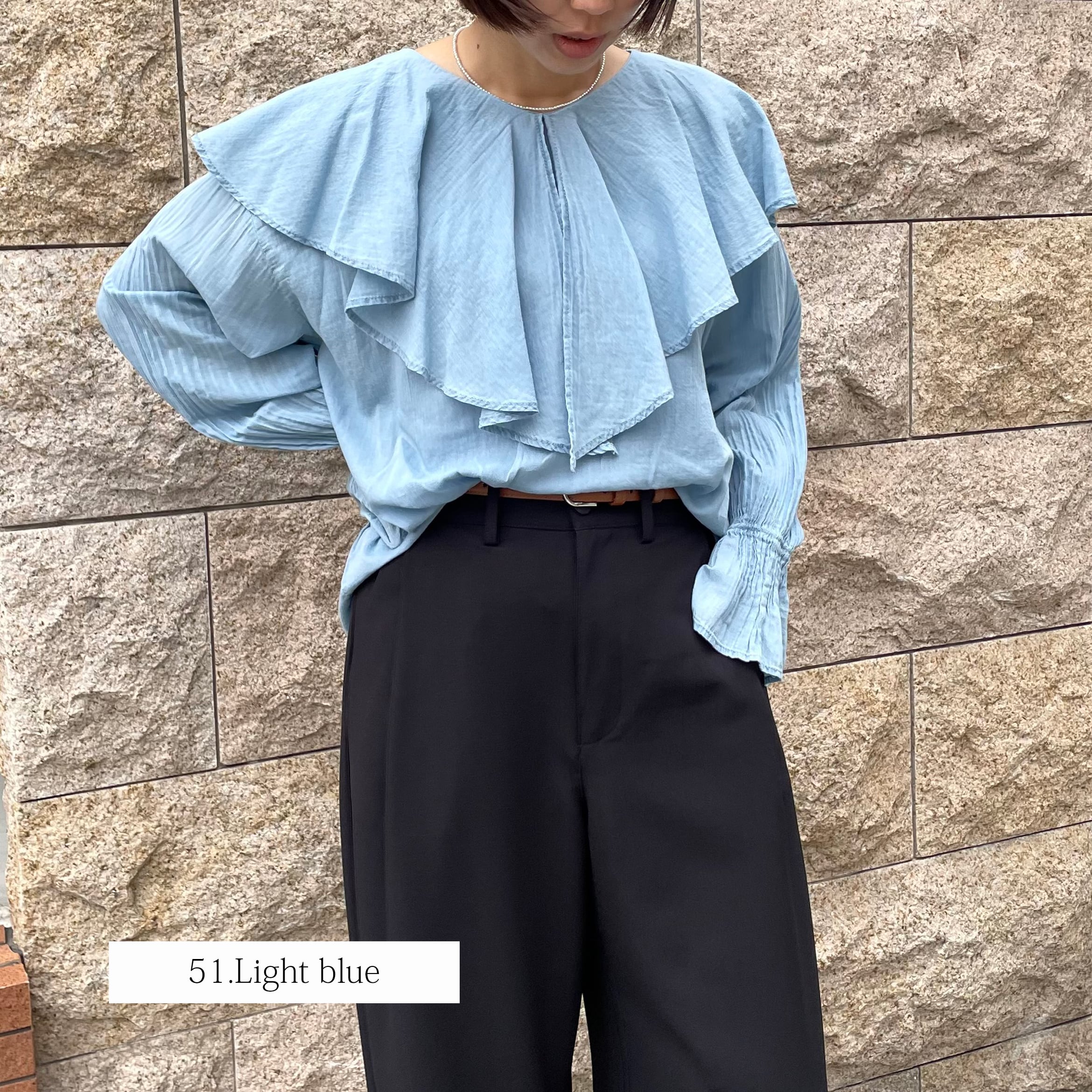 ラッフルカラーが印象的なブラウス