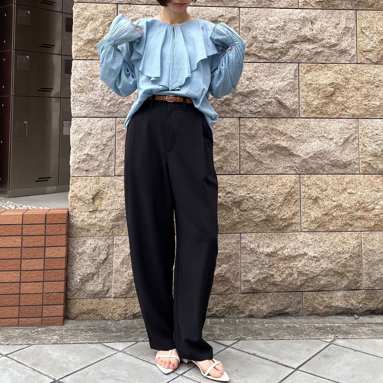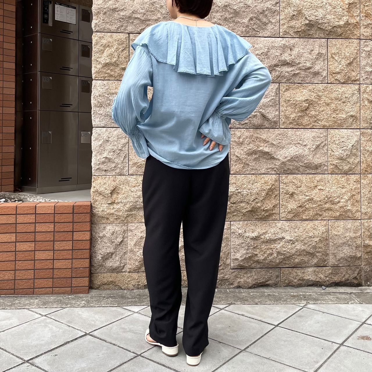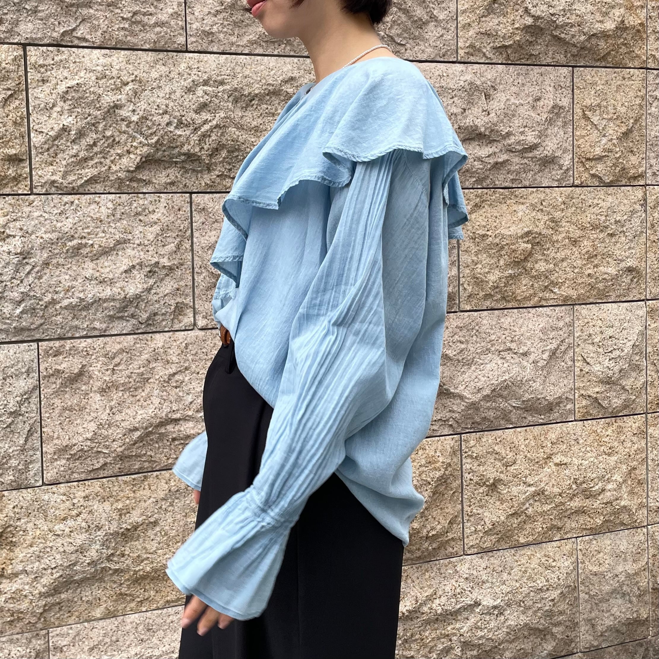 ラッフルカラーが印象的なブラウス