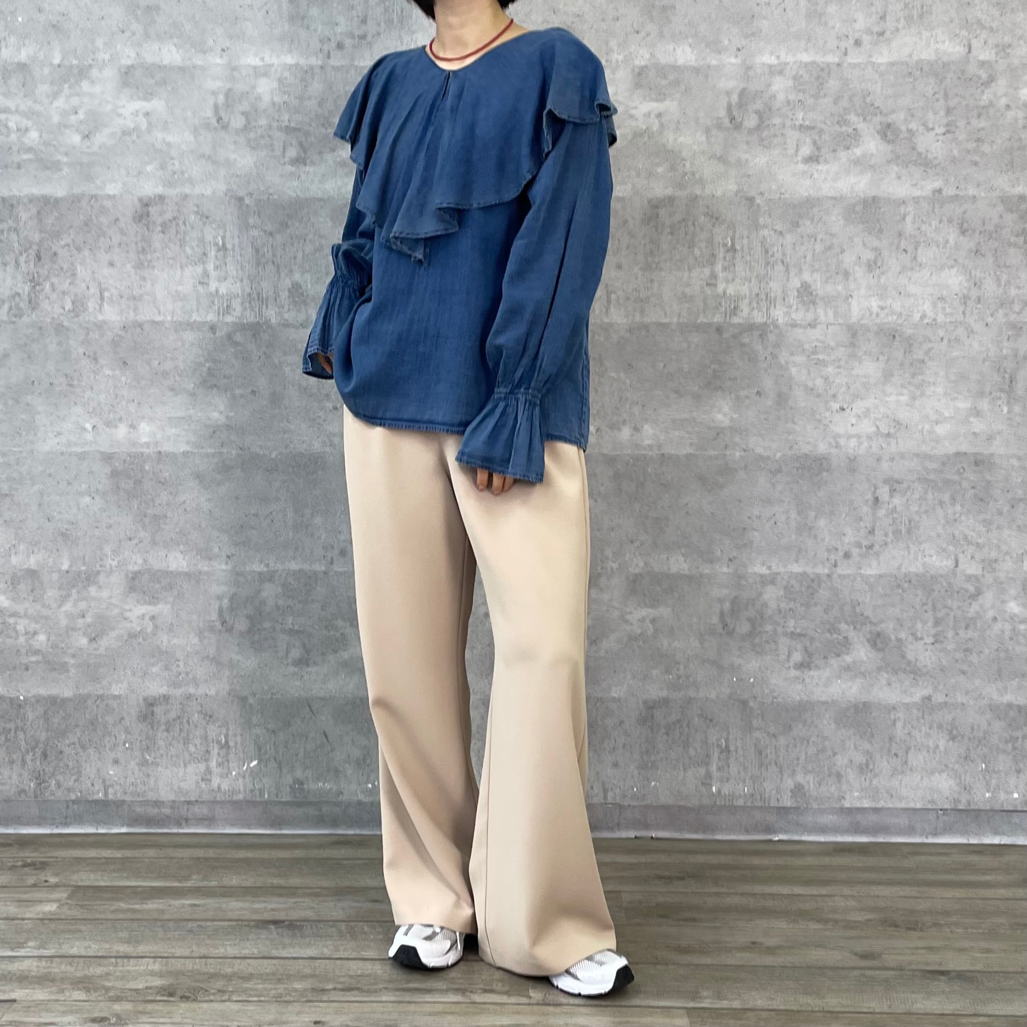 カジュアルなボトムとのスタイリングは程よく女性らしさを足して頂けます